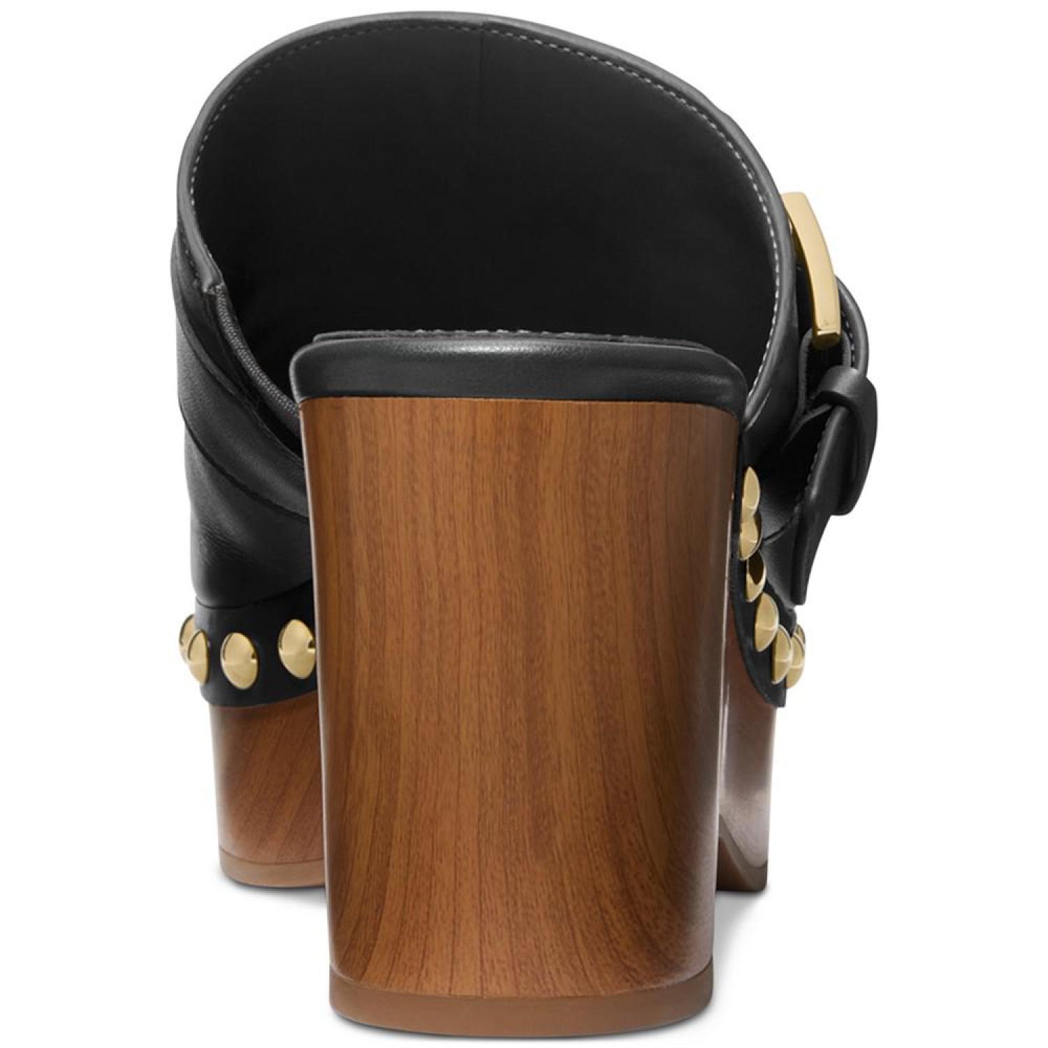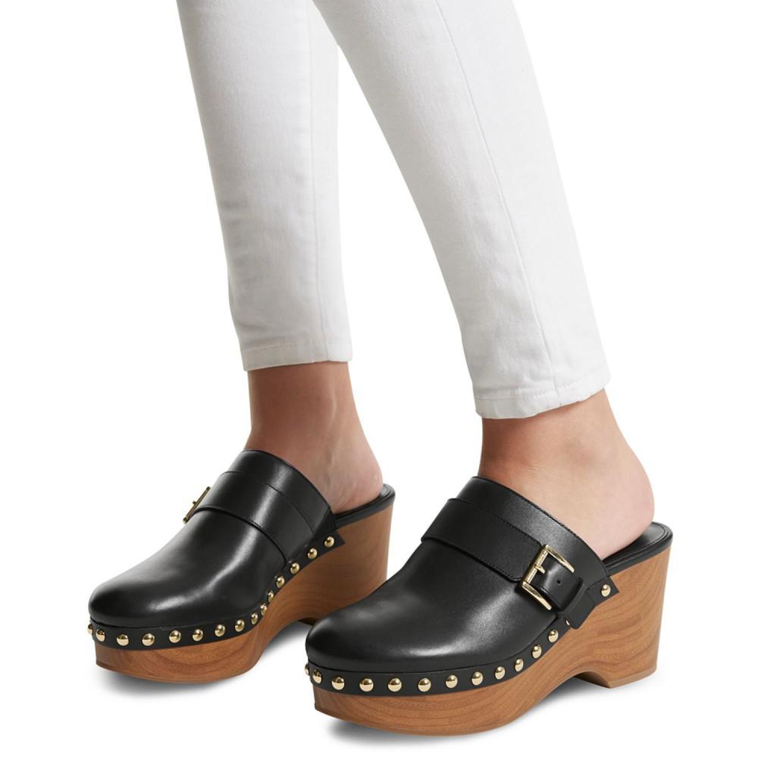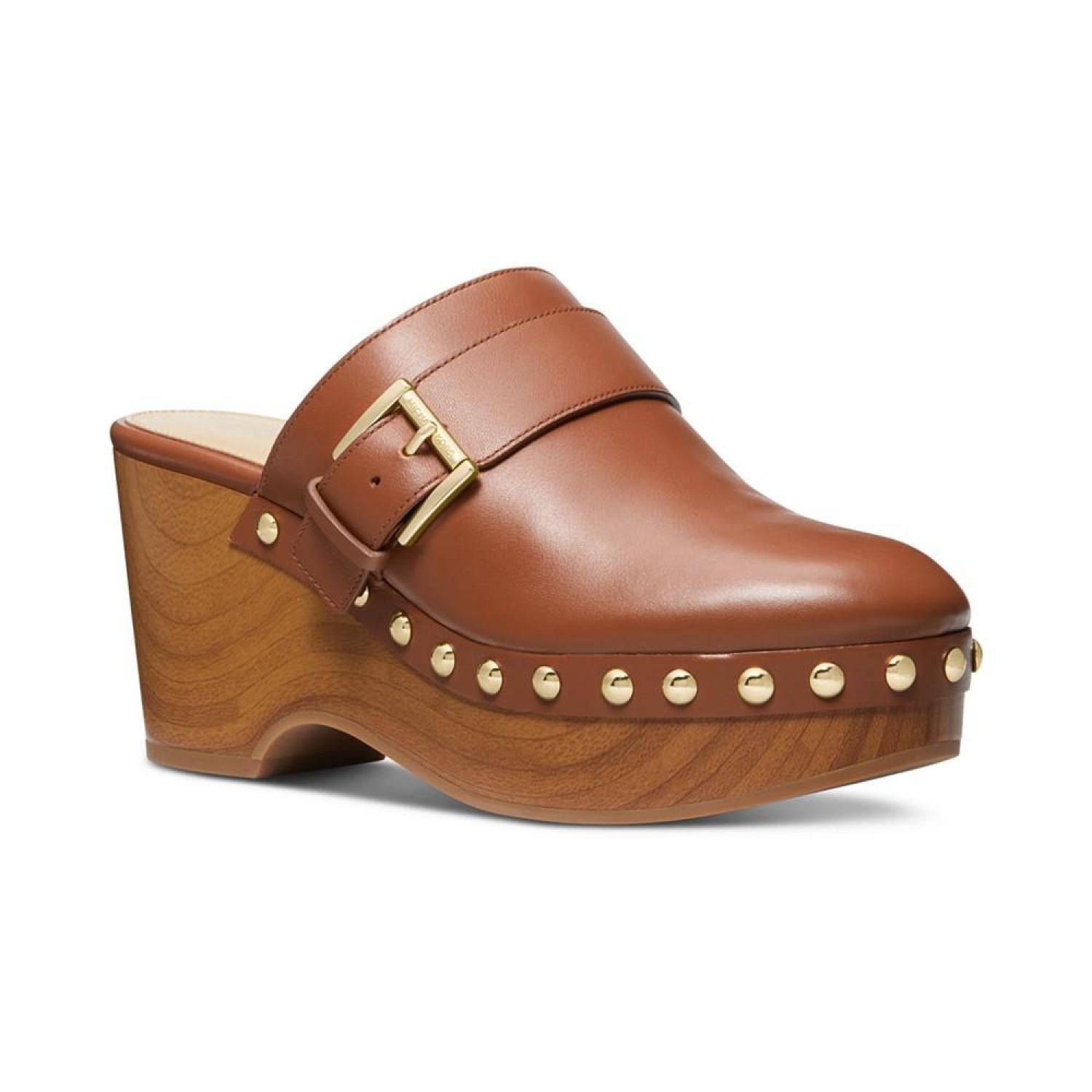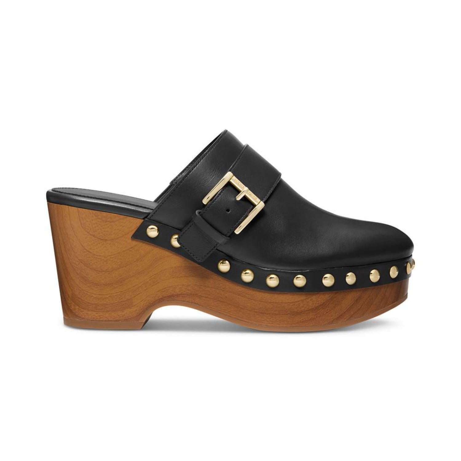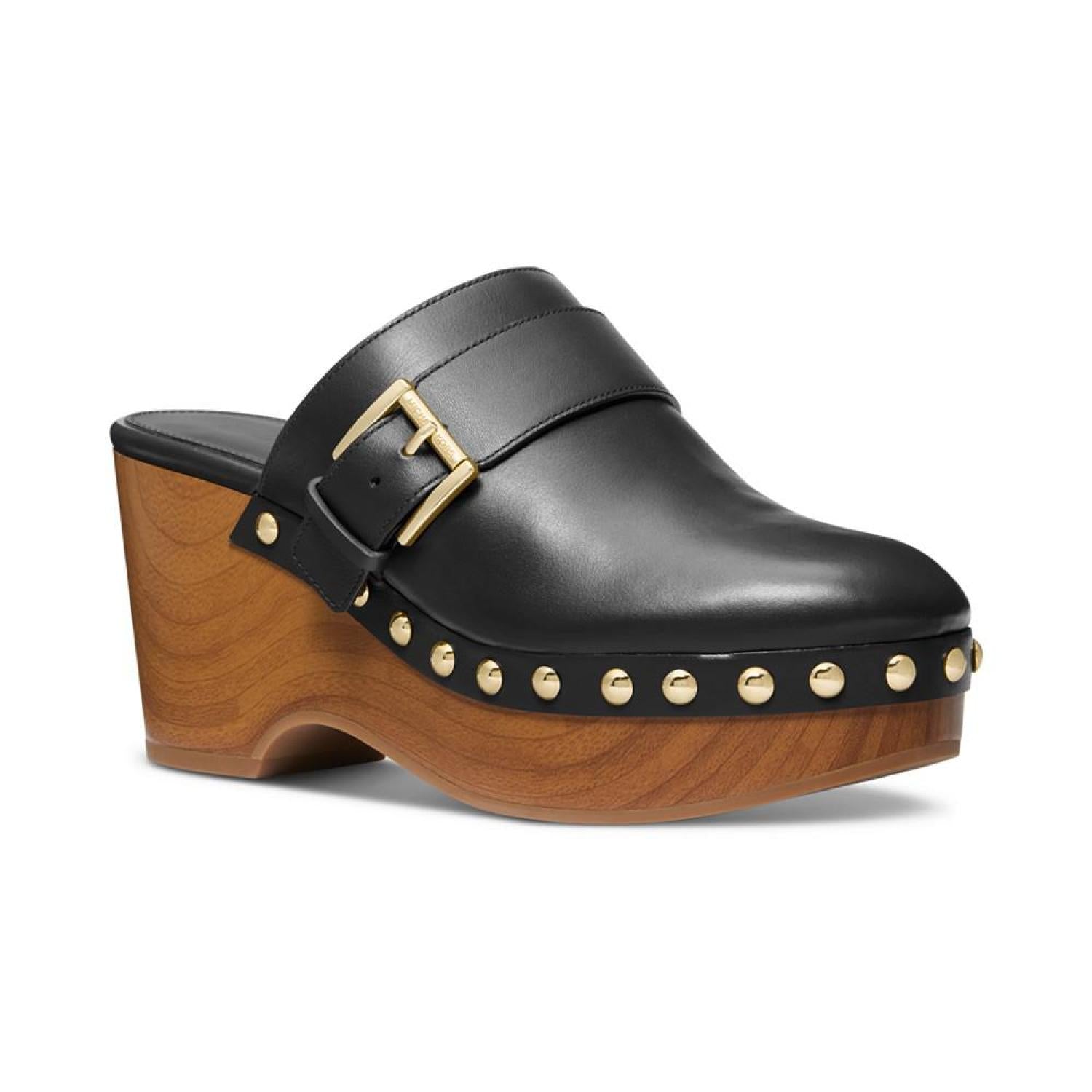 Wood-like platforms and studs pair with buckled straps for a retro-inspired finish in the Rye clogs from MICHAEL Michael Kors. 3" heel; 1" platform Round toe Slip on Buckled strap detail; studding at platform Leather upper; manmade lining; rubber sole Imported