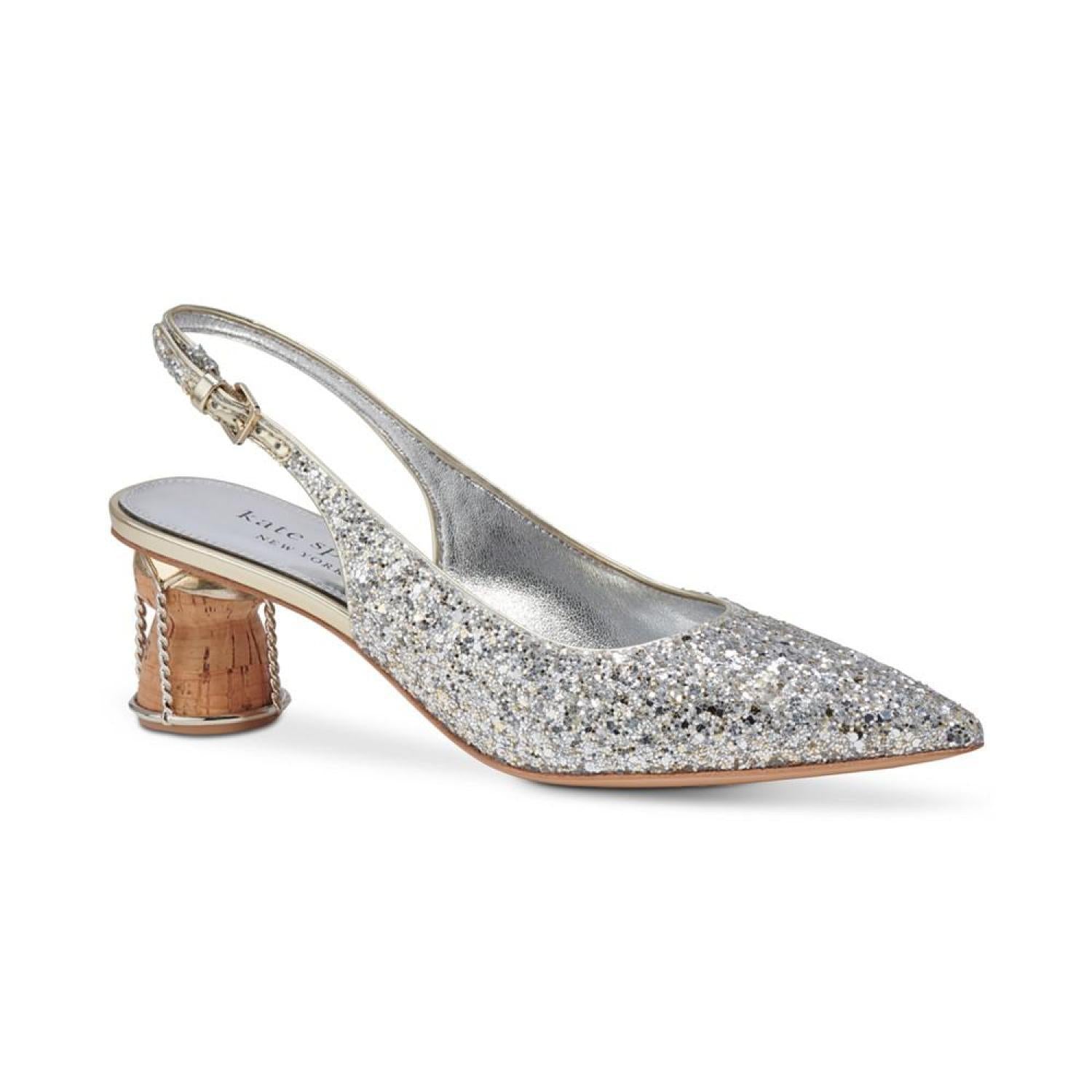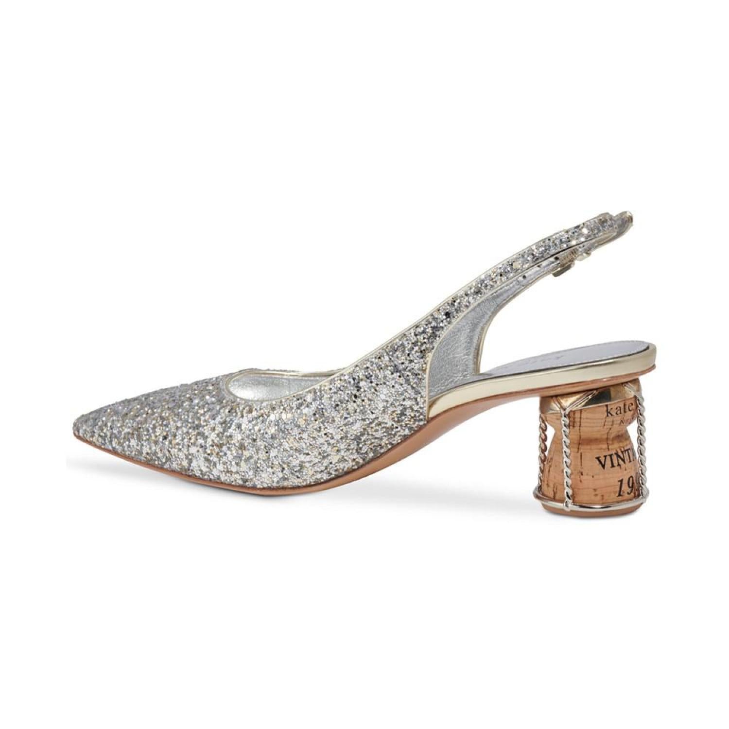 Posted on champagne corks for fun effect, the Soiree pumps from Kate Spade New York add bubbly lift to dressy looks. 1-1/2" sculpted block heel Pointed-toe slip-on slingback pumps with adjustable buckle closure Leather upper; leather/fabric lining; leather sole Imported