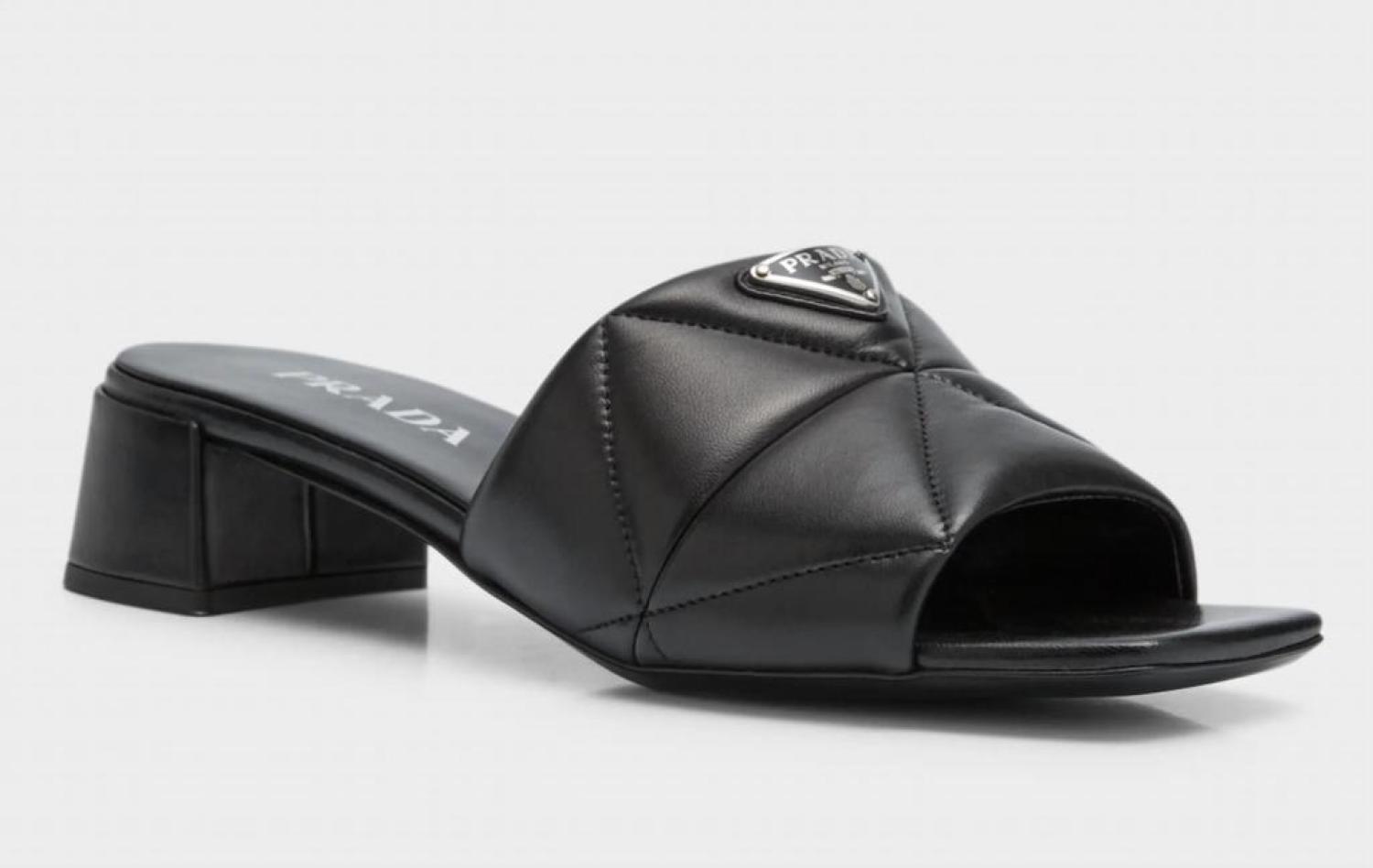 • The perfect height for day to night.Prada quilted leather sandals with logo triangle accent. 1.38 in / 35 mm block heel. Open toe. Wide band upper. Slide style. Leather outsole. Lining - Leather. Professional cleaning recommended. Made in Italy