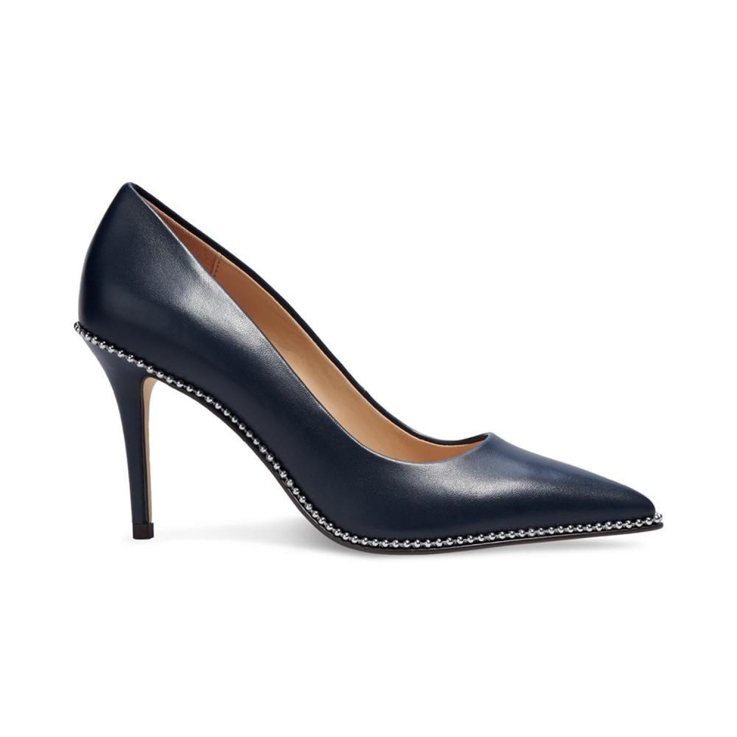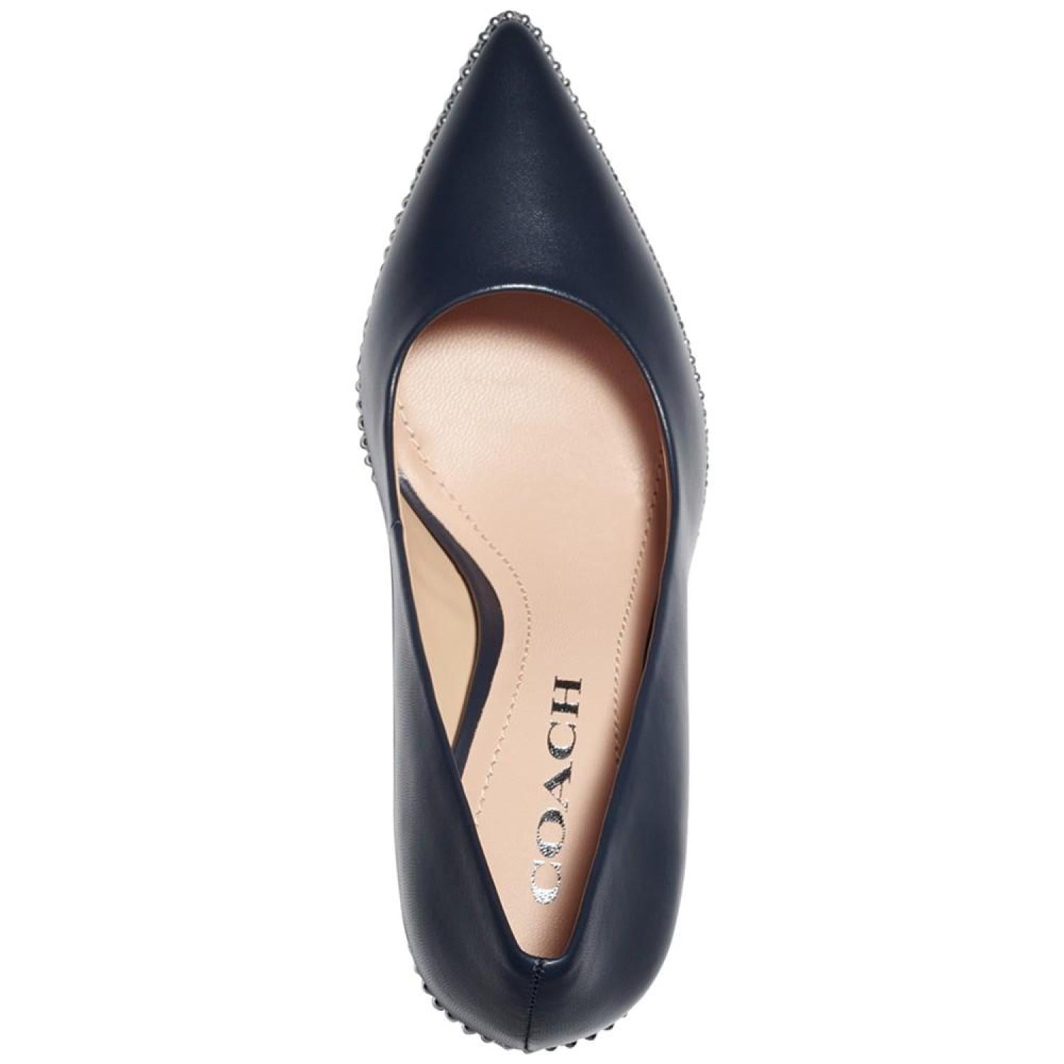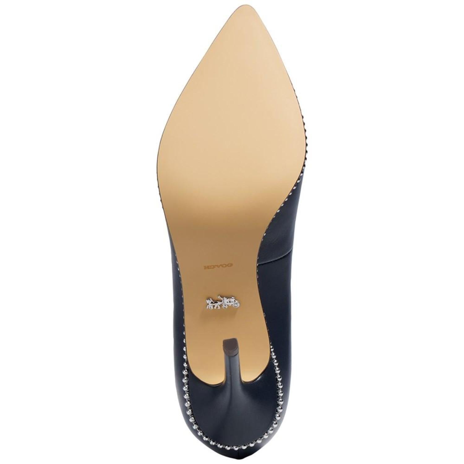 COACH updates the classic pointed-toe profile of the Waverly pumps with a hint of metallic flash in beaded chain platform detailing. 3-1/3" stiletto heel Round-toe slip-on pumps Beaded studding at welt Leather, suede, calf hair, or manmade upper; leather sole Imported