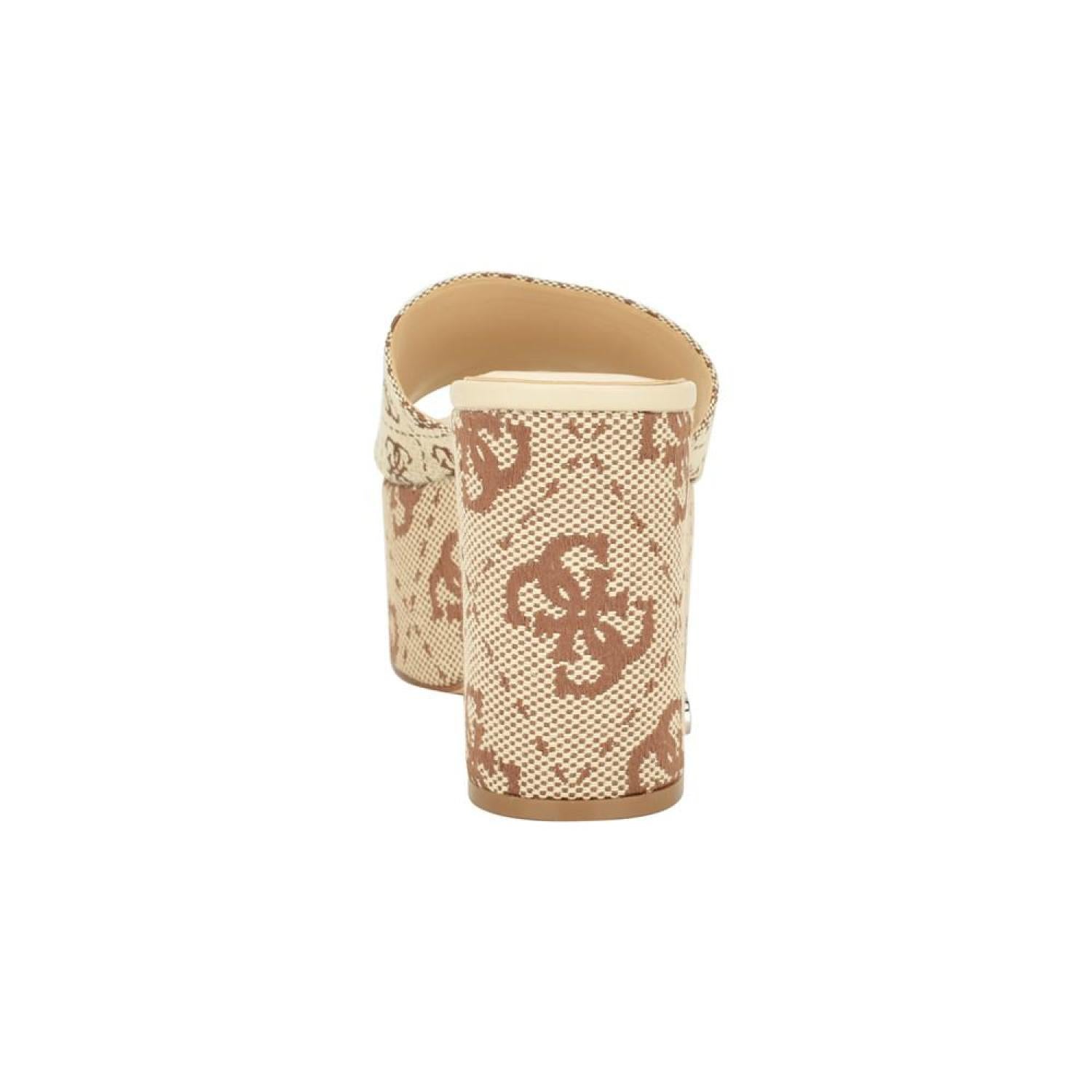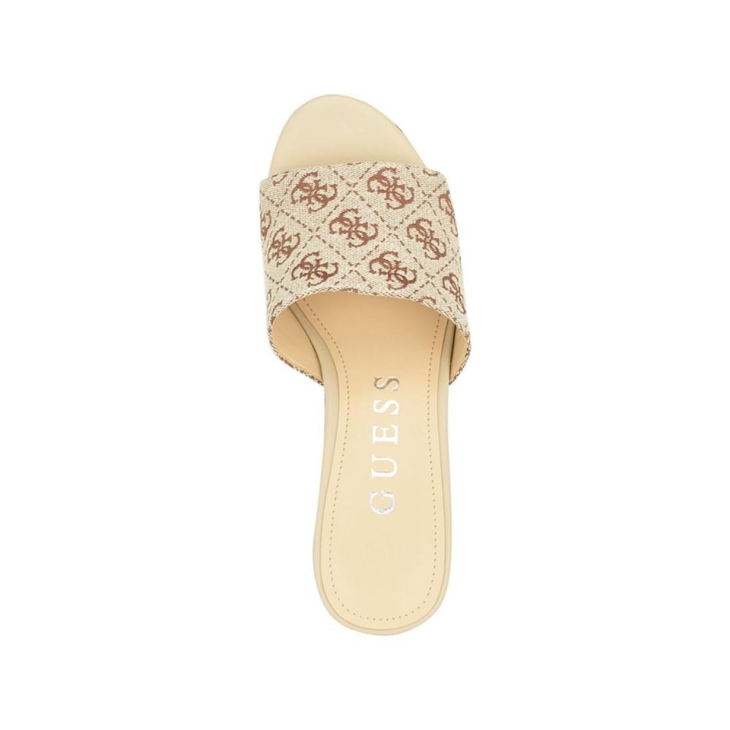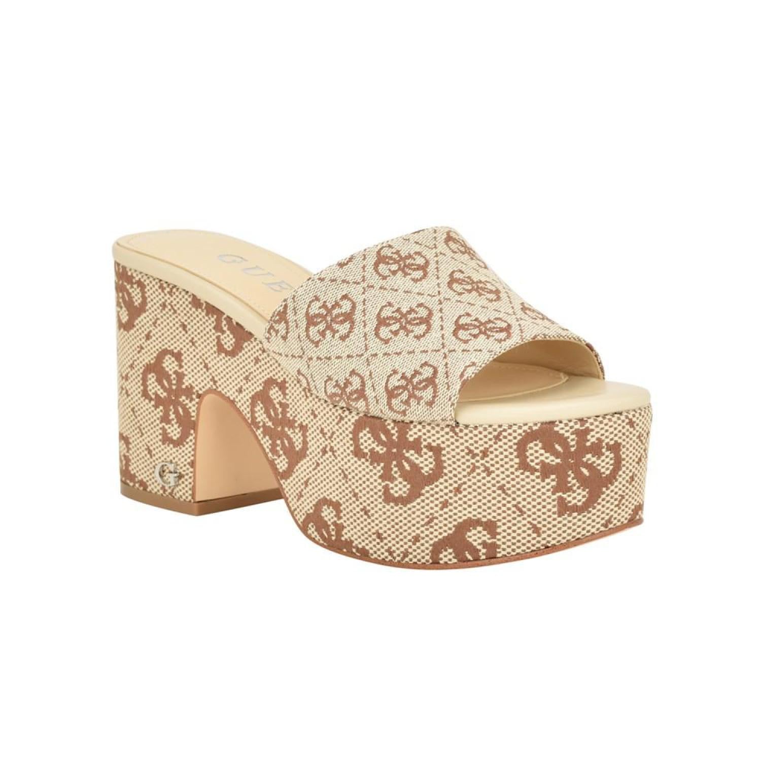 The GUESS Yapplea classic platform will take you from day to night. The one band slide platform sandal features woven jacquard fabric to subtly standout. Established. 1981, GUESS is a global lifestyle brand and a symbol of a young, adventurous lifestyle. 3.54" block, covered heel, platform height - 2.17" Shoe width - medium Slip-on closure Textile upper, manmade lining, manmade sole Almond, open toe Textile Spot Clean Imported