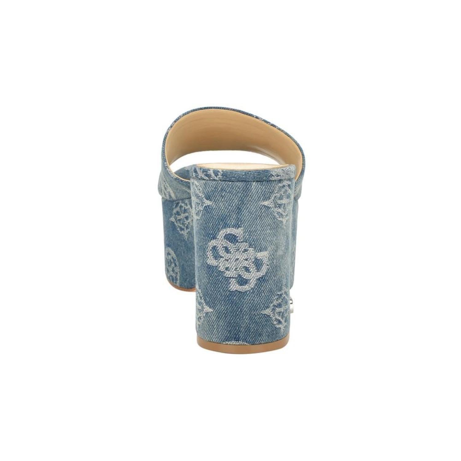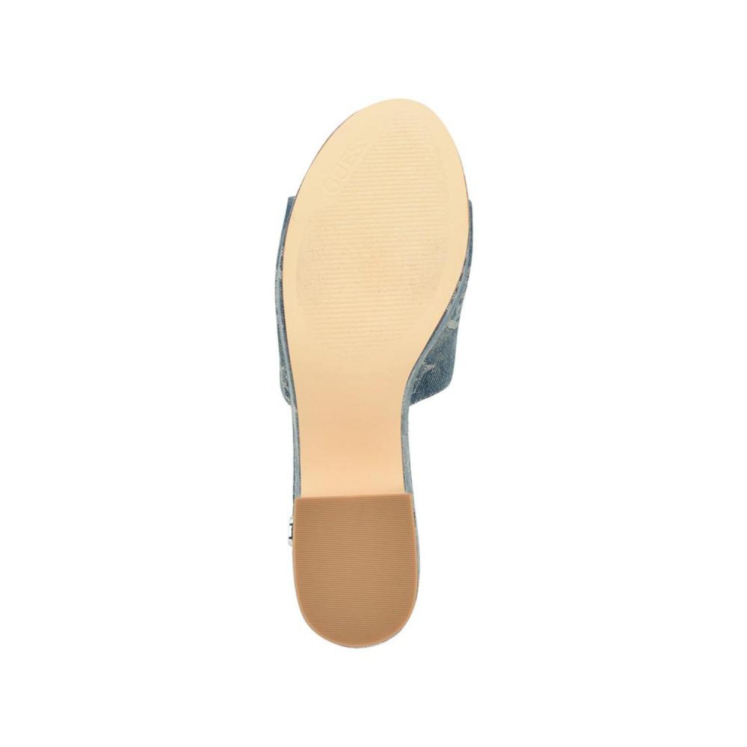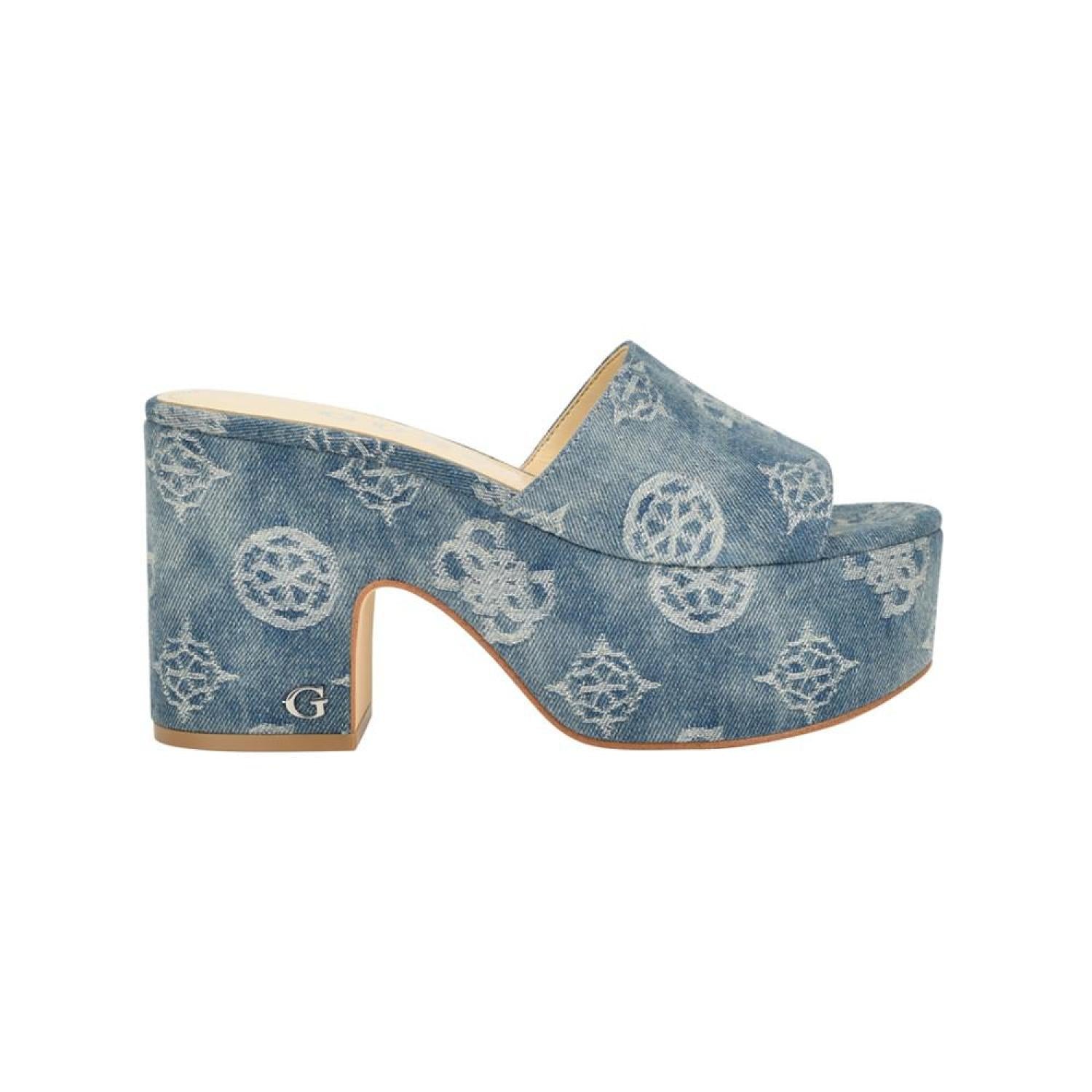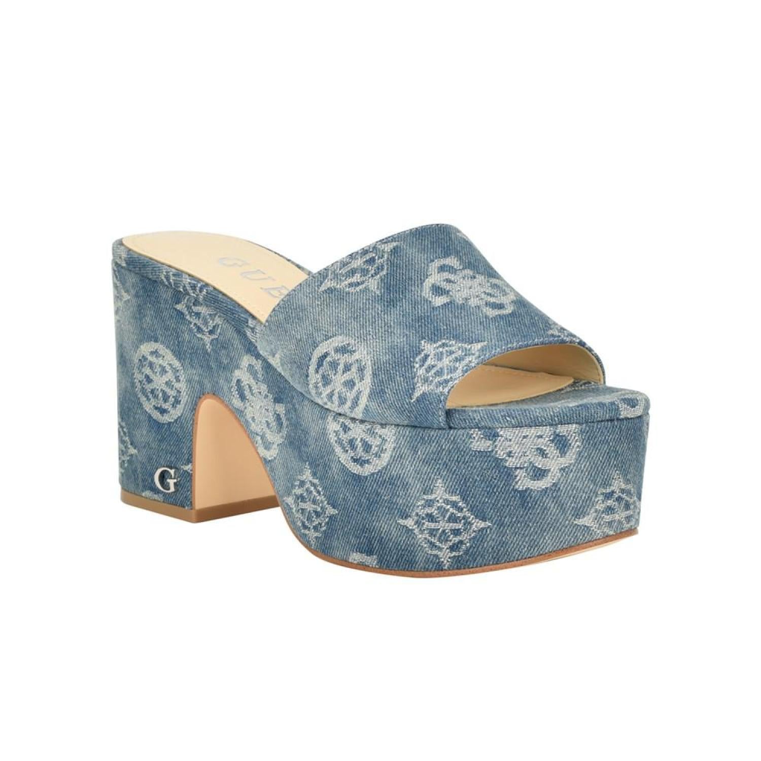 The GUESS Yapplea classic platform will take you from day to night. The one band slide platform sandal features woven jacquard fabric to subtly standout. Established. 1981, GUESS is a global lifestyle brand and a symbol of a young, adventurous lifestyle. 3.54" block, covered heel, platform height - 2.17" Shoe width - medium Slip-on closure Textile upper, manmade lining, manmade sole Almond, open toe Textile Spot Clean Imported