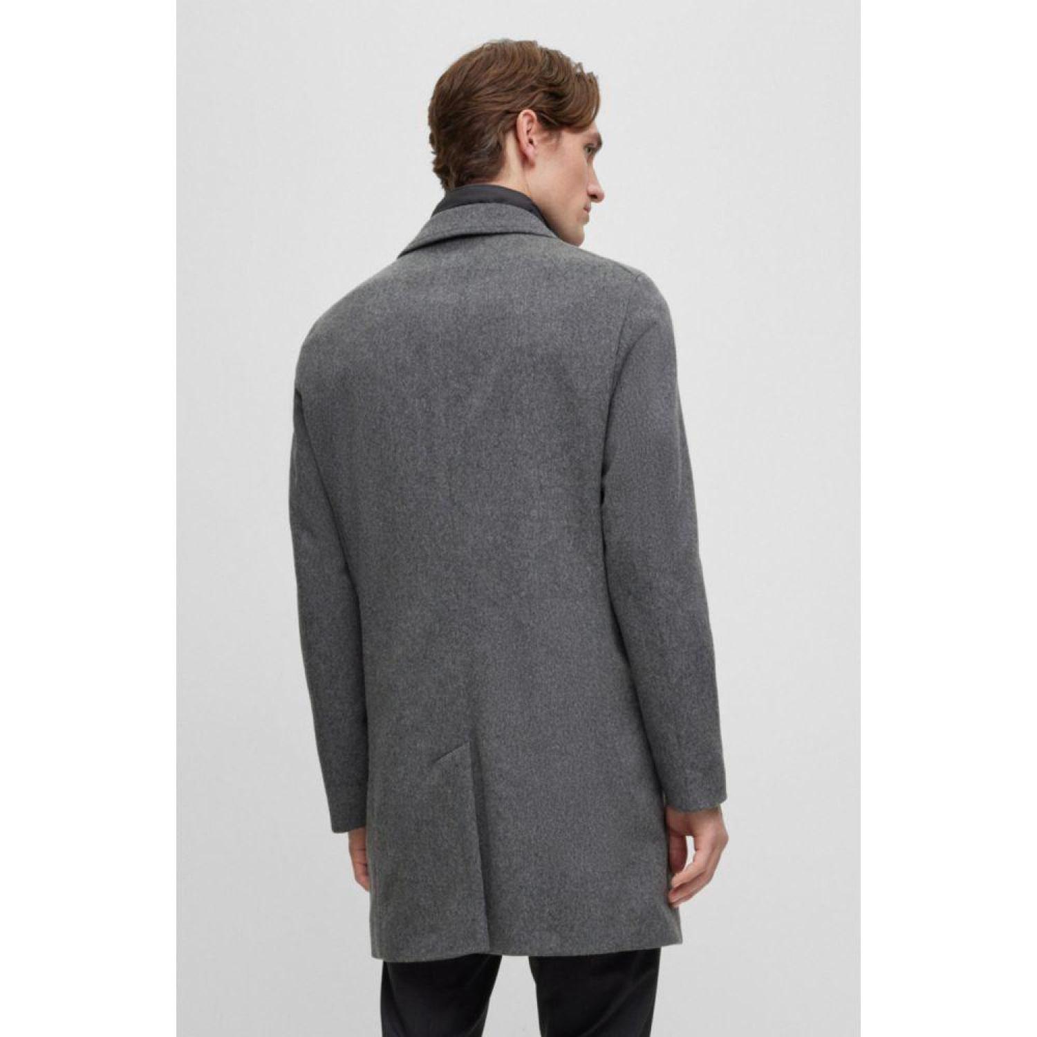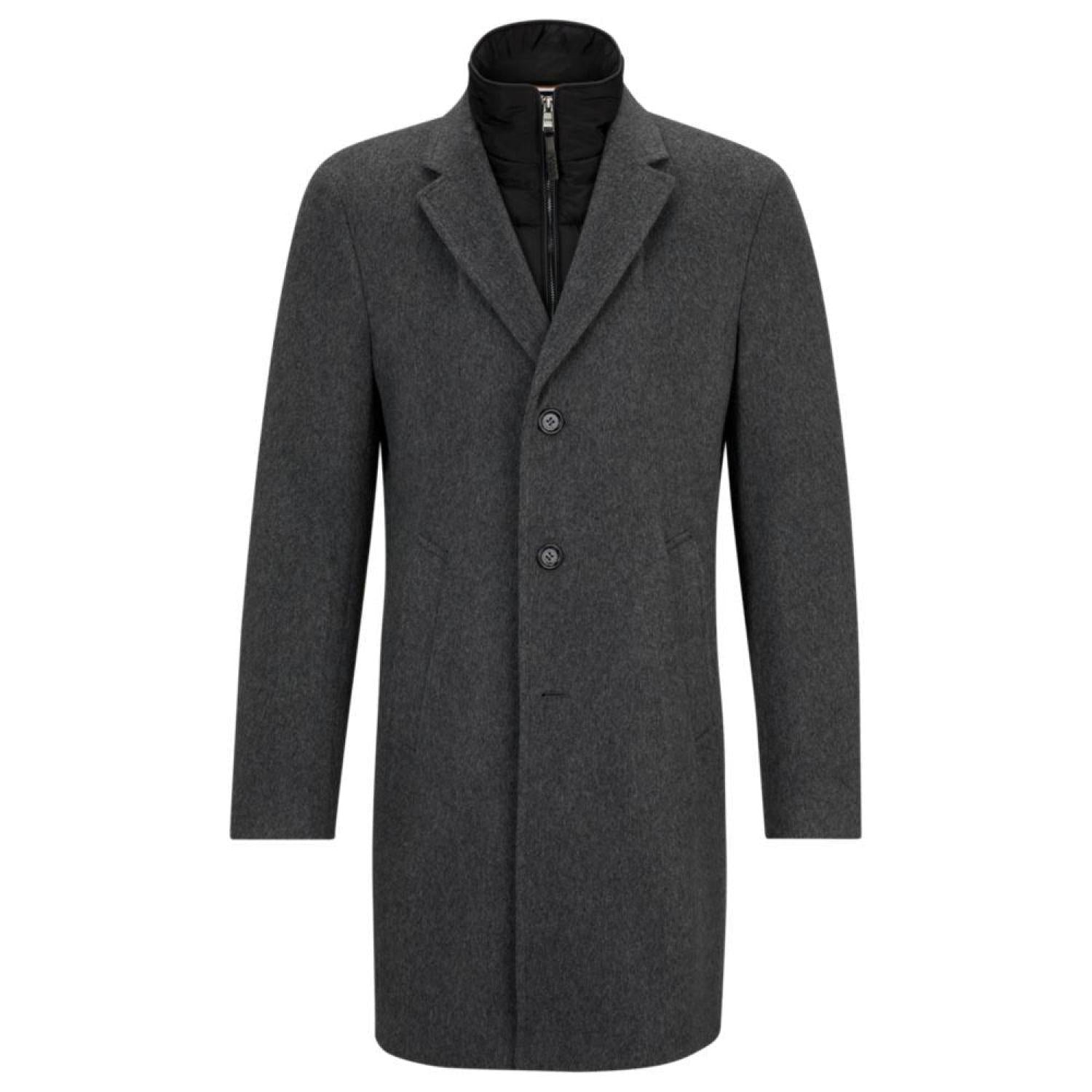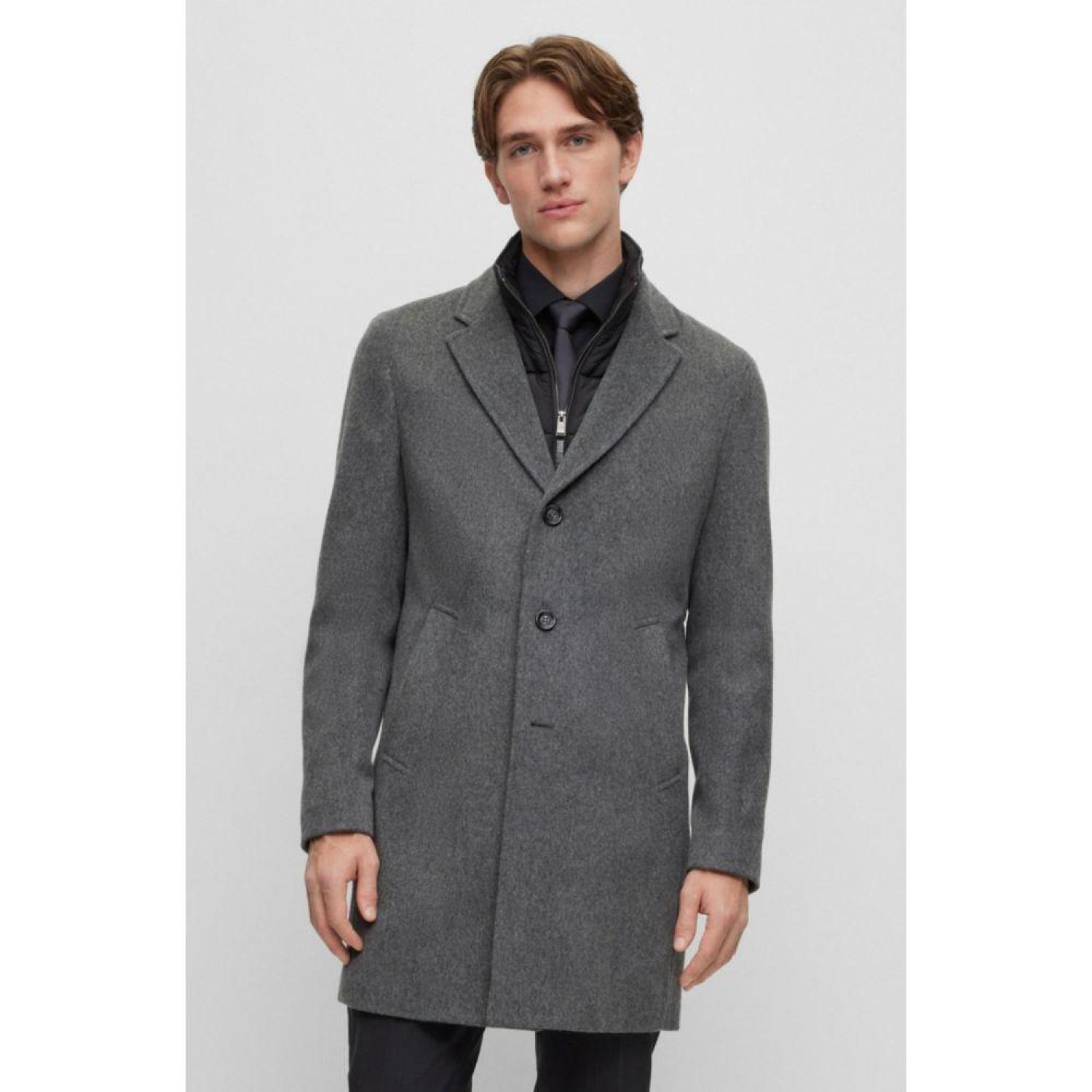 A fully lined coat cut to a slim fit in wool-rich material with a zip-up waistcoat by BOSS Menswear.