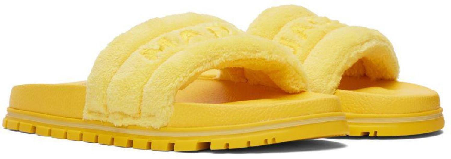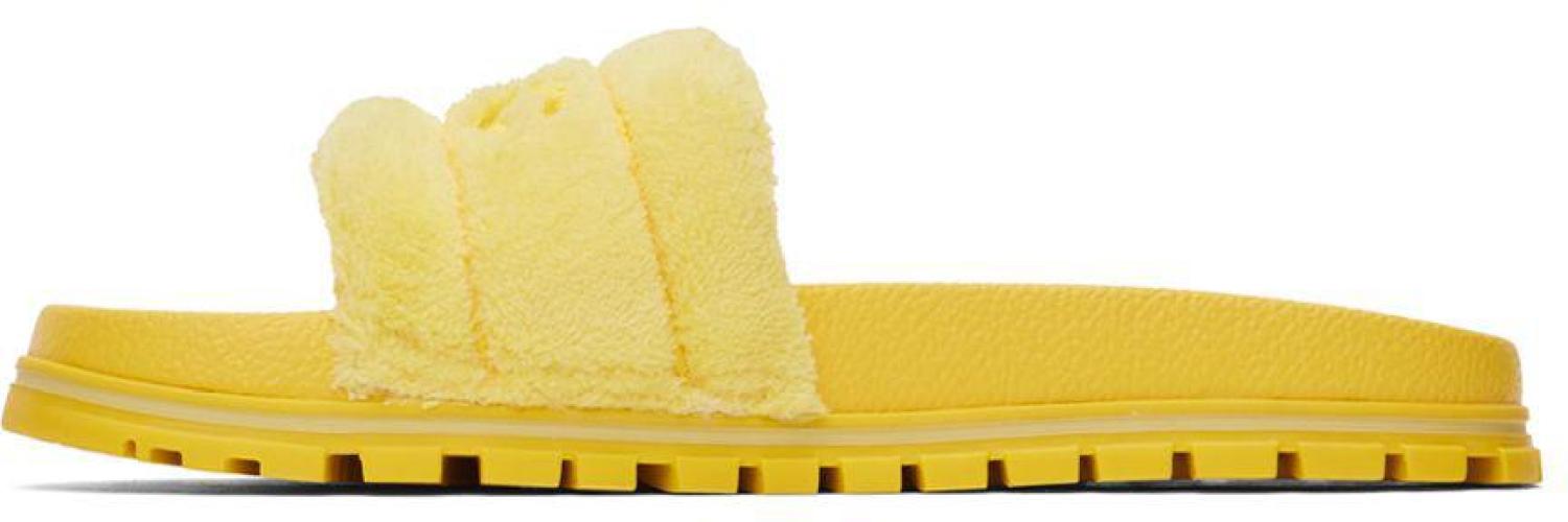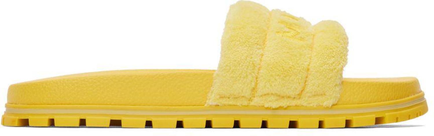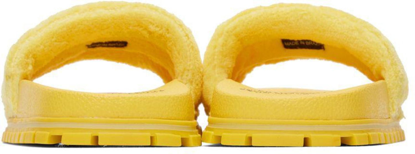 Marc Jacobs Yellow 'The Terry Slide' Sandals Rubber slip-on sandals in yellow. · Terrycloth strap at vamp with embroidered logo · Logo printed at molded footbed · Treaded rubber sole Supplier color: Golden kiwi Upper: leather, rubber. Sole: rubber. Made in Brazil. 222190F124003