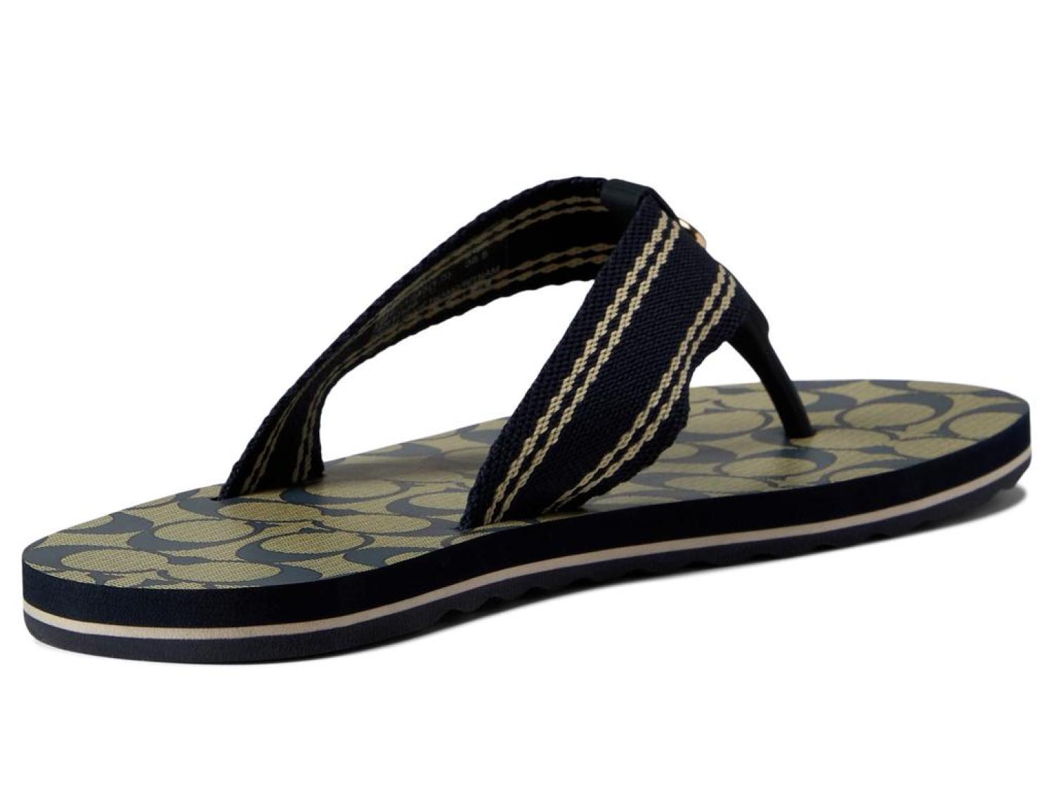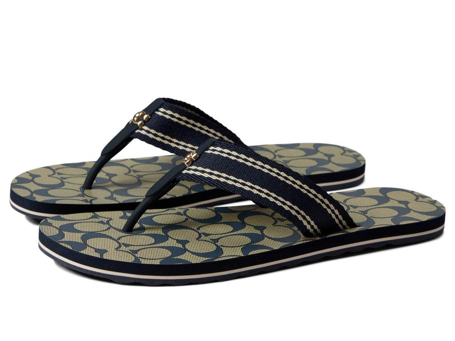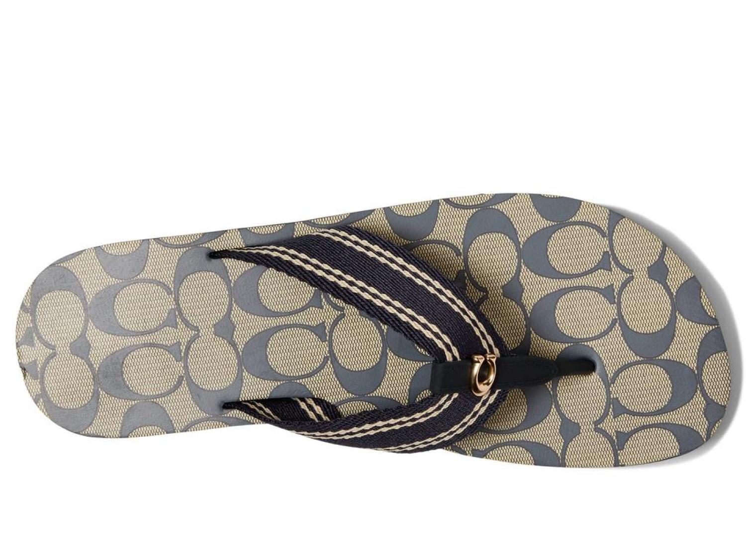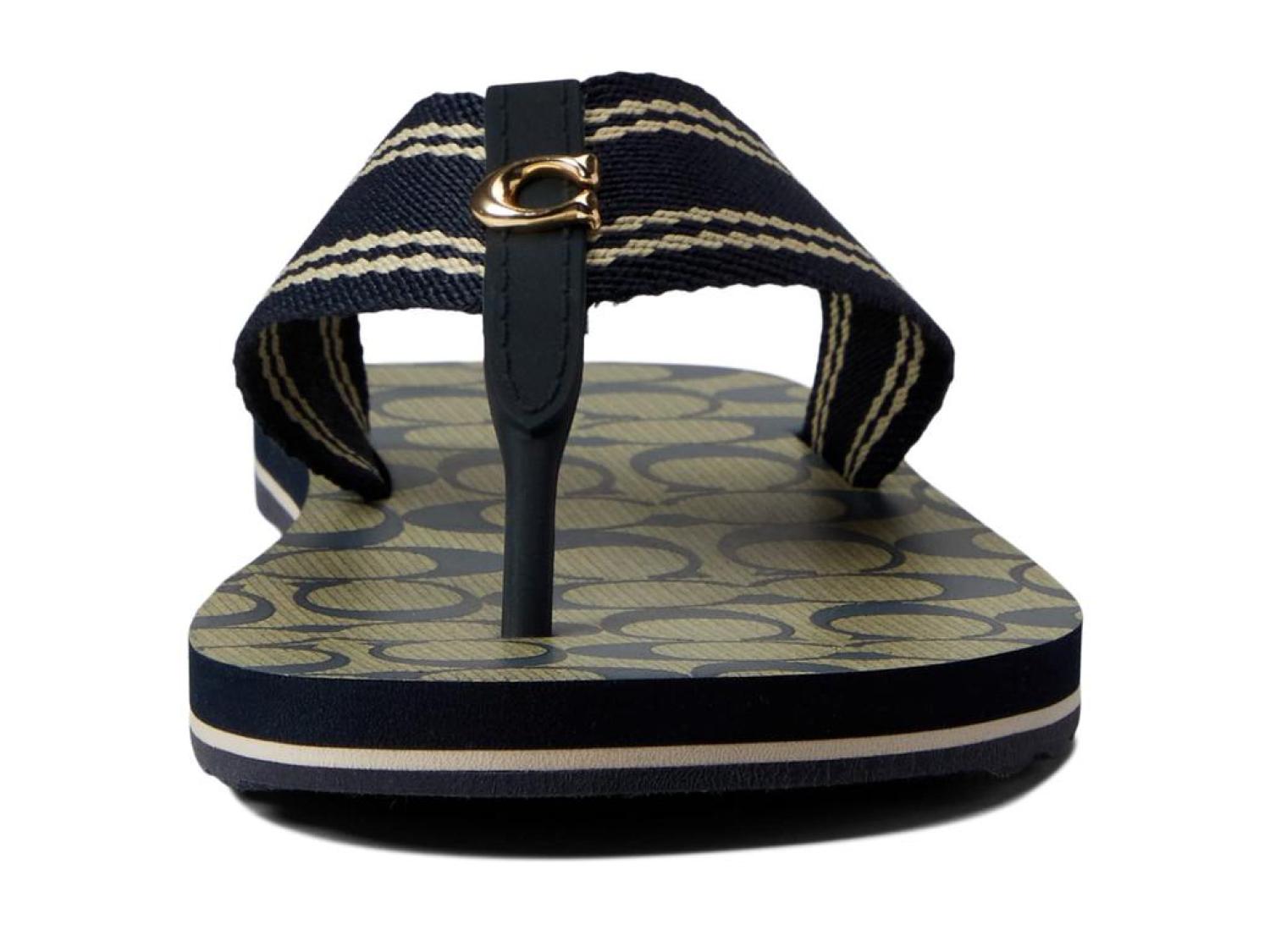 Please Note: COACH™ items cannot be shipped to military addresses (APO or FPO) and addresses in Hawaii, the Virgin Islands, Guam or any other locations outside of the continental US. The Zoe Flip-Flop by COACH® offers that streamlined design with that classic COACH appeal. Grab a pair for your everyday go-to on those warm weather days. Wide canvas straps showcasing gold-toned COACH initial for that subtle pop. Slip-on style. Contrast printed COACH pattern on footbed. EVA lining with rubber outsole. Upper and lining made of textile material. Insole and outsole made of synthetic material. Imported. Product measurements were taken using size 9, width B - Medium. Please note that measurements may vary by size. Weight of footwear is based on a single item, not a pair. Measurements: Weight: 5 oz-
