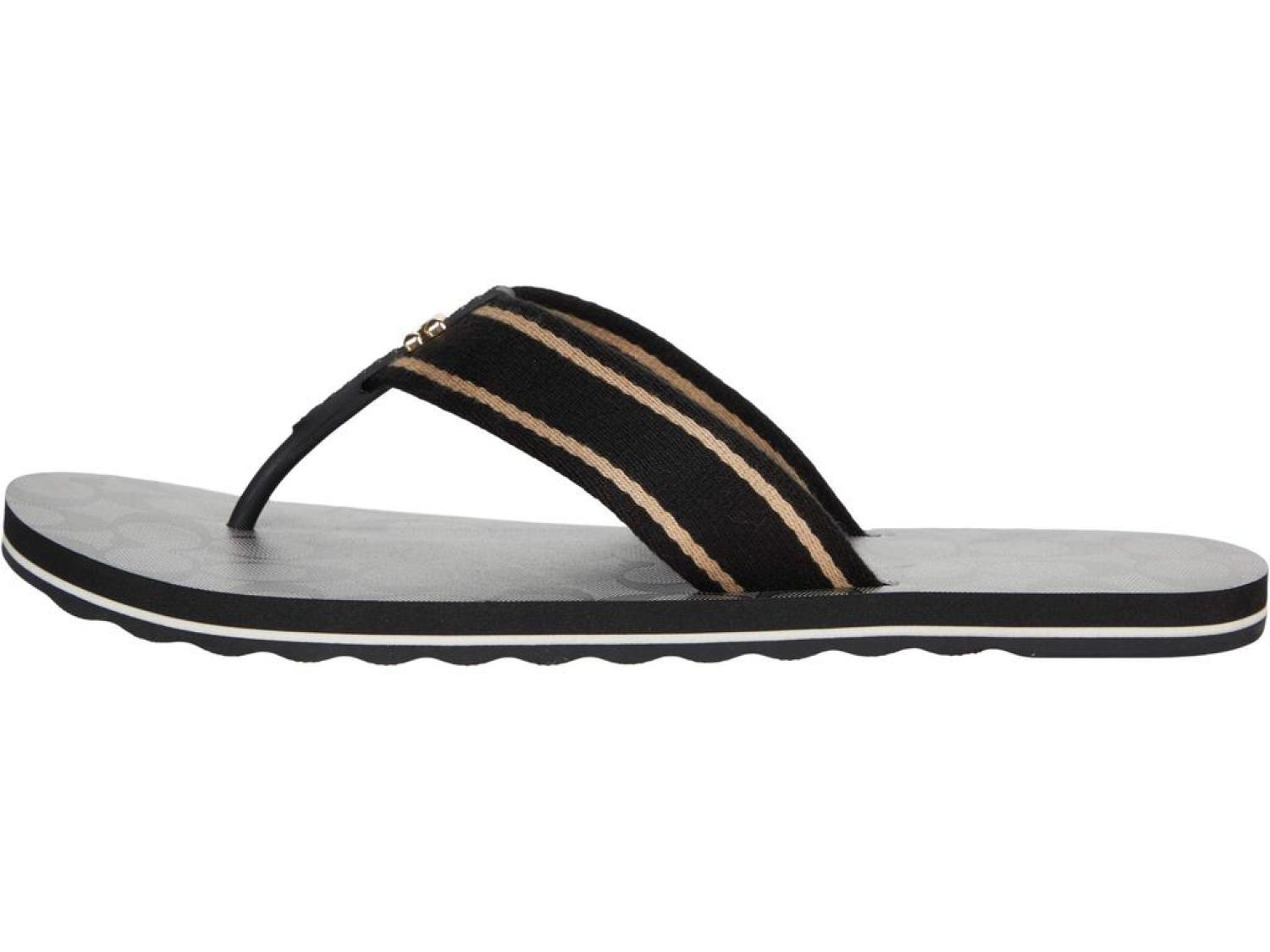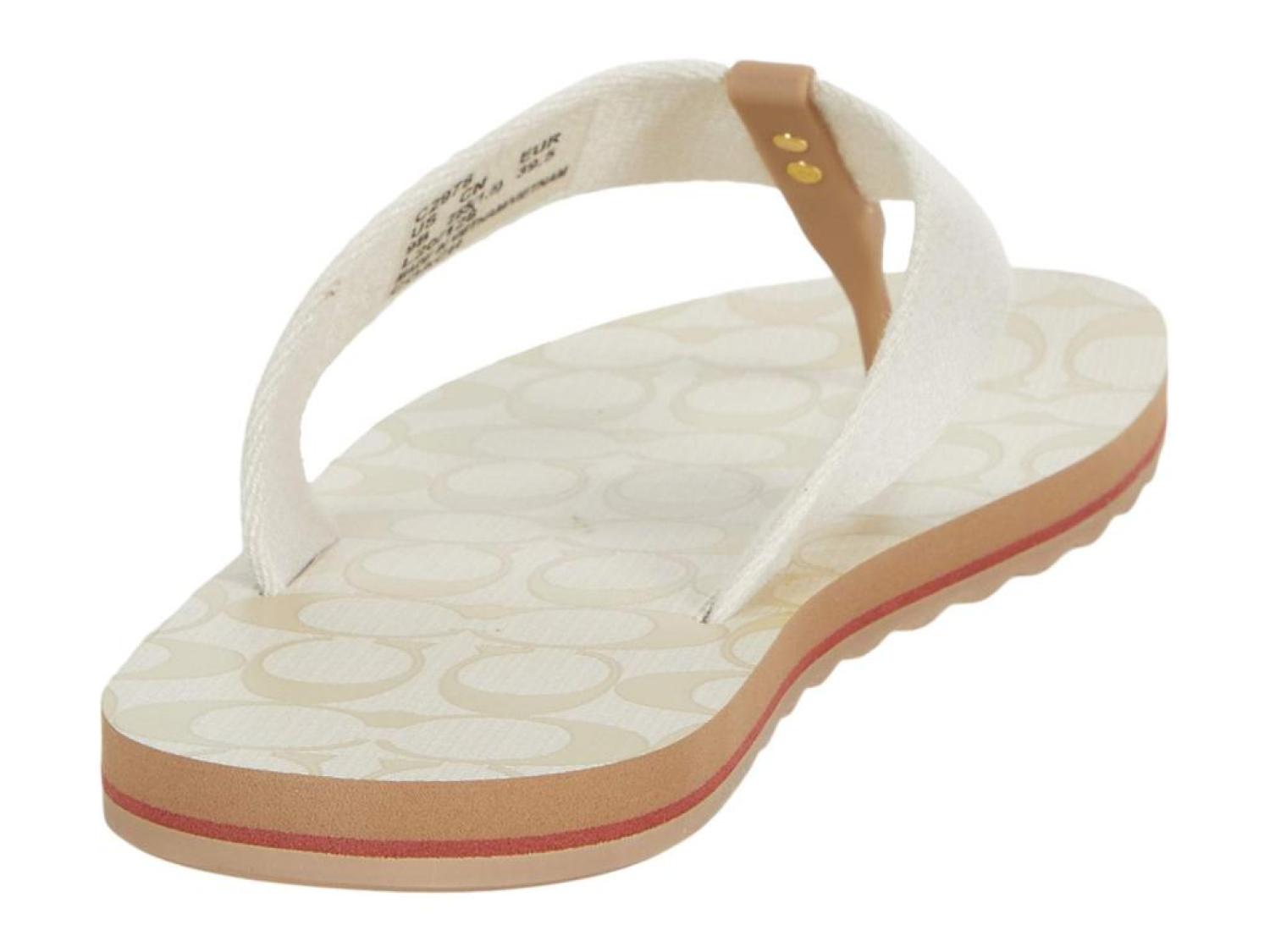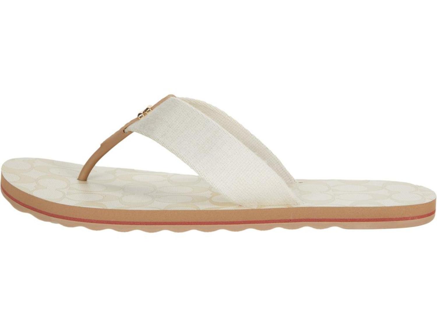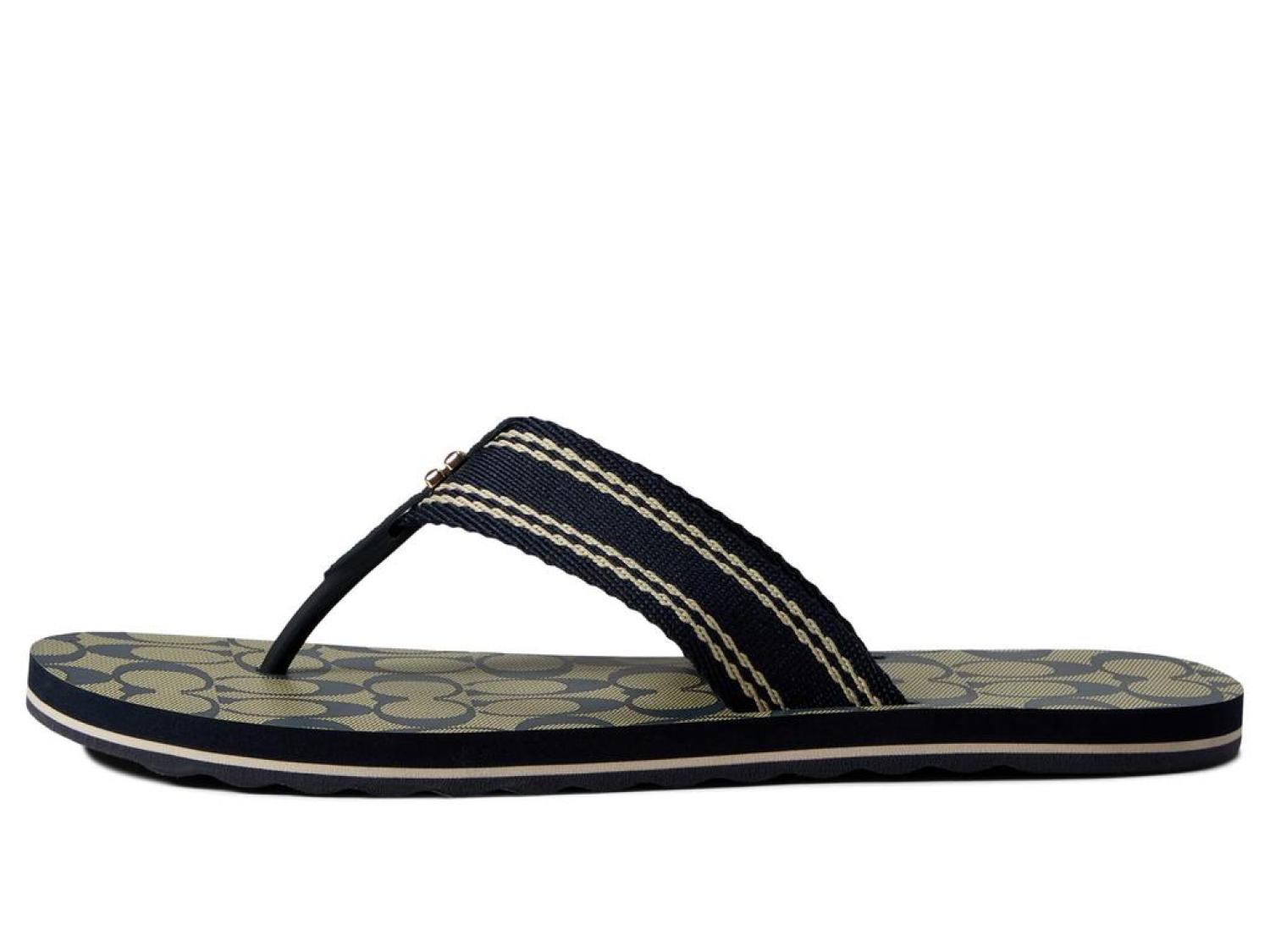 Please Note: COACH™ items cannot be shipped to military addresses (APO or FPO) and addresses in Hawaii, the Virgin Islands, Guam or any other locations outside of the continental US. The Zoe Flip-Flop by COACH® offers that streamlined design with that classic COACH appeal. Grab a pair for your everyday go-to on those warm weather days. Wide canvas straps showcasing gold-toned COACH initial for that subtle pop. Slip-on style. Contrast printed COACH pattern on footbed. EVA lining with rubber outsole. Upper and lining made of textile material. Insole and outsole made of synthetic material. Imported. Product measurements were taken using size 9, width B - Medium. Please note that measurements may vary by size. Weight of footwear is based on a single item, not a pair. Measurements: Weight: 5 oz-