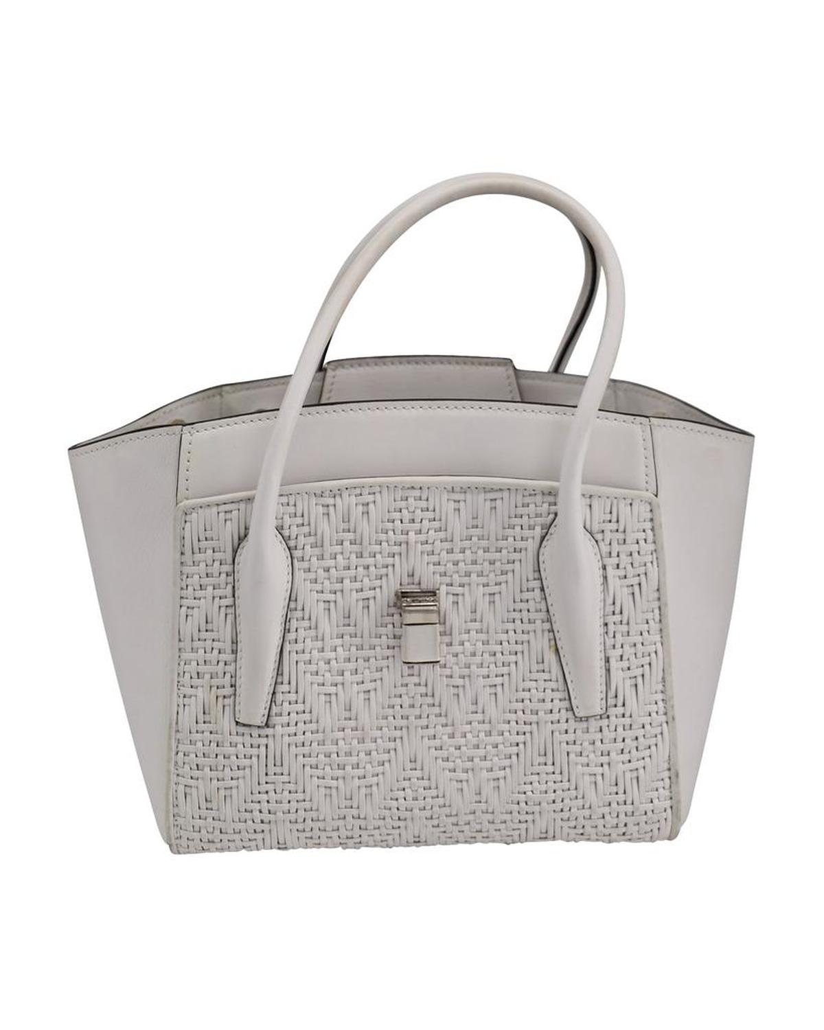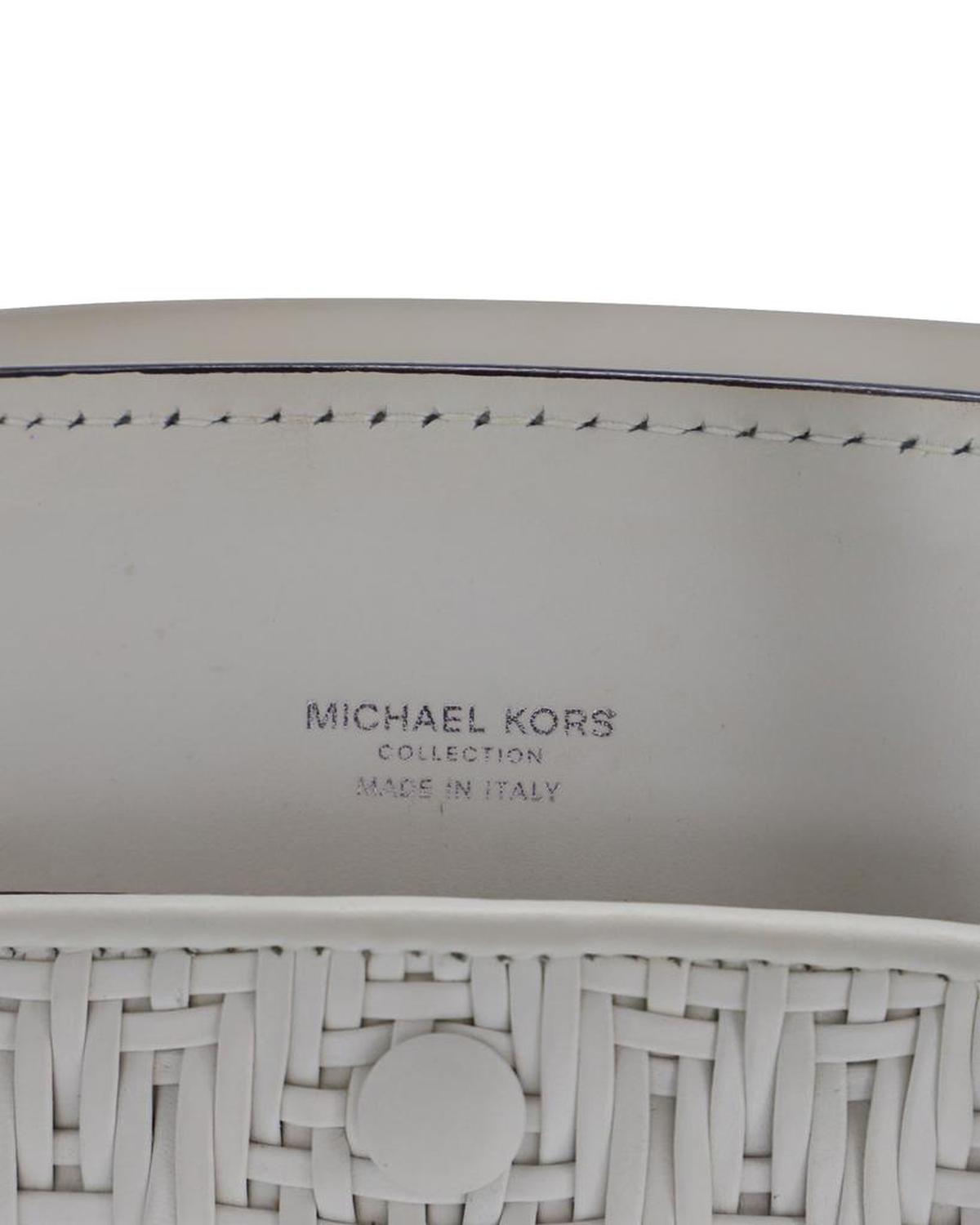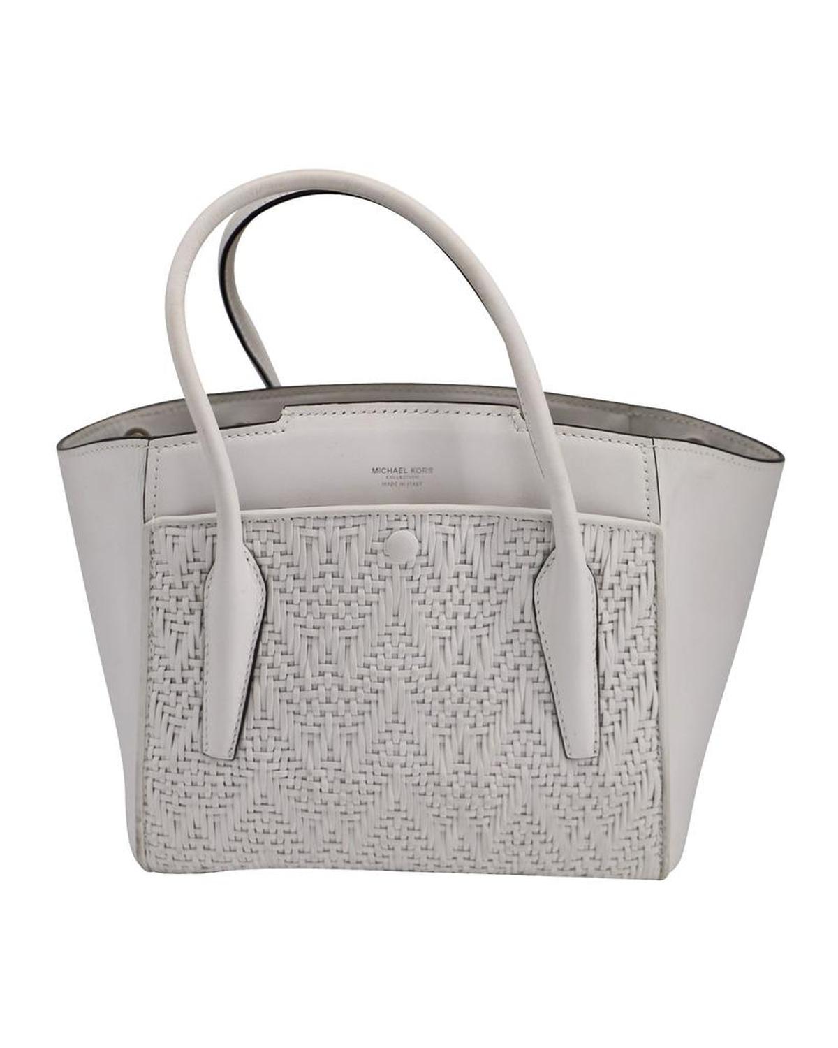 Crafted in Italy, this woven Bancroft satchel by Michael Kors evokes a laid-back, timeless glamour in a refined silhouette with polished top handles and elegant lock hardware. Its luxe exterior is rendered in calf leather with a woven feature, while the interior is perfect for carrying smaller essentials. Complete with retractable side gussets and an adjustable strap, this all-occasion bag can also be worn as a crossbody.Michael Kors Bancroft Medium Woven Satchel in White Calf Leather Condition - goodMaterial - Leather | Calfskin leatherSize - one sizeWidth - 150Length - 250Height - 270Sign of wear - with few stains on the leather and innerSKU - 127413