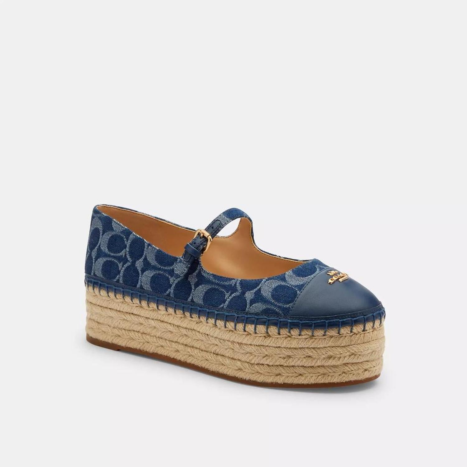 Signature denim and nappa leather upper Man-made leather lining and footbed Rubber outsole Buckle closure 2 heel 1 3/4 platform Style No. CZ155 | Coach Outlet Carmela Espadrille In Signature Denim - Blue, Size - 8