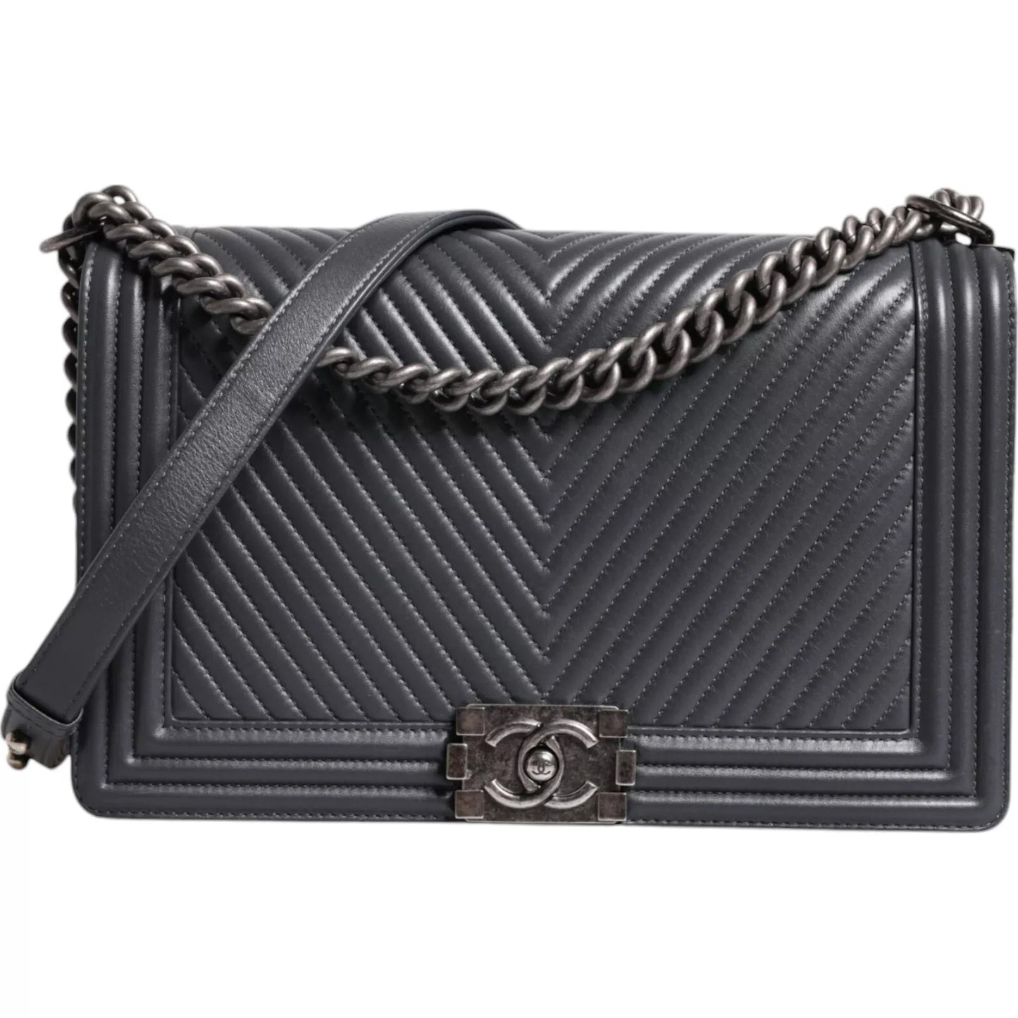 Chanel Gray Large Lambskin Chevron Double Chain Shoulder Silver Leather Bag