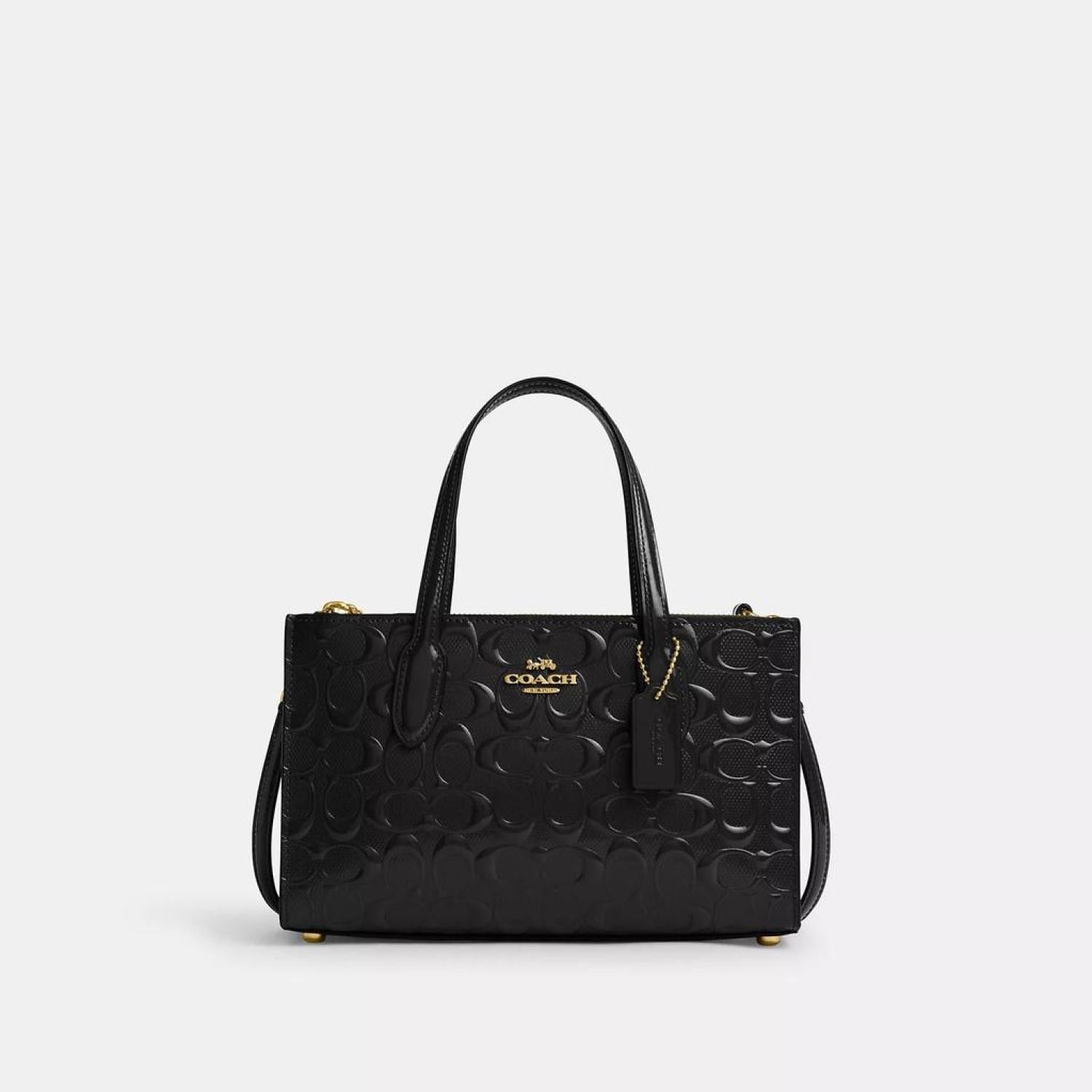 • Signature patent leather and smooth leather Inside multifunction pocket Magnetic snap closure fabric lining Side zip compartments Handles with 4 1/2 drop Detachable strap with 22 1/2 drop for shoulder or crossbody wear Four protective feet at base 9 3/4 (L) x 6 1/4 (H) x 3 1/2 (W) Style No. CV400 | Coach Outlet Nina Small Tote Bag In Signature Leather - Red