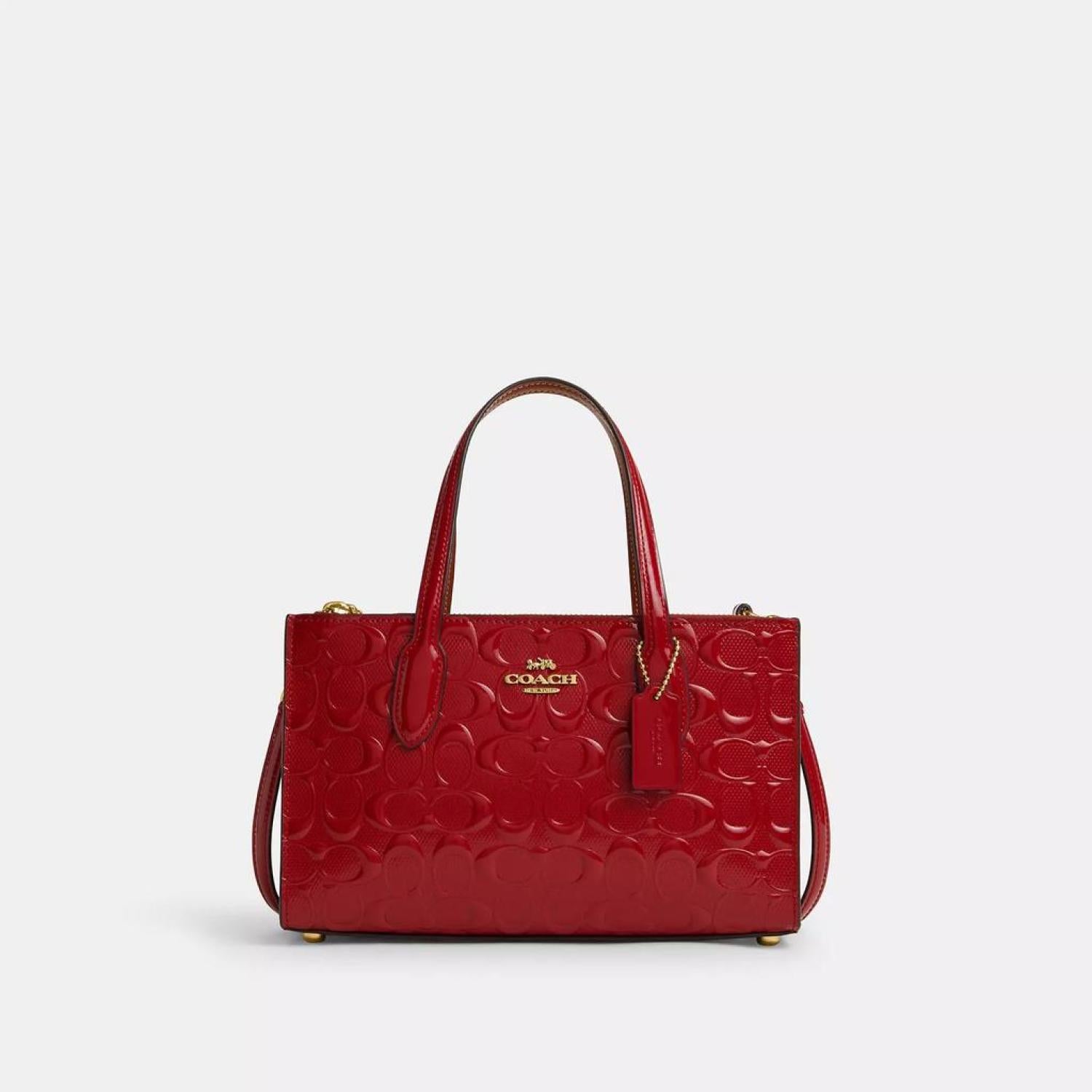 Signature patent leather and smooth leather Inside multifunction pocket Magnetic snap closure fabric lining Side zip compartments Handles with 4 1/2 drop Detachable strap with 22 1/2 drop for shoulder or crossbody wear Four protective feet at base 9 3/4 (L) x 6 1/4 (H) x 3 1/2 (W) Style No. CV400 | Coach Outlet Nina Small Tote Bag In Signature Leather - Red