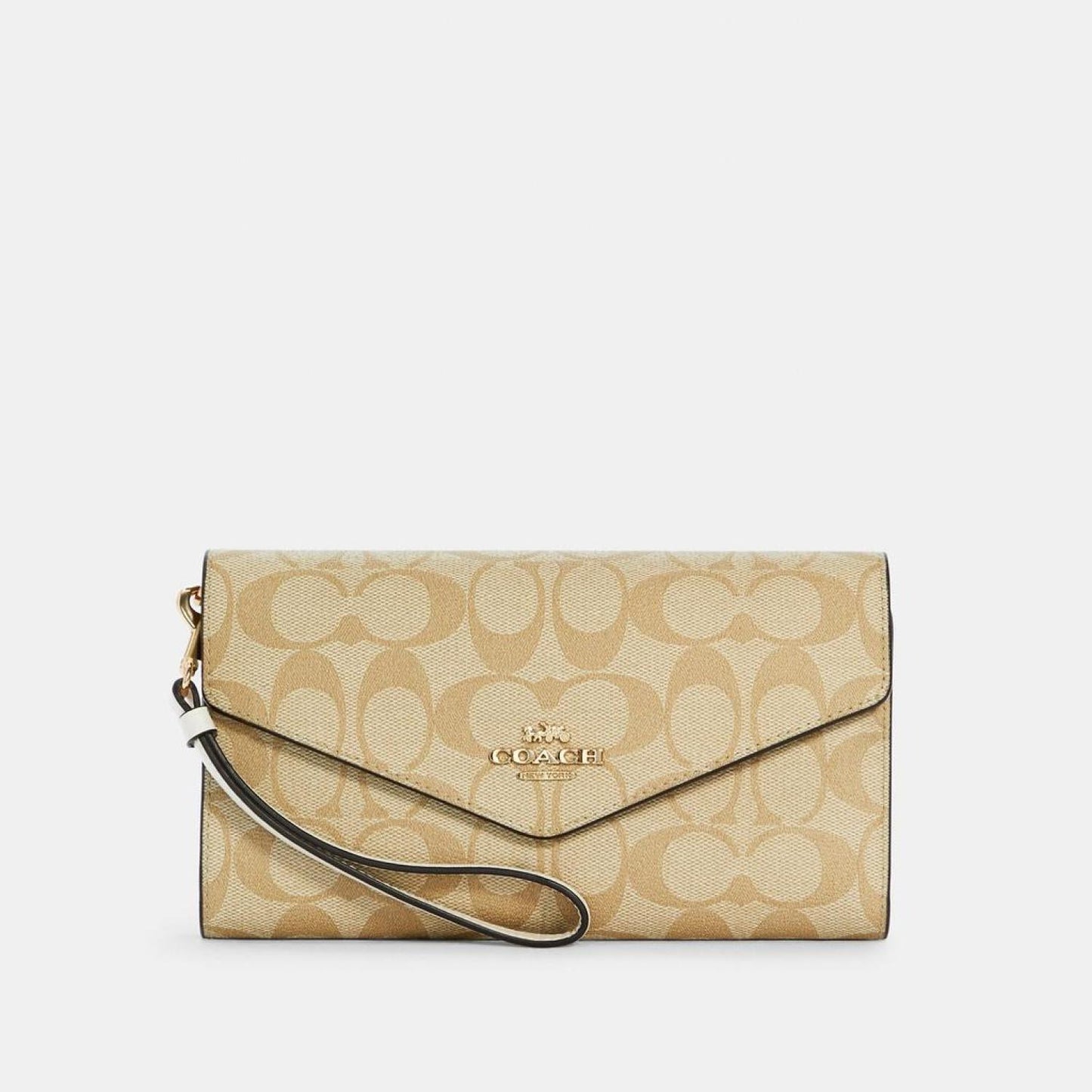Signature coated canvas and smooth leather Five credit card slots ID window Inside zip and open pockets Snap closure Outside zip coin pocket Detachable wrist strap 8 1/4 (L) x 4 1/2 (H) Style No. C1962