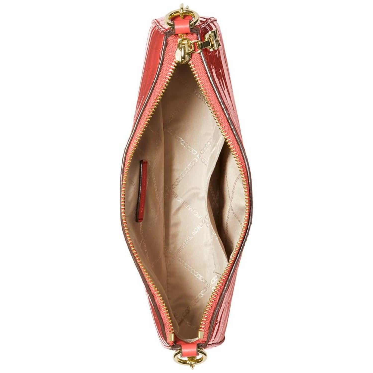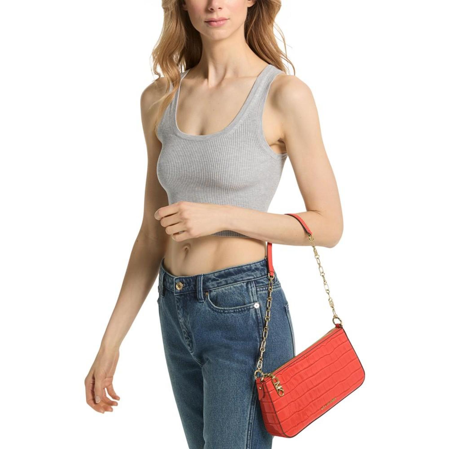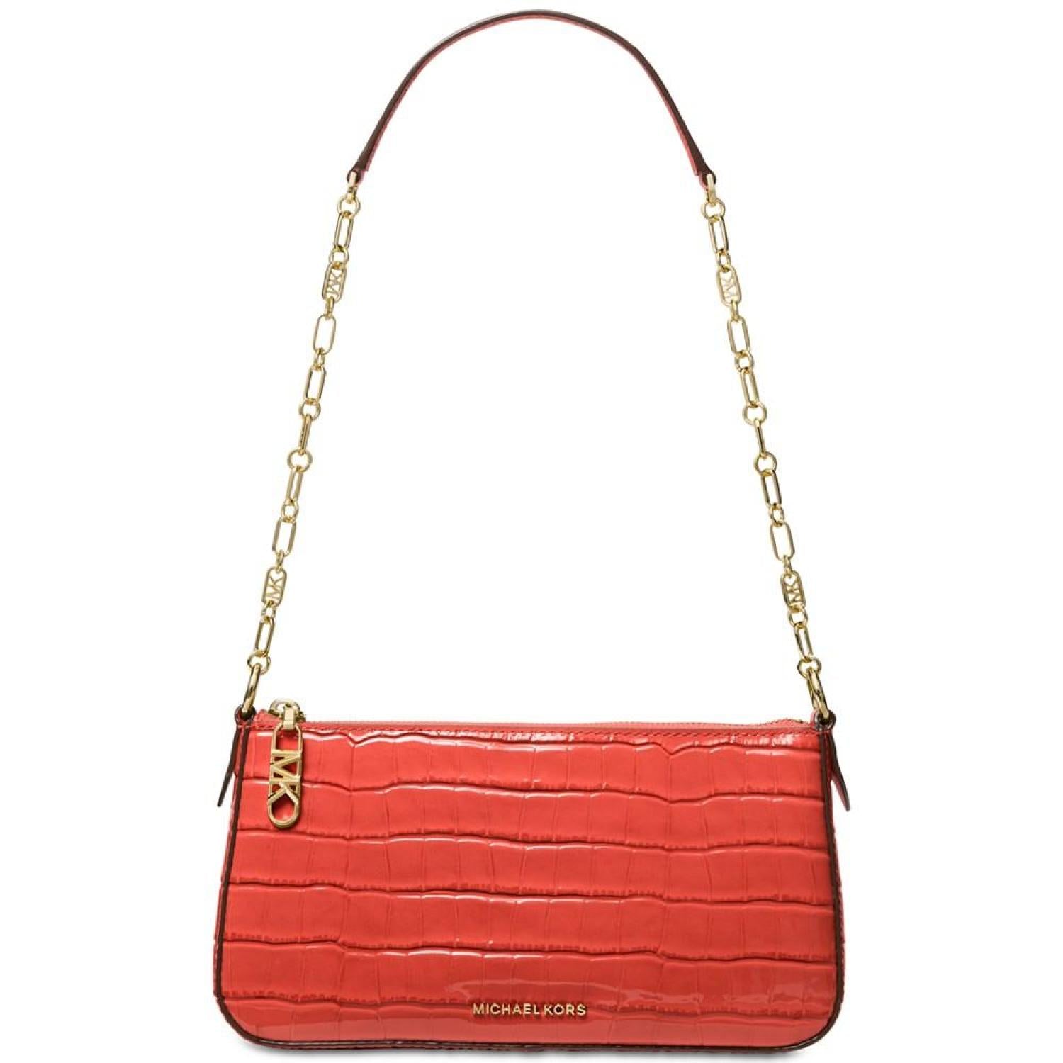 Chic and sophisticated, this pouchette by MICHAEL Michael Kors is crafted in leather and finished with signature gold-tone hardware and chain strap for an iconic finish. Small sized bag; 10"W x 5"H x 2"D (width is measured across the bottom of handbag) 11-1/2"L strap Zippered closure Gold-tone signature hardware & metal logo Interior slip pocket Leather; lining: polyester Spot clean Imported