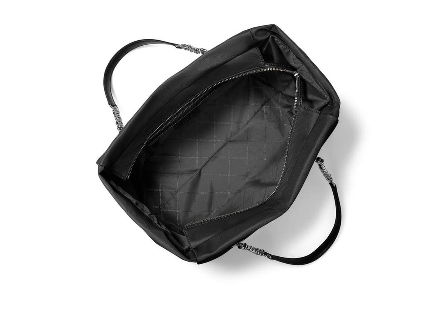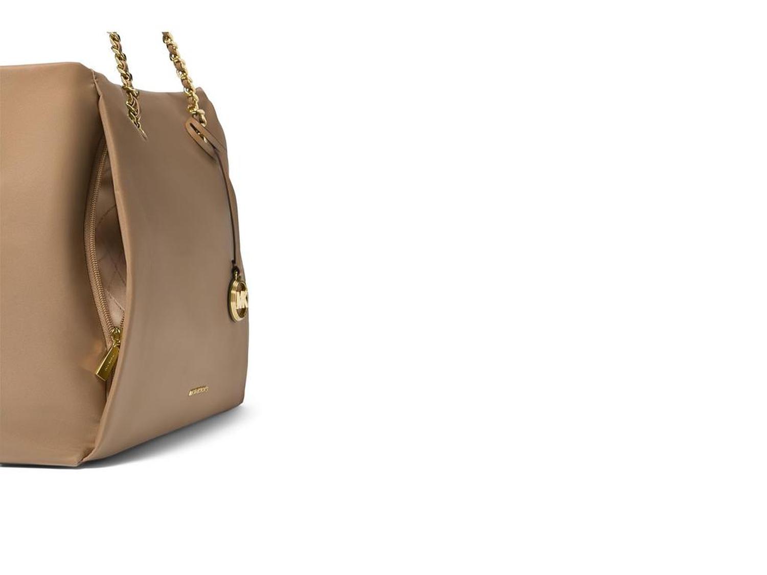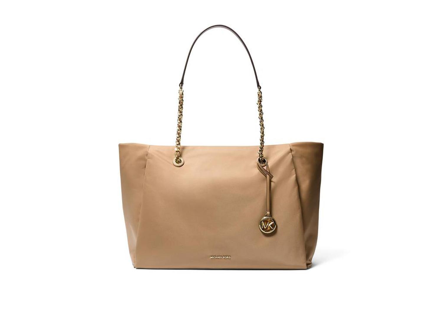 The MICHAEL Michael Kors® Georgia Large Top Zip Tote is a stylish and versatile bag made from durable nylon material. It features chain-linked shoulder straps for comfortable carrying, a zippered top closure to keep your belongings secure, and a removable logo charm for added flair. Zippered interior pocket. Branding on the front. Polyester lining. Imported. Please note, the hardware color and interior lining may differ from the color shown in the photo.