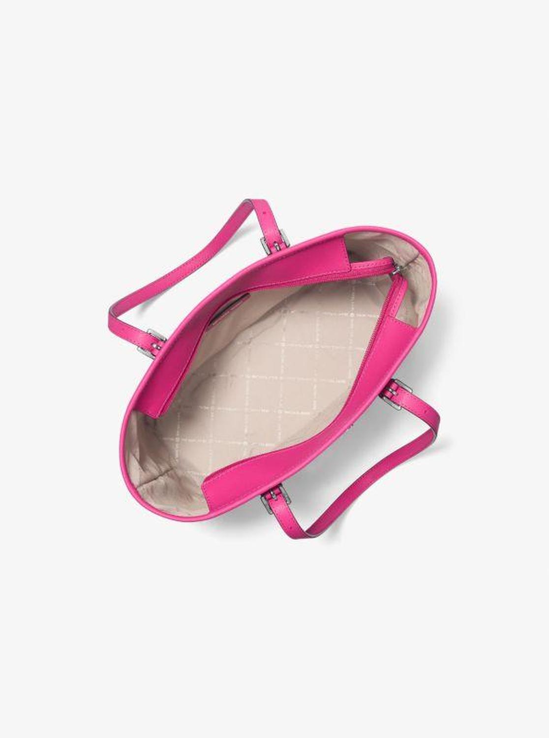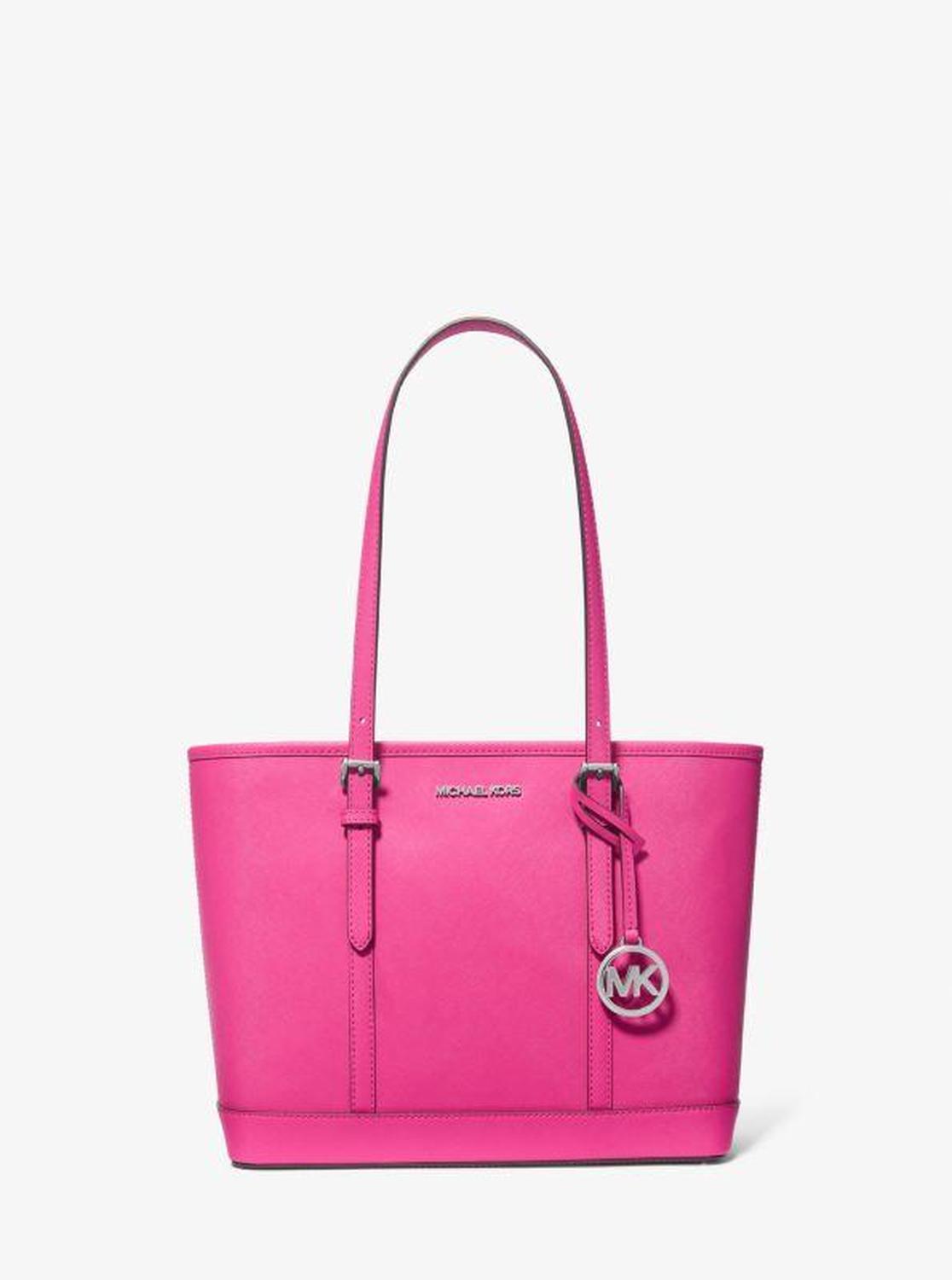 • This Jet Set tote bag is the ideal travel companion. A perfect size, it’s roomy enough to store your essentials without weighing you down. Saffiano leather and a gold-tone logo charm make a luxe statement, while a top-zip fastening ensures your belongings will stay in place—whether you’re in flight or on the ground.