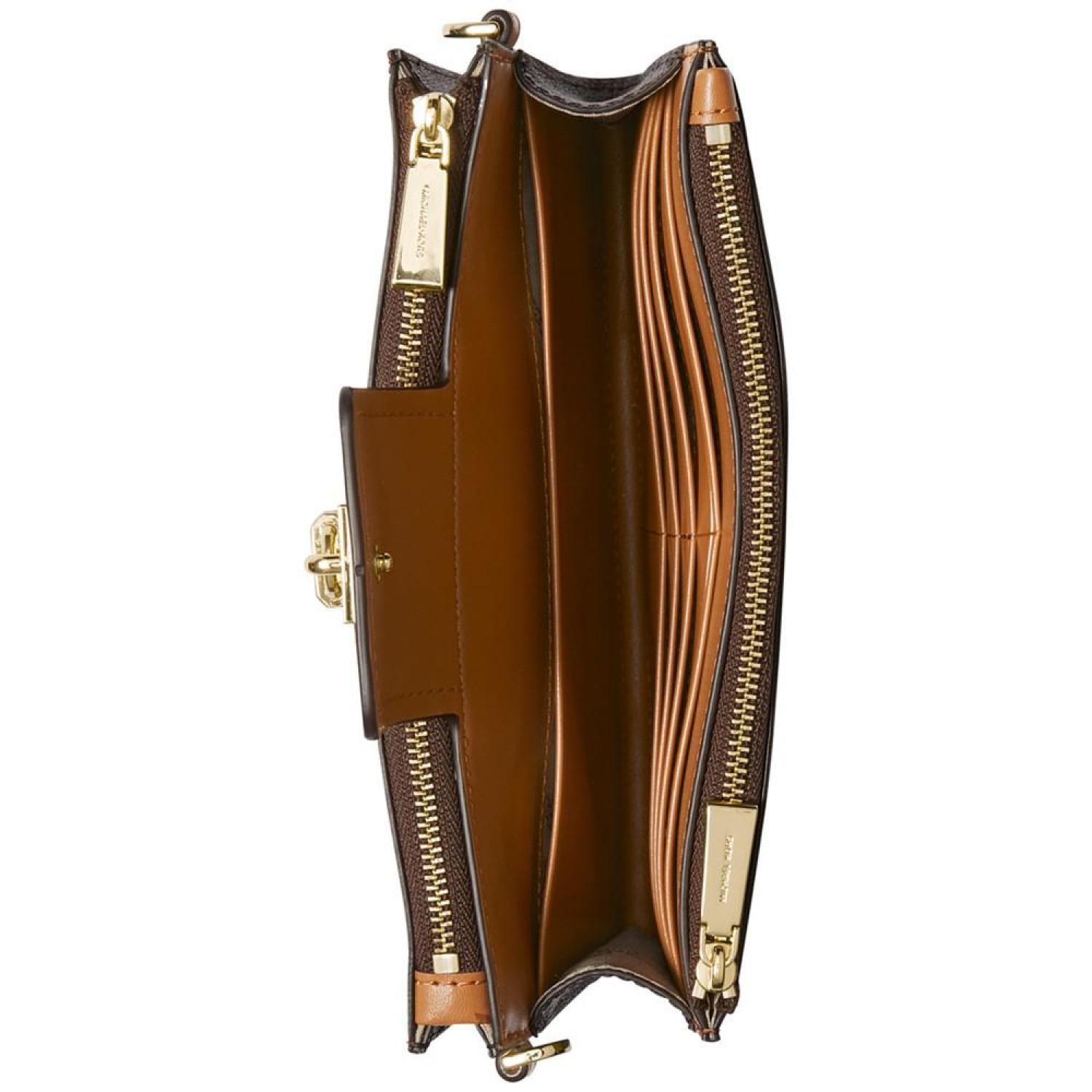 Streamlined and classic with the interior features of a wallet, the Ruby Small Double Zip Crossbody by MICHAEL Michael Kors has it all. Small sized bag; 8"W x 5-1/2"H x 2"D (width is measured across the bottom of handbag); 0.86 lbs. approx. weight Silhouette is based off 5'9" model 24"L adjustable crossbody strap Magnetic flap closure Gold or silver tone hardware ,varies by style exterior back slip & zip pockets & front zip pocket Interior front & back slip pockets & 6 card slots exterior back slip & zip pockets & front zip pocket Polyvinylchloride, polyester, polyurethane; lining: polyester; trim: polyurethane, polyester, cotton Spot clean Imported