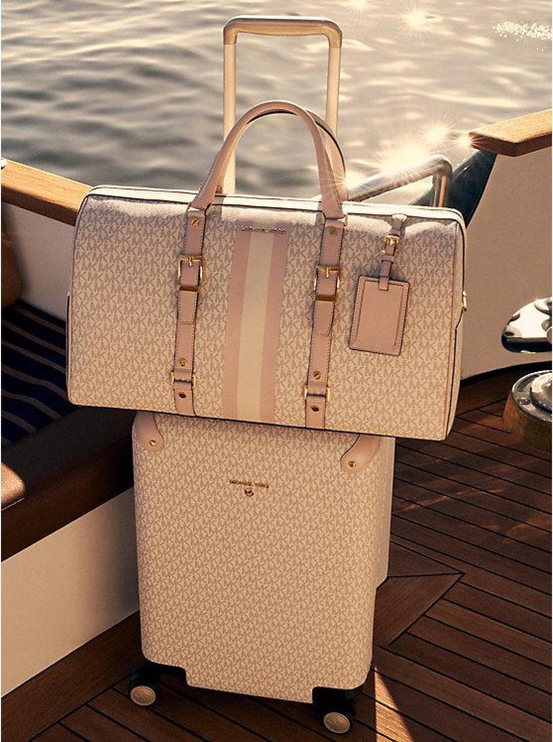 • Our logo-print canvas suitcase is the definition of first-class style. Complete with reinforced leather corners and sleek hardware, this carry-on piece features 360-spinning wheels and opens to a compartmented interior to keep the essentials in place during long-haul flights.