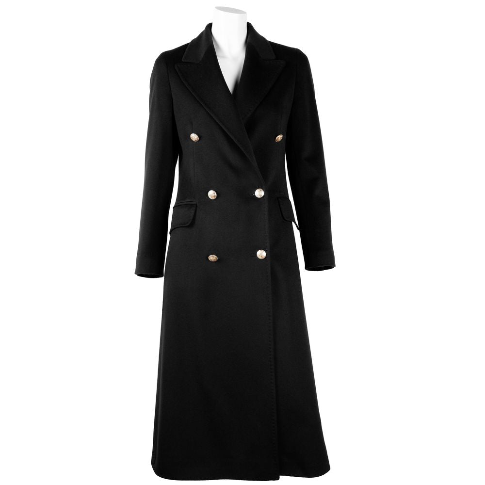 Loro Piana Fabric Double-breasted long coat in combed virgin wool with peak lapels, two front pockets and gold buttons.