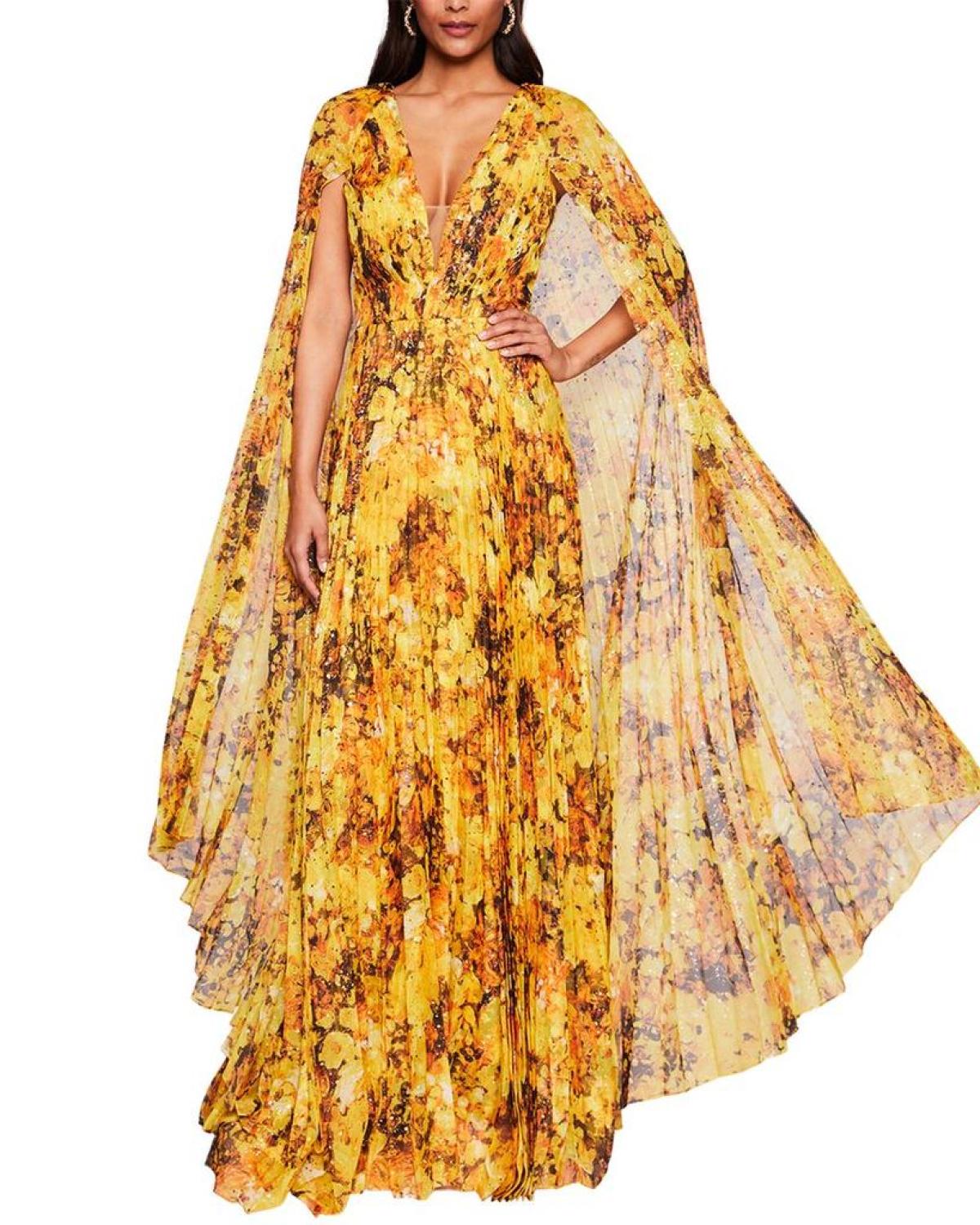 Elevate your wardrobe with the Marchesa Notte Pleated Plunging V-Neck Printed Dress. This stunning dress is perfect for any special occasion, featuring a striking yellow and gold print that is sure to turn heads. The plunging v-neck adds a touch of drama, while the pleated detailing creates a flattering silhouette. Made from 100% polyester, this dress is both comfortable and luxurious. With a center back zipper for easy on and off, this dress is perfect for gowns and cocktails for that special night. Measuring approximately 63.5 inches from shoulder to hem, the Marchesa Notte Pleated Plunging V-Neck Printed Dress is a show-stopping piece that is sure to make a statement. Dry clean only, imported.