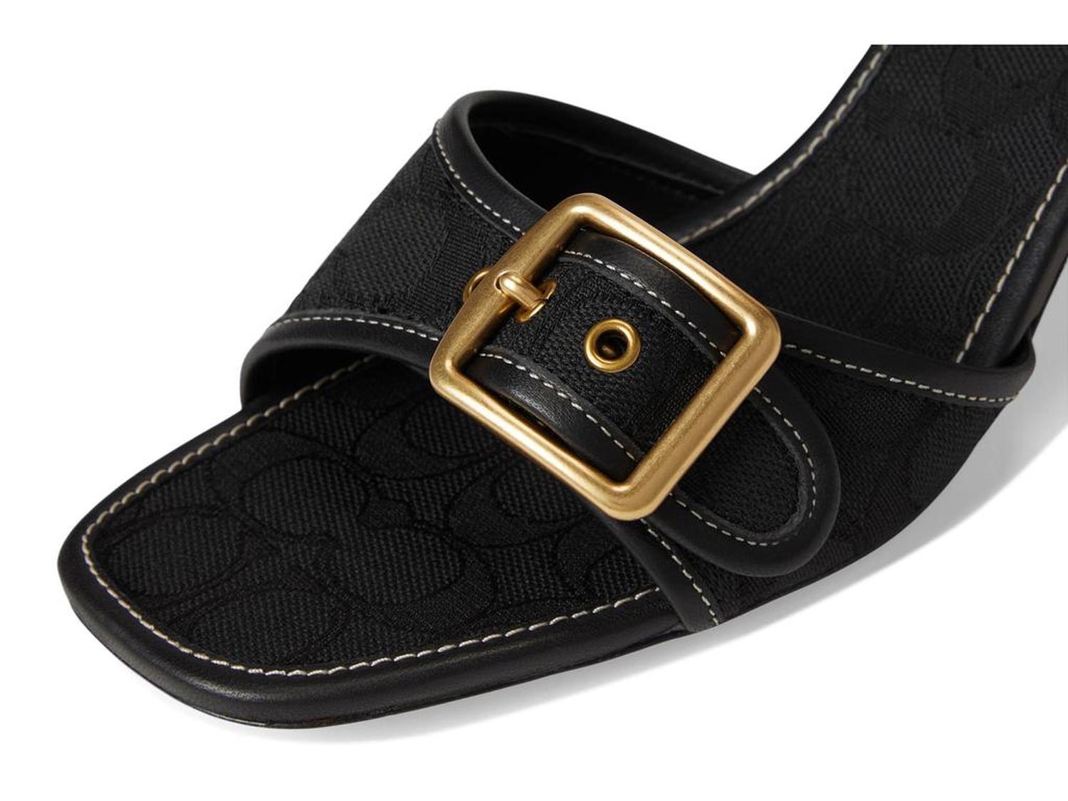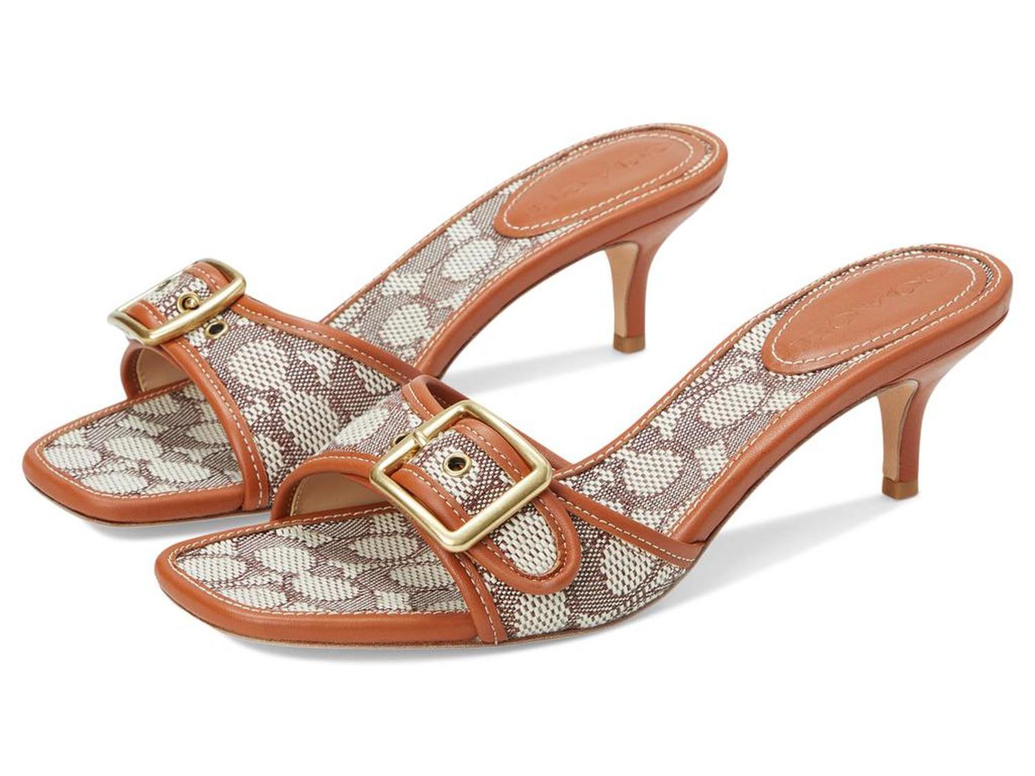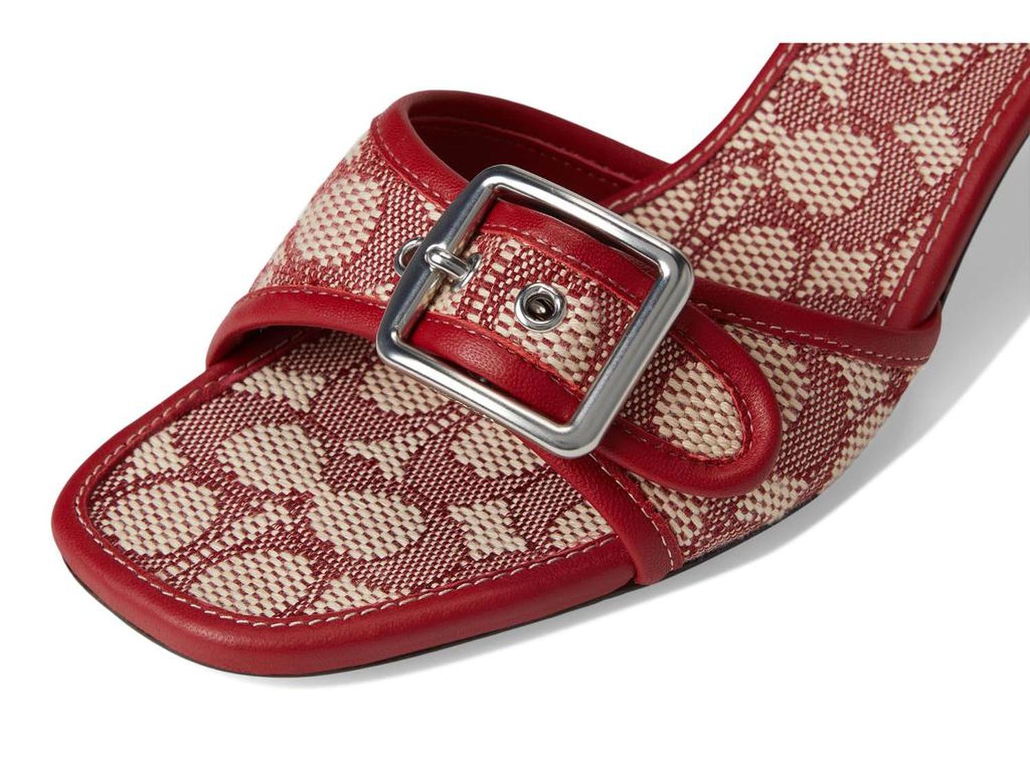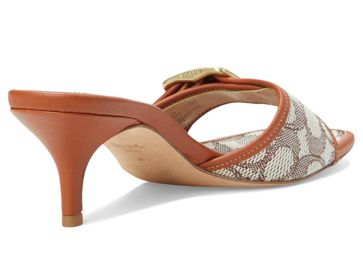 Please Note: COACH™ items cannot be shipped to military addresses (APO or FPO) and addresses in Hawaii, the Virgin Islands, Guam or any other locations outside of the continental US. COACH® Margot Sandals: Confidence in every stride. Embrace sophistication with a signature twist. Crafted from signature textile jacquard and leather, these sandals blend luxury and comfort effortlessly. The jacquard footbed cradles your feet, while the man-made leather lining and outsole ensure durability and style. Designed with a chic kitten heel and slip-on convenience, the Margot Sandals are perfect for elevating casual ensembles or complementing evening wear. Imported. Product measurements were taken using size 9, width M. Please note that measurements may vary by size. Measurements: Heel Height: 2 1/4 in Weight: 7 oz-