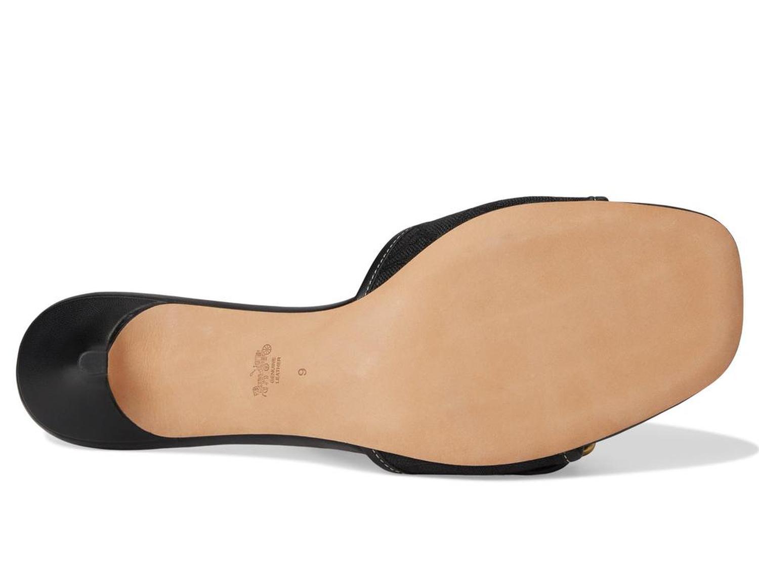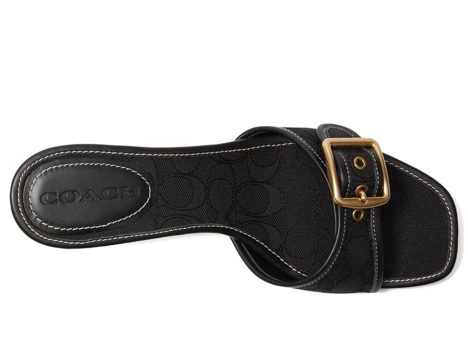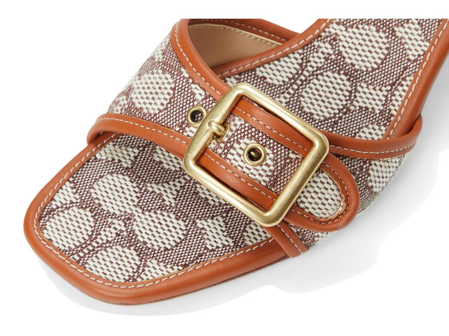 COACH® Margot Sandals: Confidence in every stride. Embrace sophistication with a signature twist. Crafted from signature textile jacquard and leather, these sandals blend luxury and comfort effortlessly. The jacquard footbed cradles your feet, while the man-made leather lining and outsole ensure durability and style. Designed with a chic kitten heel and slip-on convenience, the Margot Sandals are perfect for elevating casual ensembles or complementing evening wear.