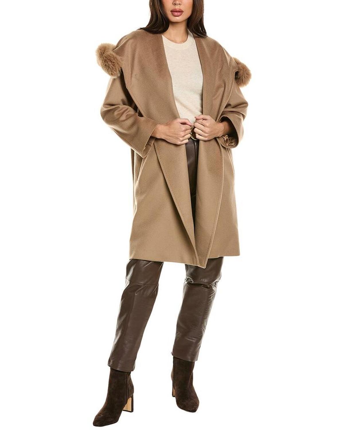 Indulge in sophisticated style with the Max Mara Studio Mango Wool Coat. This luxurious coat features a fur-trimmed hood, two front pockets, and a belted waist for a flattering silhouette. The single-button closure adds a touch of elegance, while the medium weight makes it perfect for transitioning between seasons. Crafted from 100% virgin wool with a 100% viscose lining, this coat is finished with plush fox fur from Finland. Elevate your outerwear collection with this imported Max Mara coat, available in a rich brown color/pattern. Measurements may vary slightly by size, with the model standing at 5'10 and wearing a size 2. Ensure lasting quality by cleaning this coat with a fur expert.