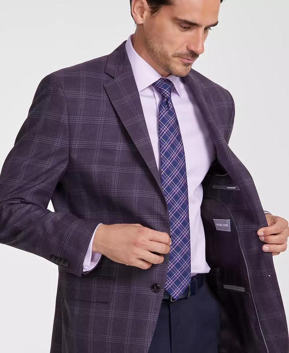 • Maintain a polished look with the classic tailoring and timeless plaid of this Michael Kors sport coat.