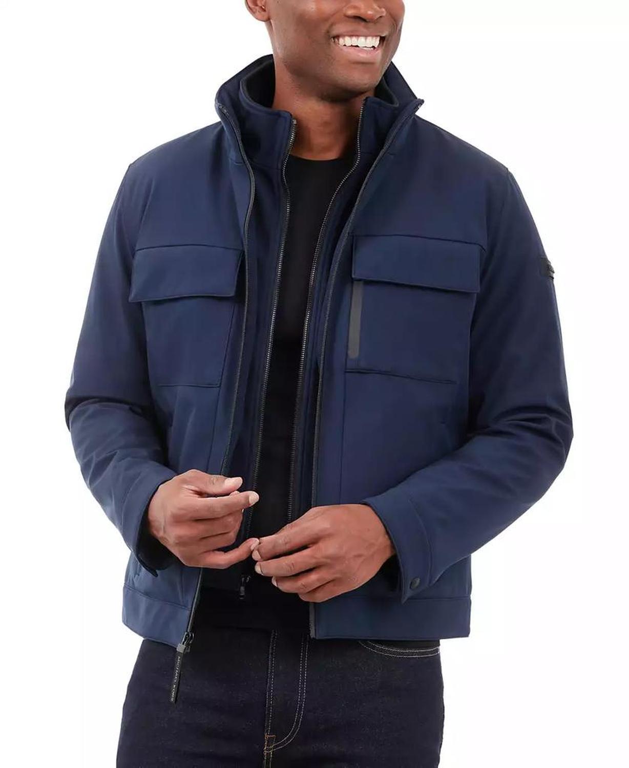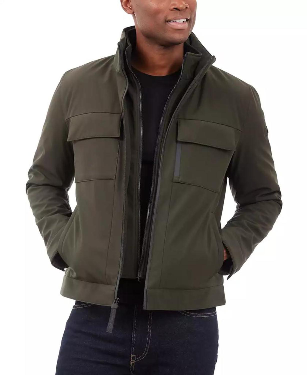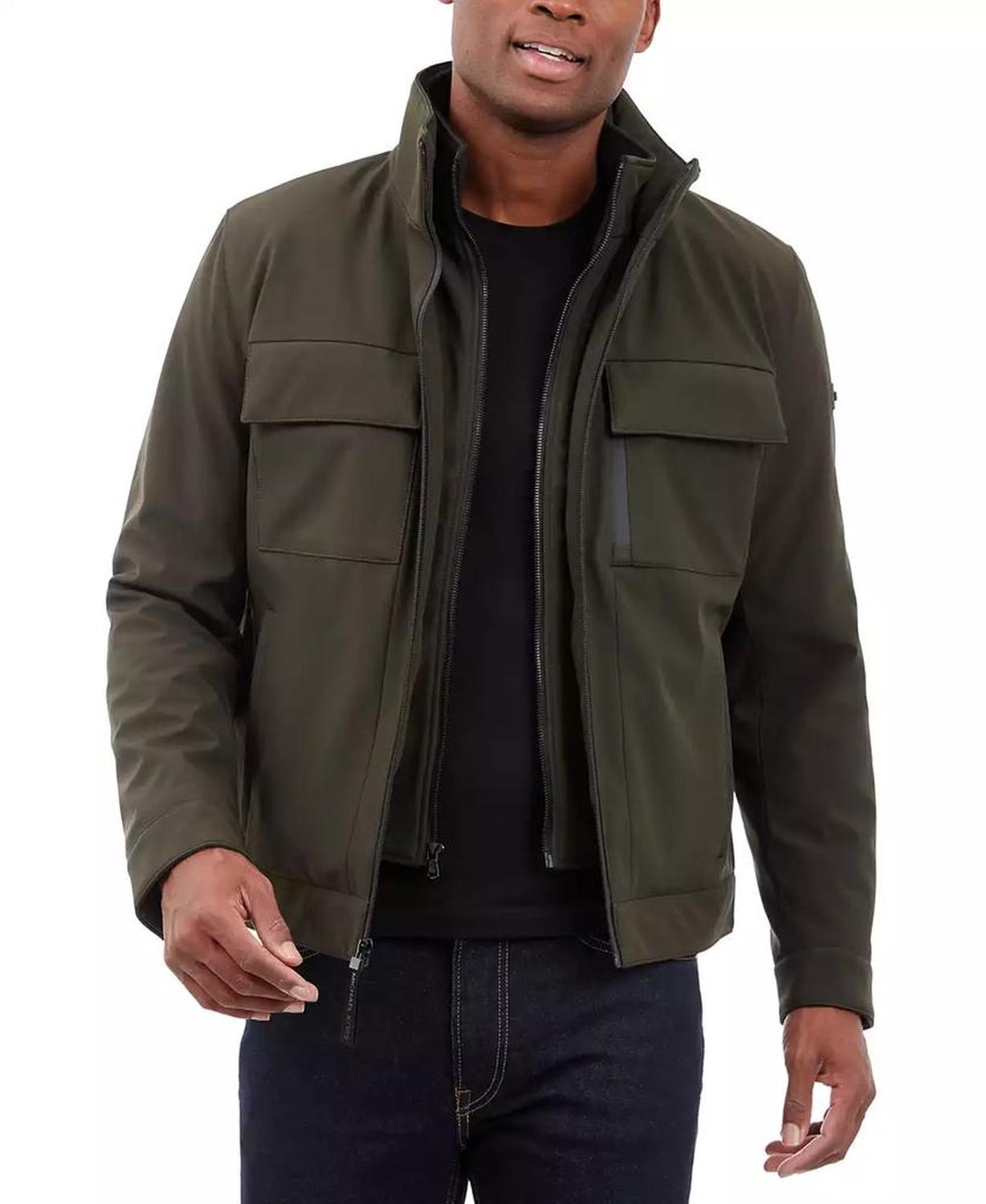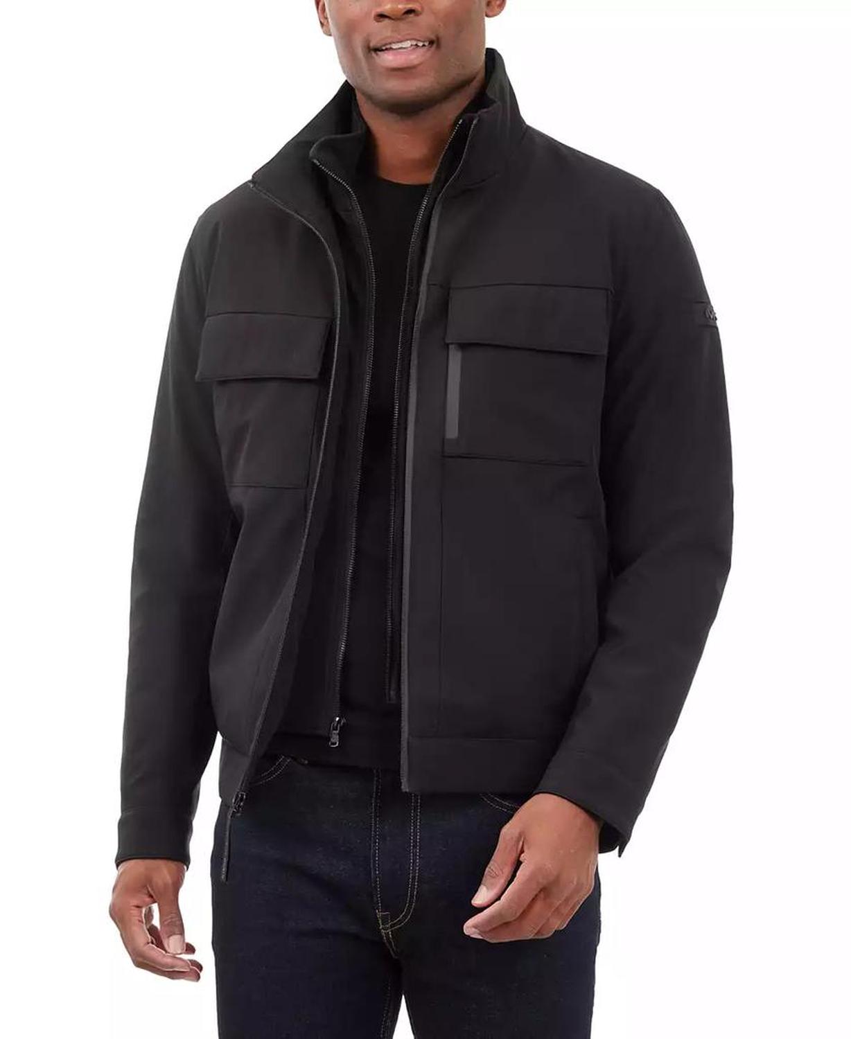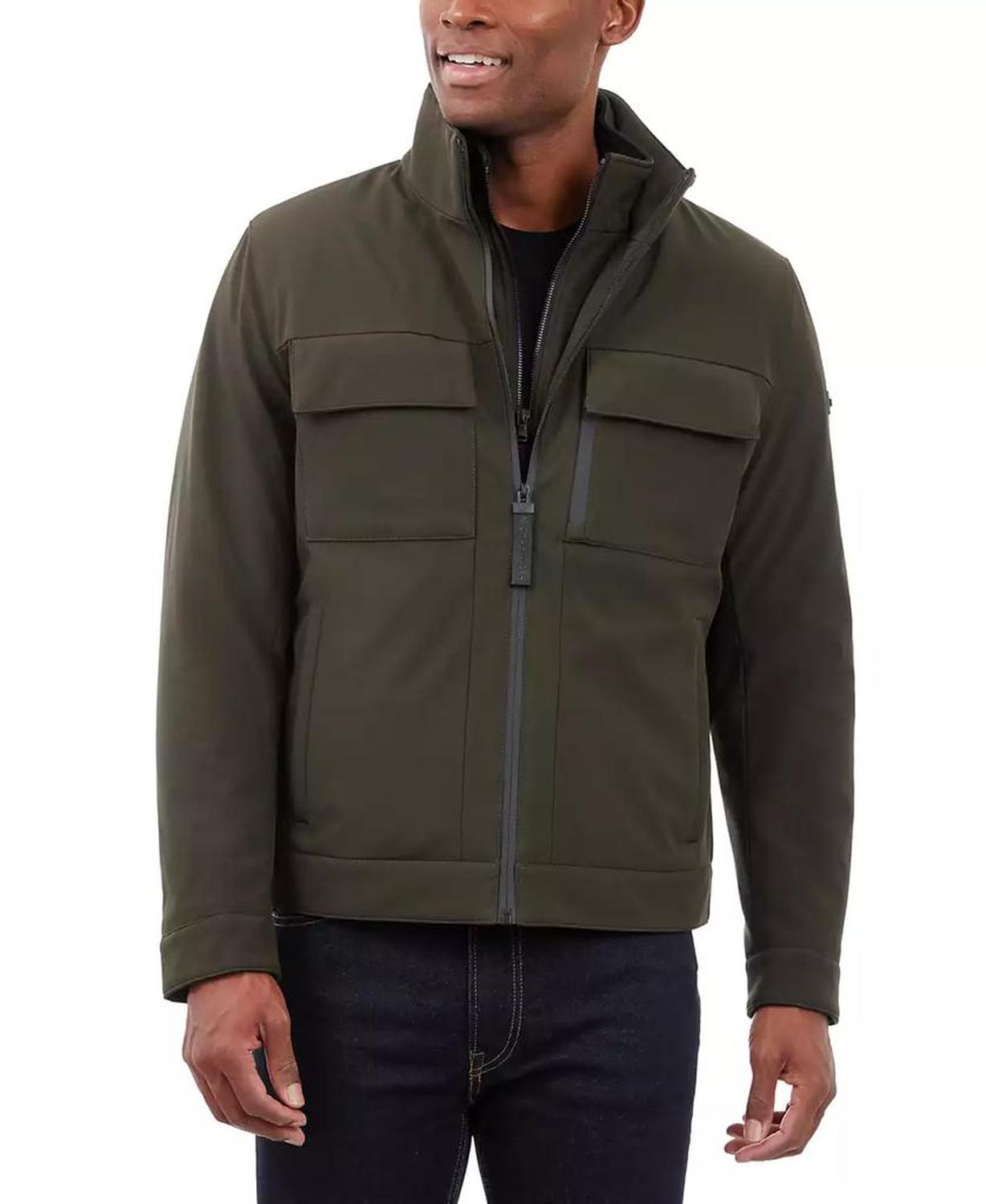 • This signature Michael Kors soft-shell jacket is perfect for date nights and chilly nights alike. When the temperatures start to dip, rejoice in the fleece-lined interior and toasty stand collar.