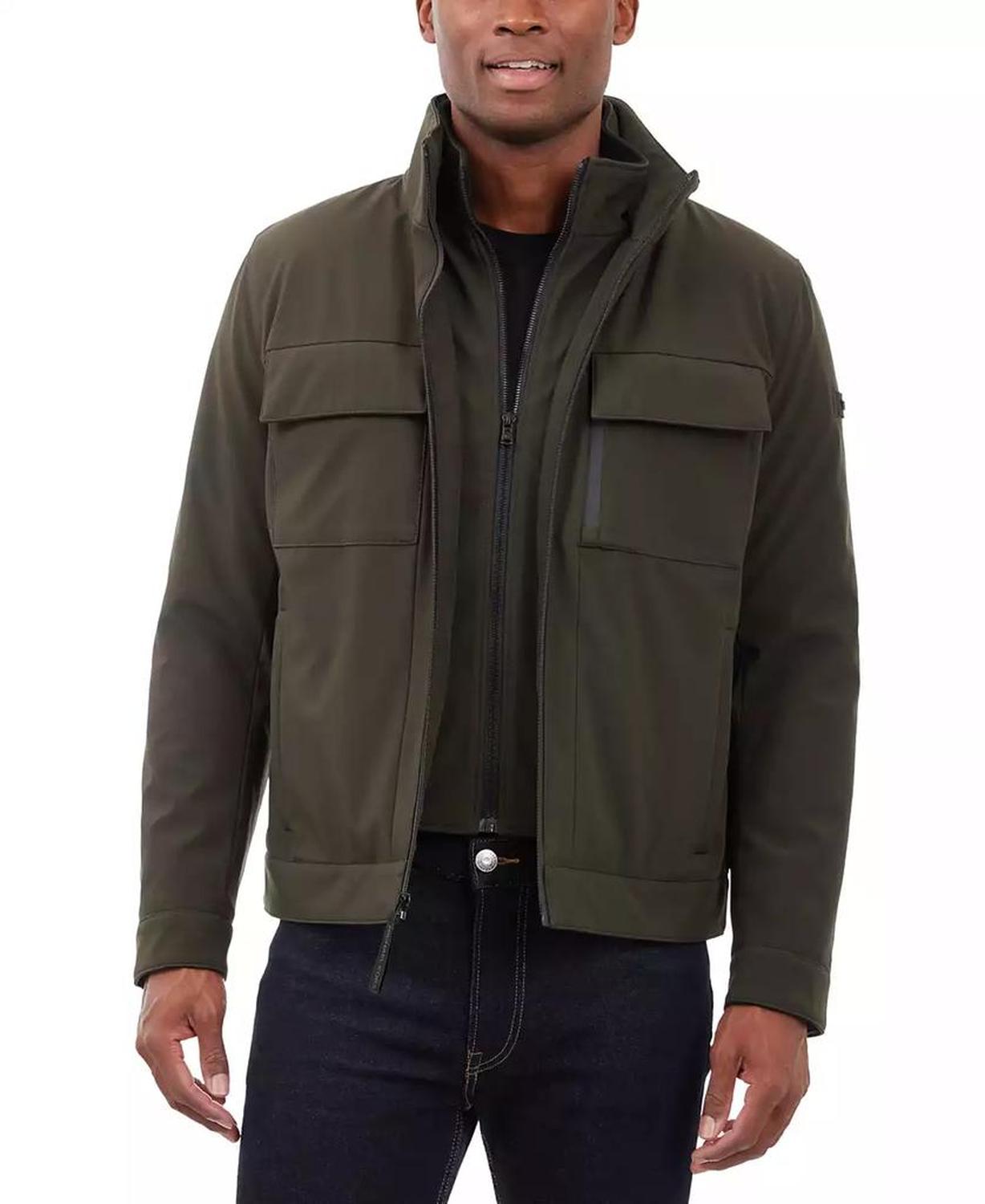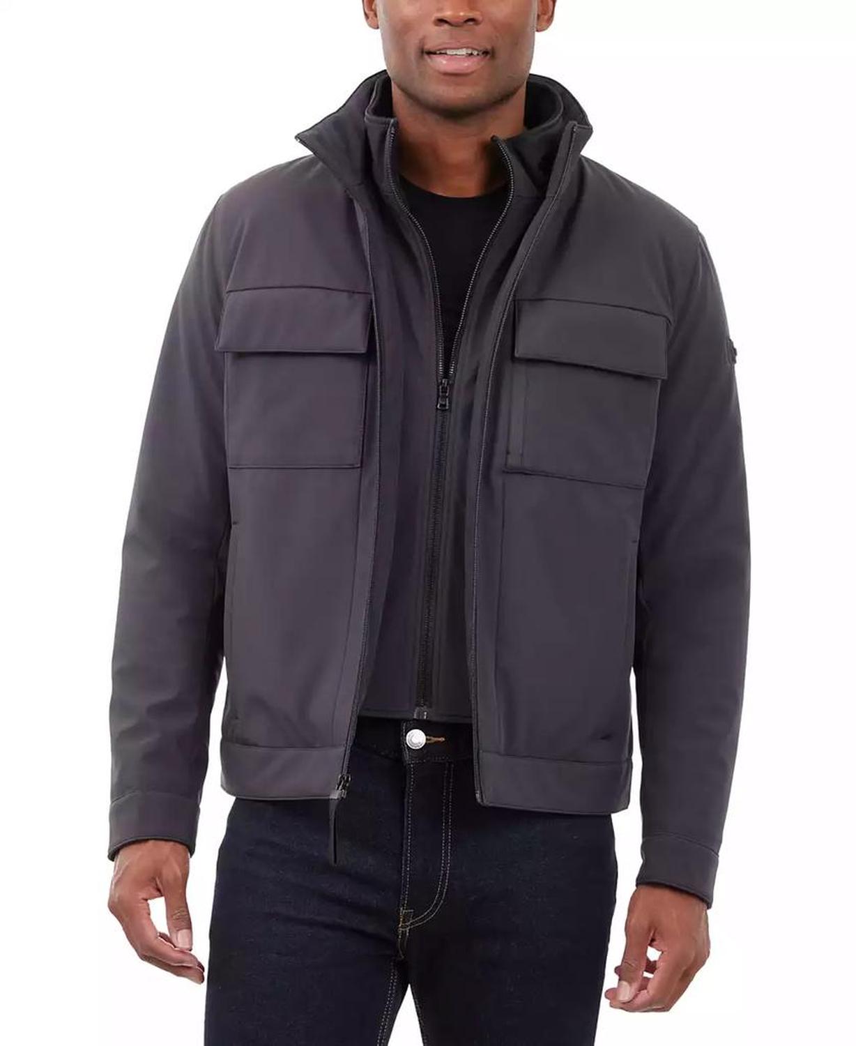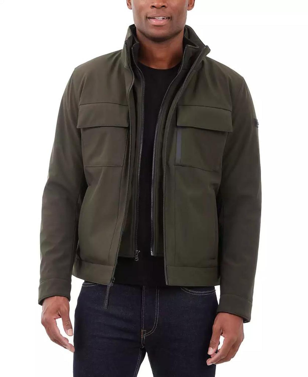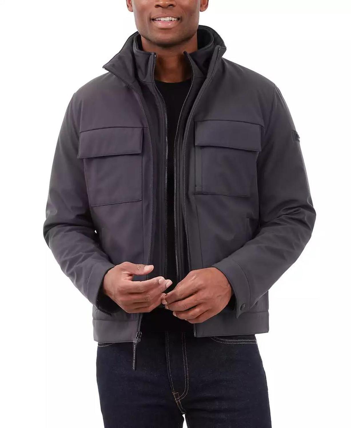 • This signature Michael Kors soft-shell jacket is perfect for date nights and chilly nights alike. When the temperatures start to dip, rejoice in the fleece-lined interior and toasty stand collar.