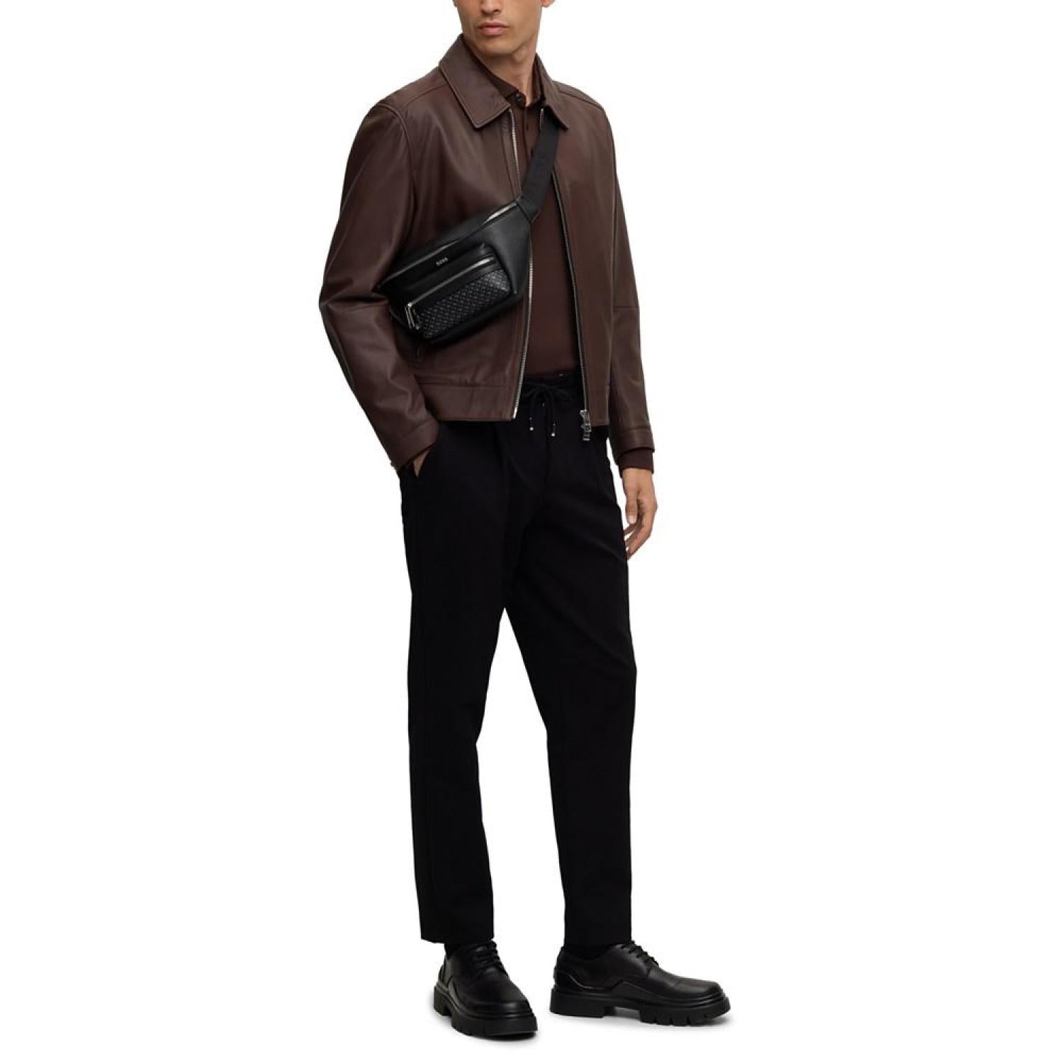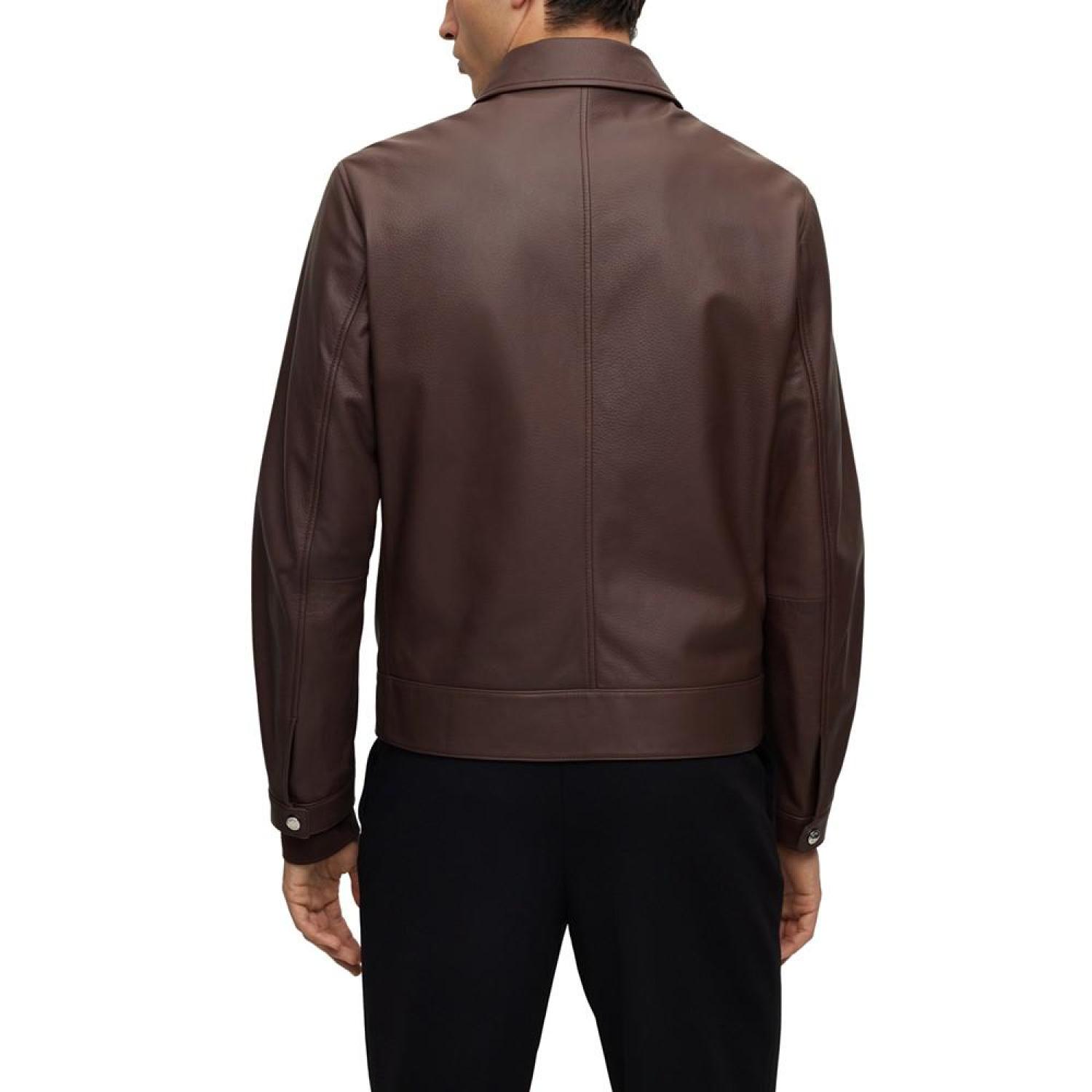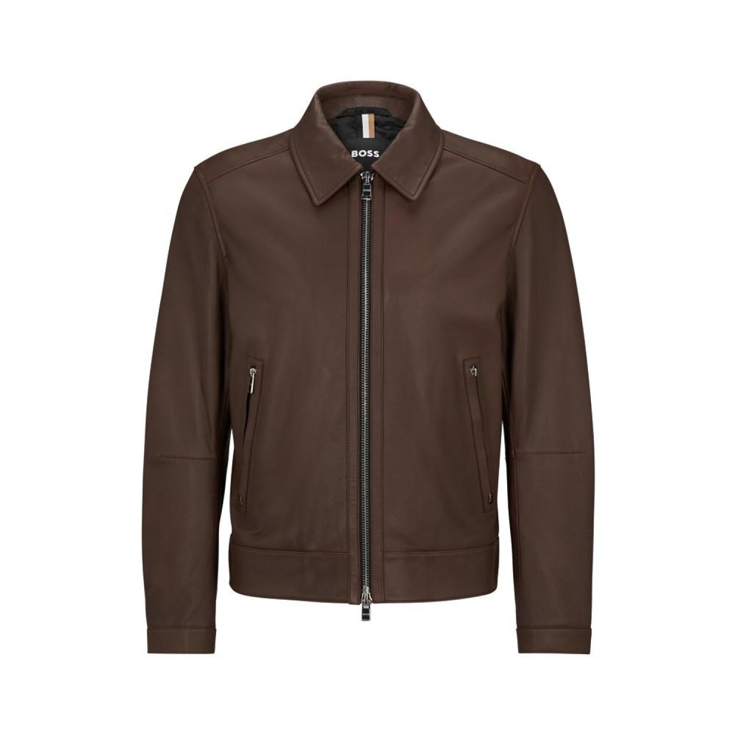 • A modern jacket by BOSS menswear, designed in supple leather with a two-way front zip and a monogrammed lining in smooth fabric. A minimum leather used to make this product has been sourced from tanneries using low-impact methods.