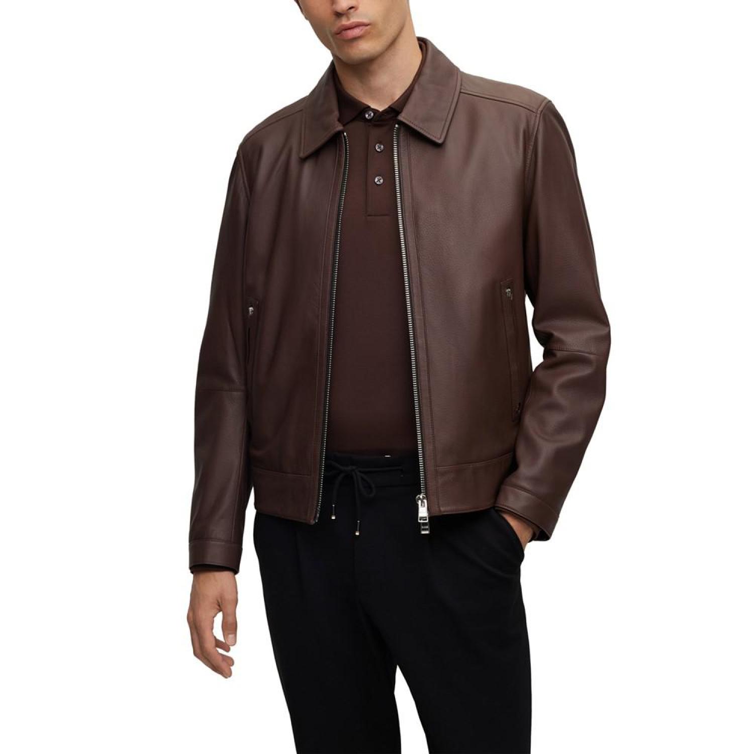 A modern jacket by BOSS menswear, designed in supple leather with a two-way front zip and a monogrammed lining in smooth fabric. A minimum leather used to make this product has been sourced from tanneries using low-impact methods.