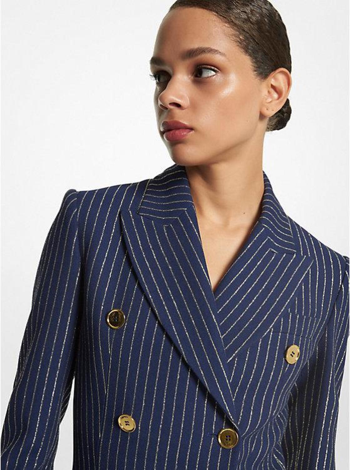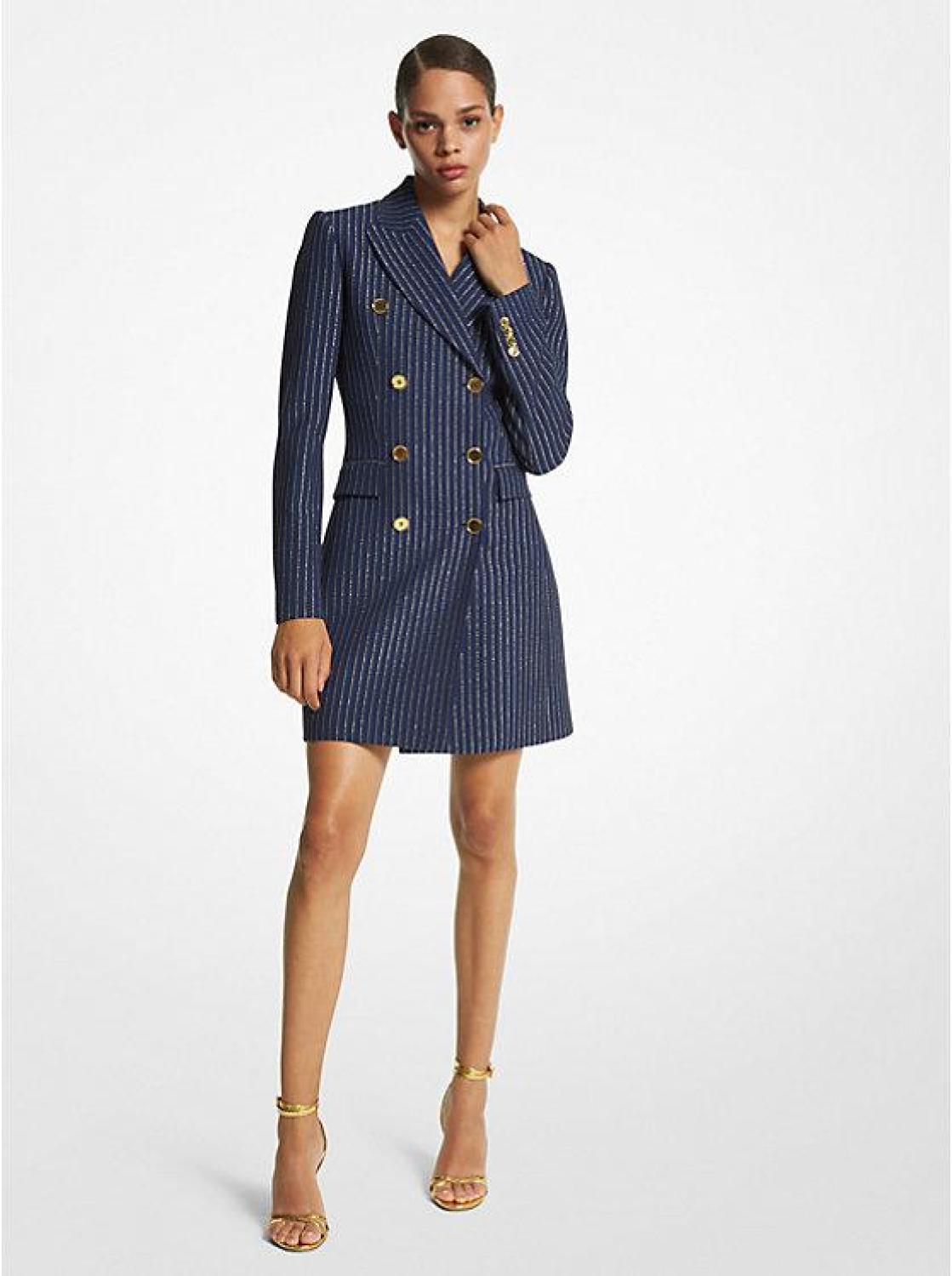 • A menswear staple, reimagined with a feminine sensibility. Eye-catching metallic pinstripes dial up the drama on this tuxedo dress. Crafted in Italy from luxurious double crepe sablé, it’s designed with notched lapels and a polished double-breasted closure, which further accentuate the tailored silhouette.