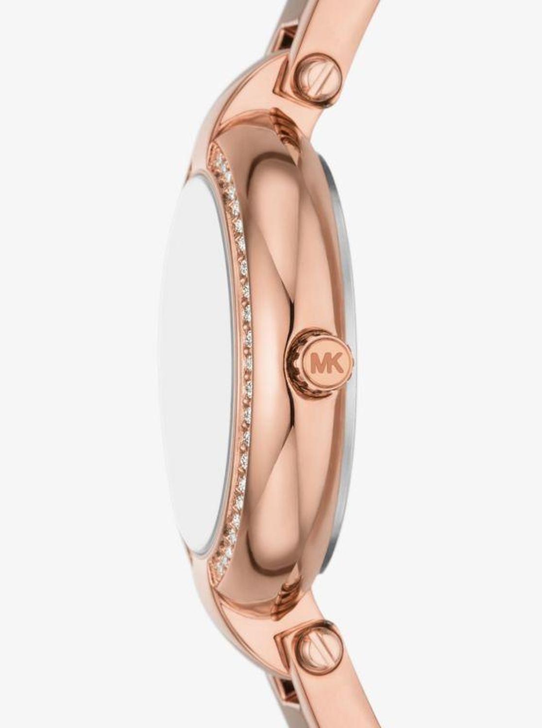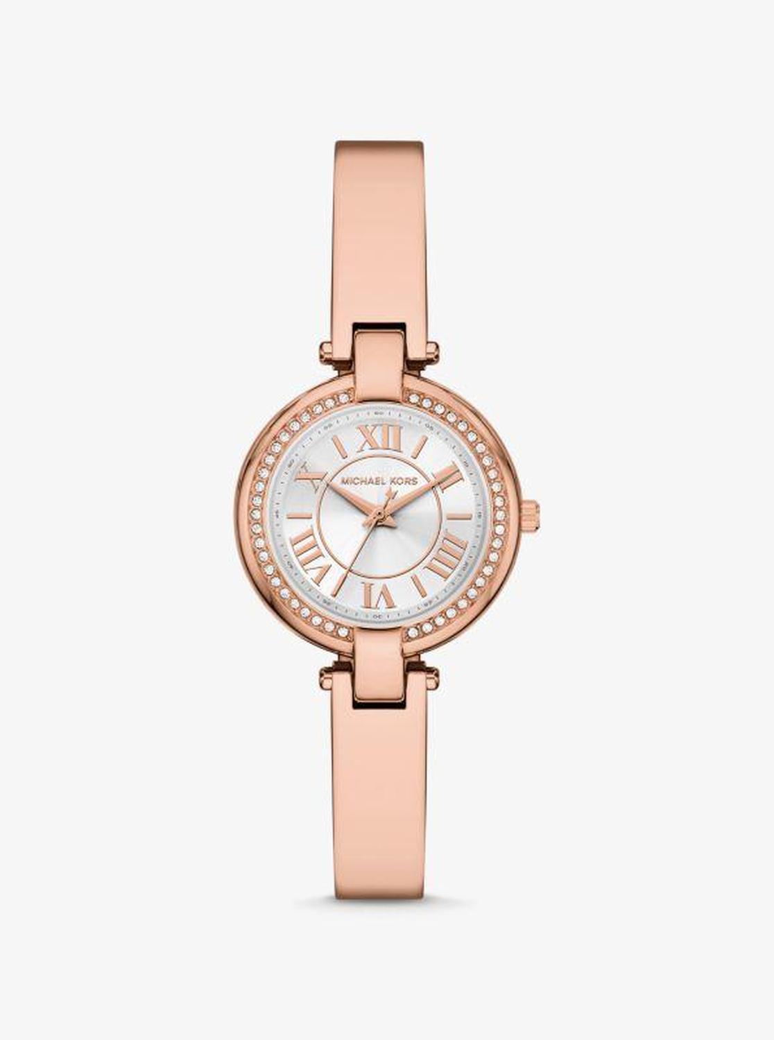 • The mini Laney watch is a masterclass in understated elegance. Updated with a bangle-inspired design, it features a circular bezel dotted with pavé and a mother-of-pearl face with classic Roman numeral markers. Made from rose-gold-tone plated stainless steel, it’s designed to be worn for years to come.