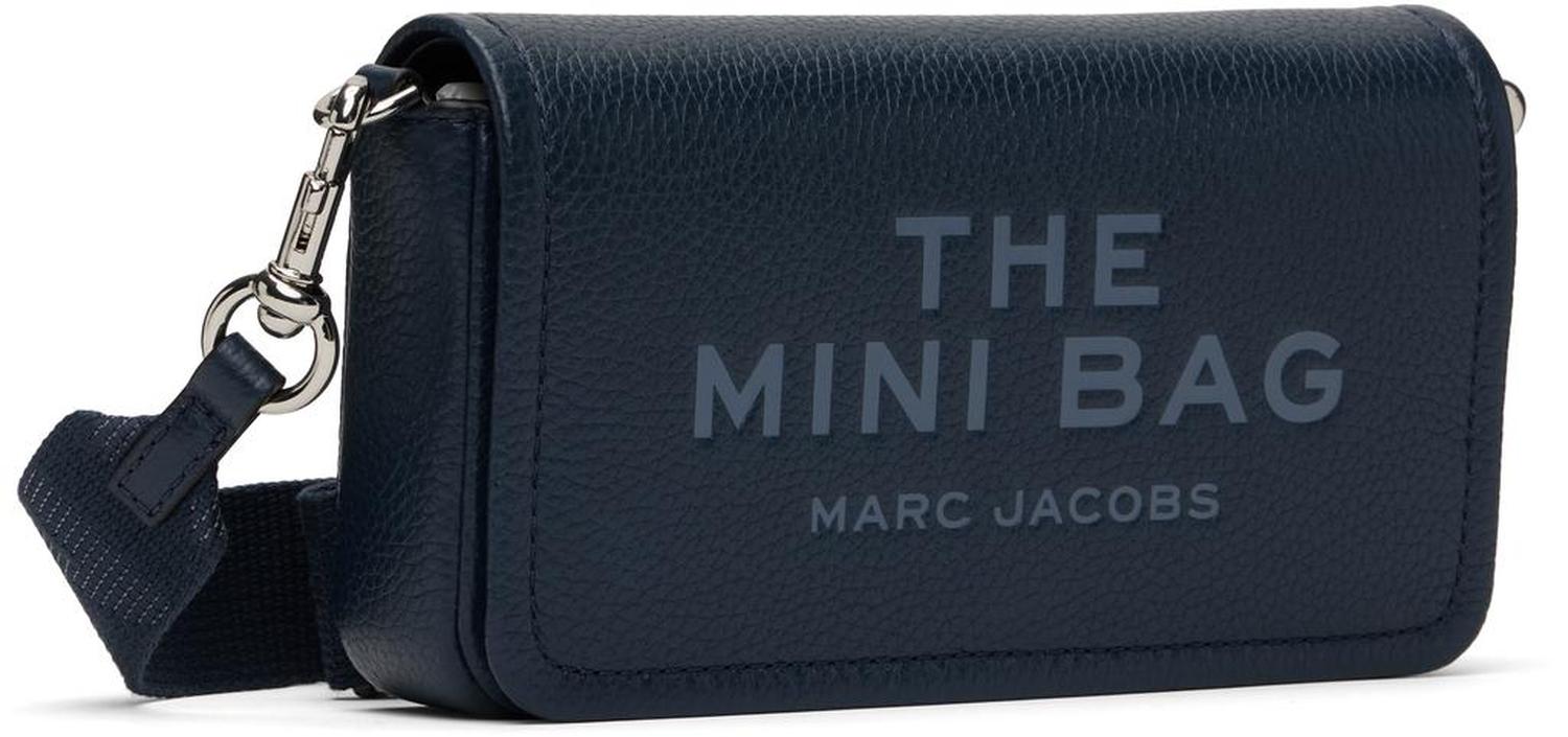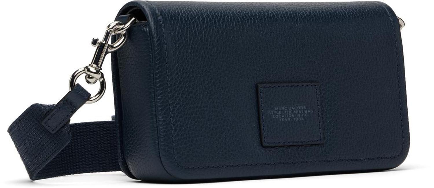 Marc Jacobs Navy 'The Leather Mini' Bag Structured grained leather shoulder bag in navy. · Adjustable and detachable logo-woven crossbody strap · Text and logo embossed at face · Logo patch at back face · Magnetic closure · Patch pocket at interior · Eight card slots · Twill lining · Logo-engraved silver-tone hardware · H4.25" x W8" x D2" Part of THE™ collection. Supplier color: Blue sea Leather. Made in Viet Nam. 251190F048119