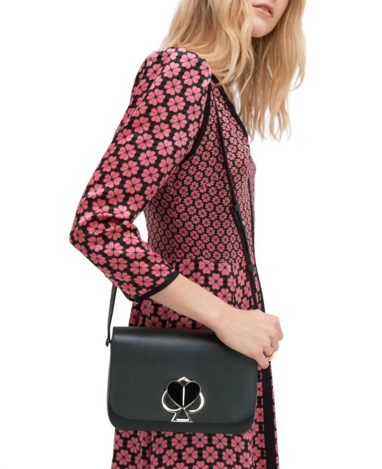• Smooth Italian leather. Faux lambskin leather lining. Spade heart twistlock closure. Interior zipper pocket. Interior slip pocket. Exterior slip pocket. Adjustable shoulder strap. Strap drop - 18.5". Dimension - 6"H x 9"W x 2.1"D