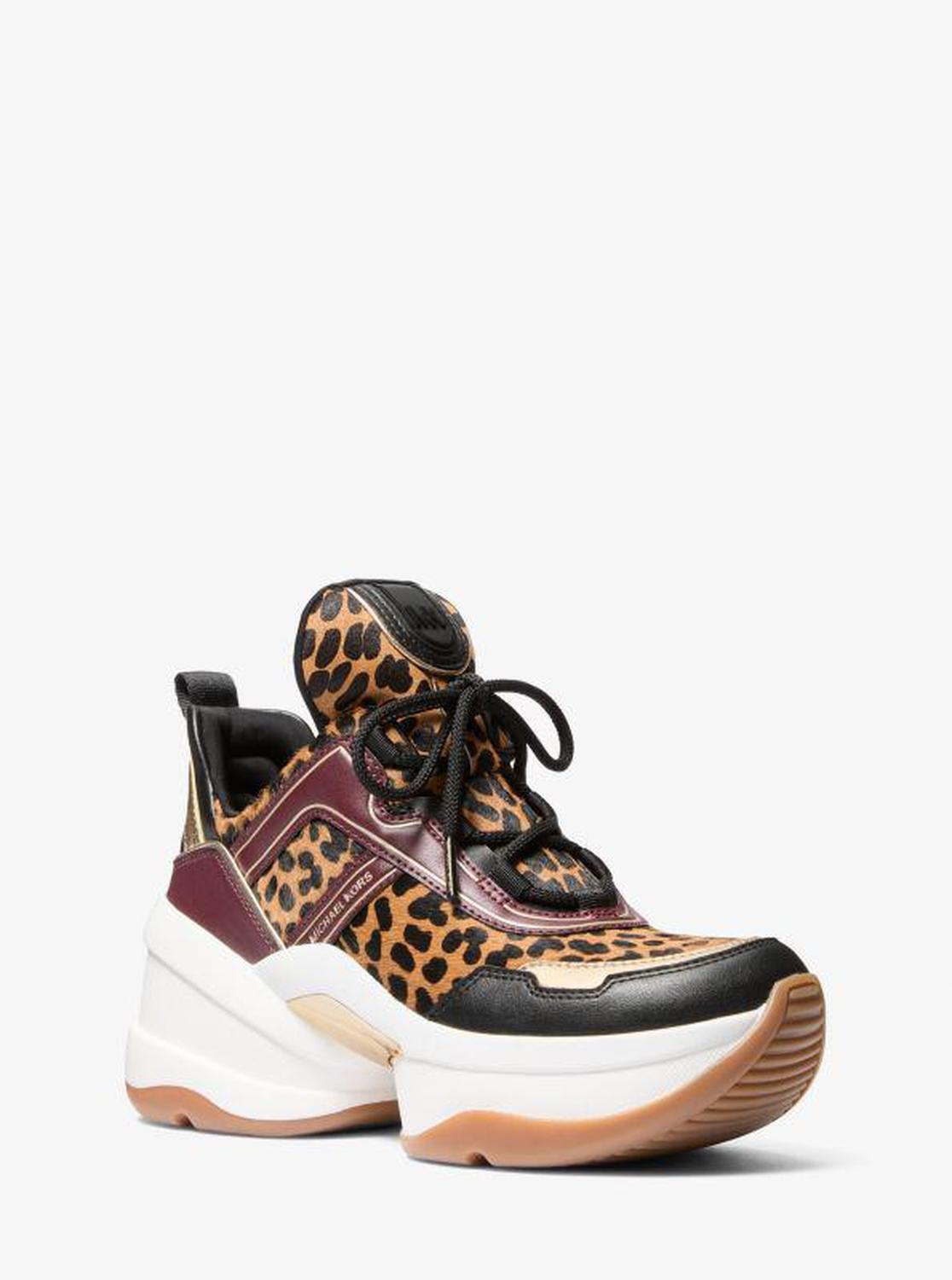 • Meet the trainer that everyone is coveting this season: the Olympia. Crafted from leopard-print calf hair with smooth and metallic accents, this fashion-forward style is elevated by a striking outsole. Wear them with a pair of joggers or counter the sporty mood with a dress.