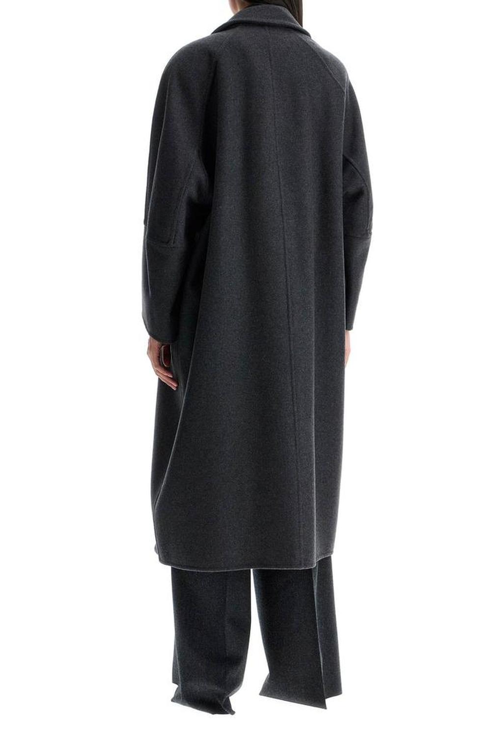 • This long coat from the Max Mara runway is characterized by a wide and cocoon silhouette, with an open design featuring raglan sleeves and a notched collar. Made of double virgin wool and cashmere fabric, it has flap pockets on the sides and tailored topstitching details. Unlined interior. The model is 177 cm tall and wears an IT size 38.