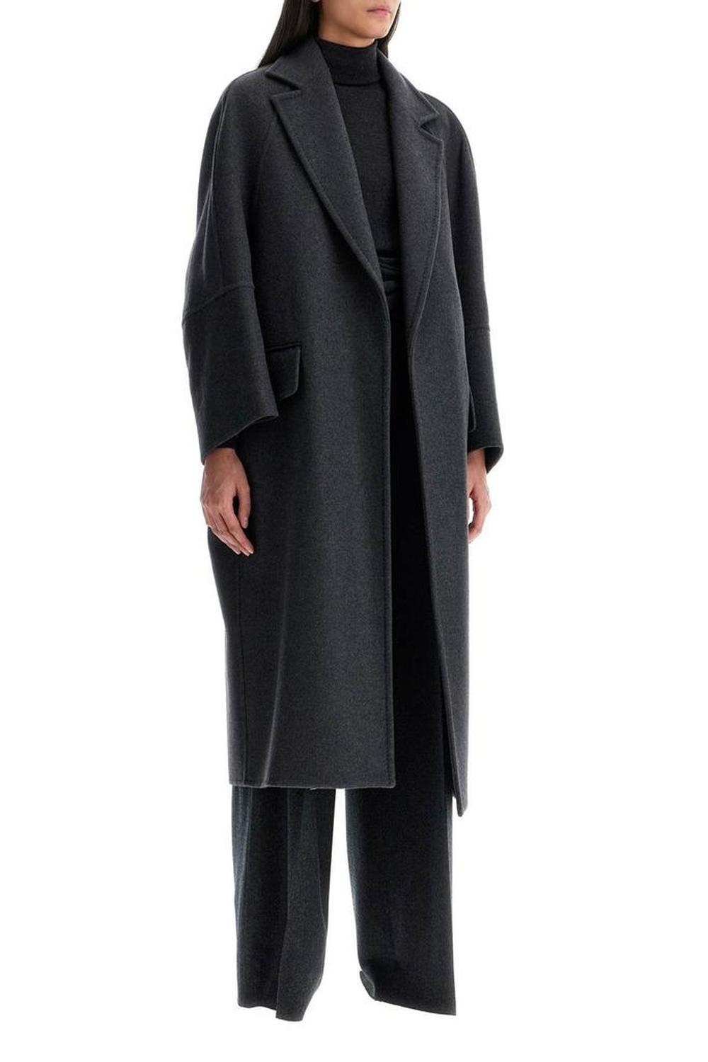 This long coat from the Max Mara runway is characterized by a wide and cocoon silhouette, with an open design featuring raglan sleeves and a notched collar. Made of double virgin wool and cashmere fabric, it has flap pockets on the sides and tailored topstitching details. Unlined interior. The model is 177 cm tall and wears an IT size 38.