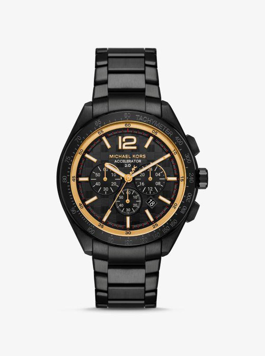 • Meet the Accelerator 2.0. Made from black-tone stainless steel, this oversized style encourages you to go for bold. A contrast bezel frames the sporty face, which features sleek hour markers, a date dial and chronograph details.
