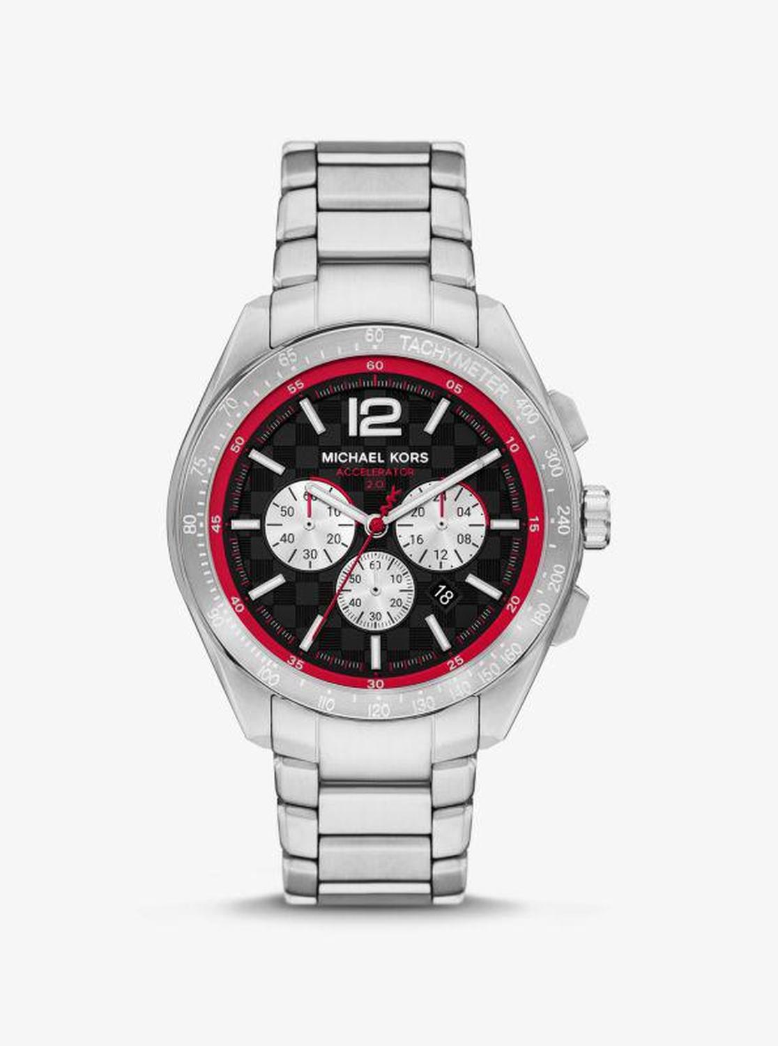 • Meet the Accelerator 2.0. Made from silver-tone stainless steel, this oversized style encourages you to go for the bold. A red-trimmed bezel frames the sporty face, which features sleek hour markers, a date dial and chronograph details.