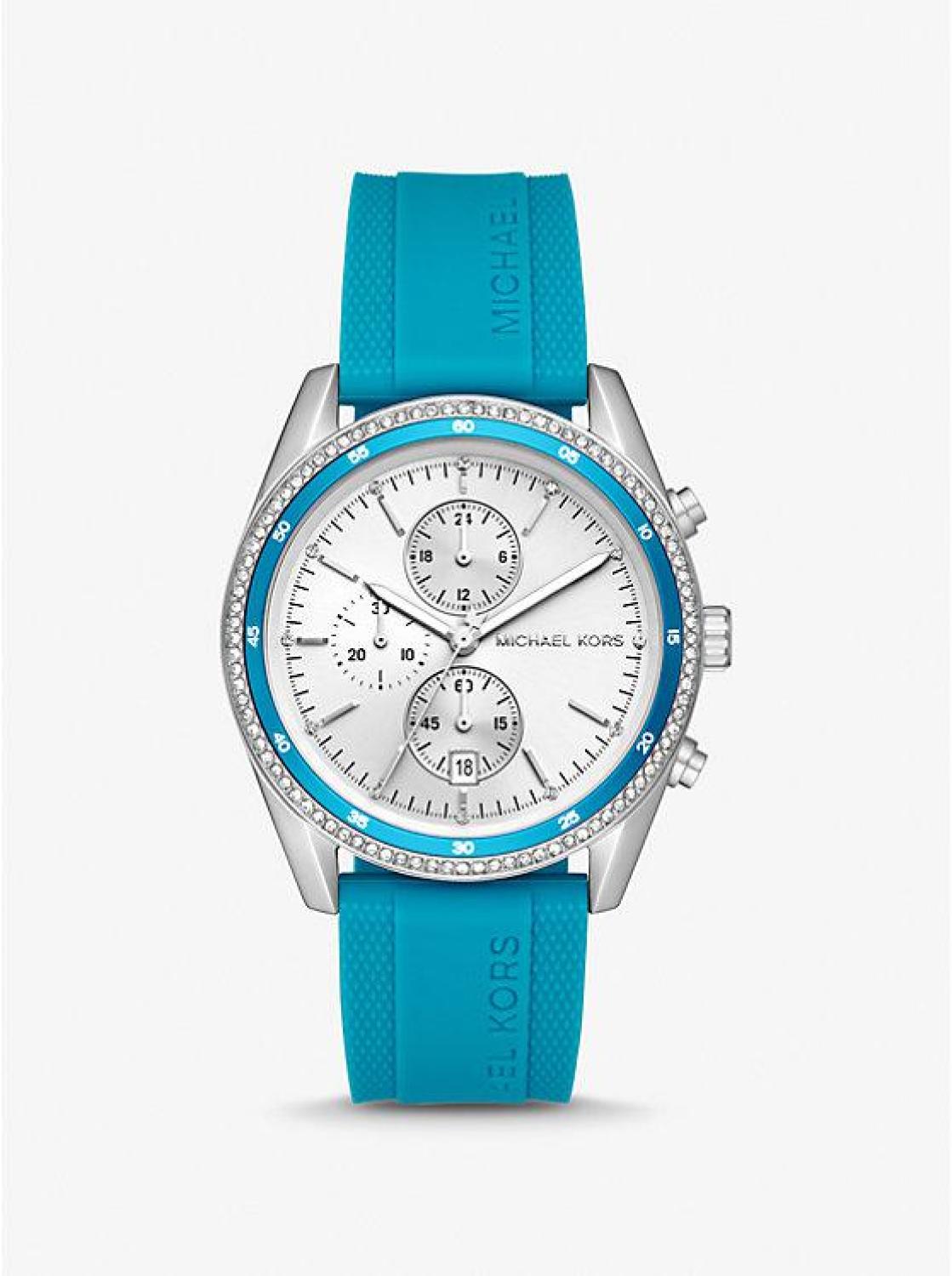• Style meets class with the Hadyn watch. Crafted from silver-tone stainless steel, this oversized timepiece features a sparkling pavé topring and chronograph dial for accurate timekeeping. Slip on the comfortable silicone strap for effortless all-day wear.