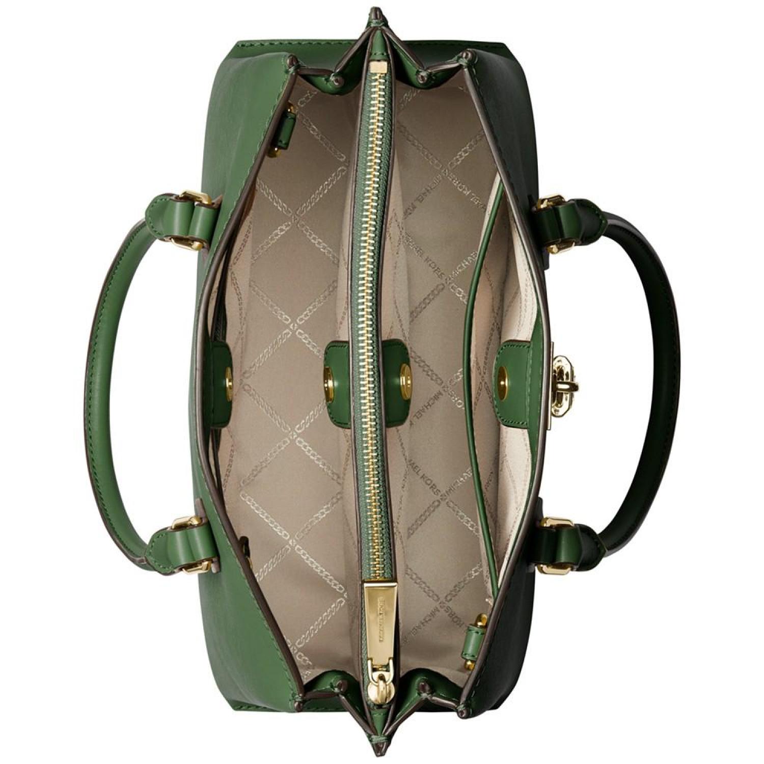Perfectly refining your everyday attire, the Ruby Medium Leather Satchel by MICHAEL Michael Kors is a welcome wardrobe staple that compliments any outfit. Medium sized bag; 12"W x 9"H x 5-3/4"D (width is measured across the bottom of handbag); 1.55 lbs. approx. weight Silhouette is based off 5'9" model 5"L handles; 23-1/2"L adjustable strap Snap closure Gold-tone hardware Double compartment interior with center zip compartment & zip & slip pockets Leather; lining: polyester; trim: polyurethane, cotton, polyester Spot clean Imported