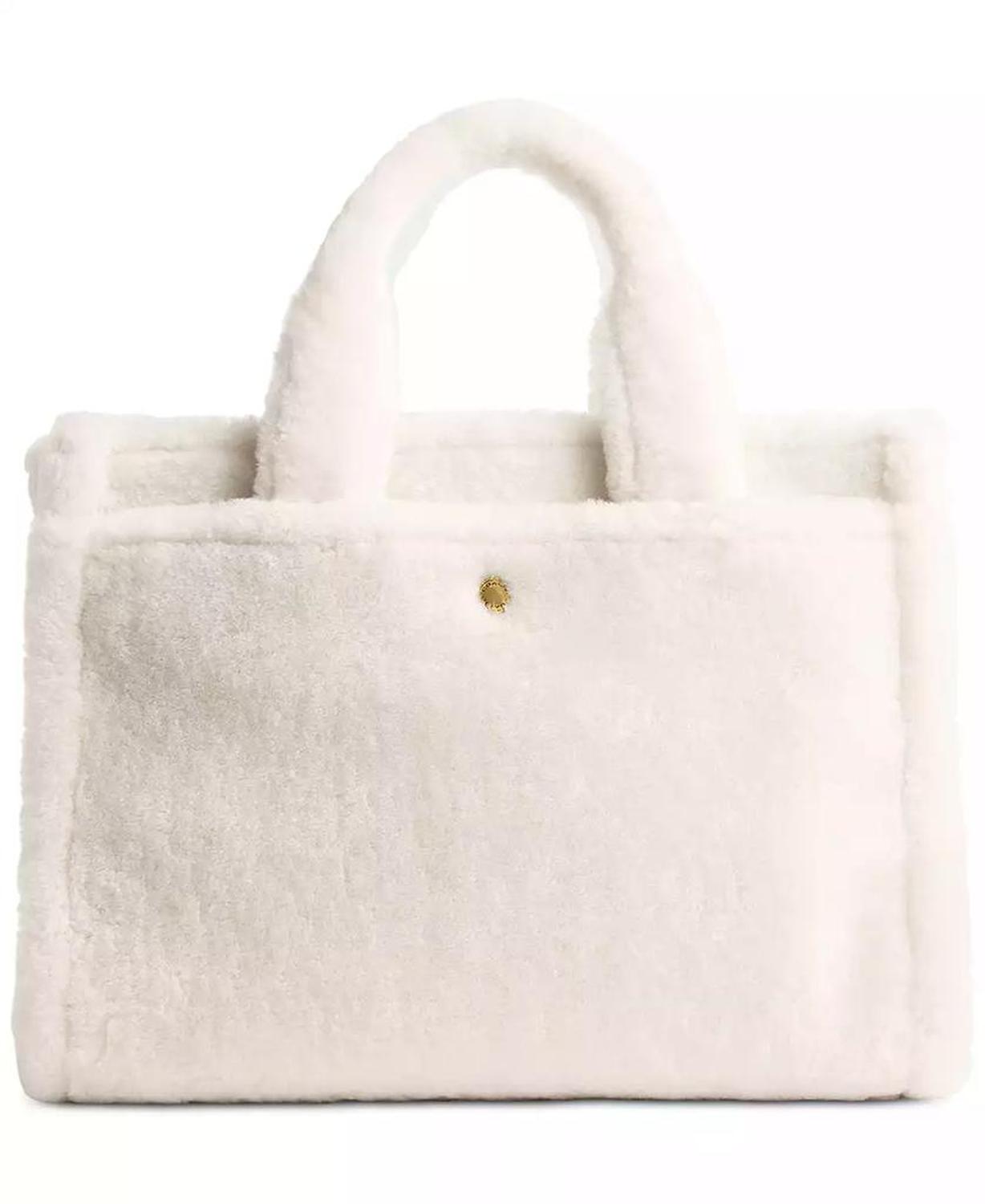• Plush shearling is accented with an embroidered logo and iconic luggage tag, defining this tote by COACH.