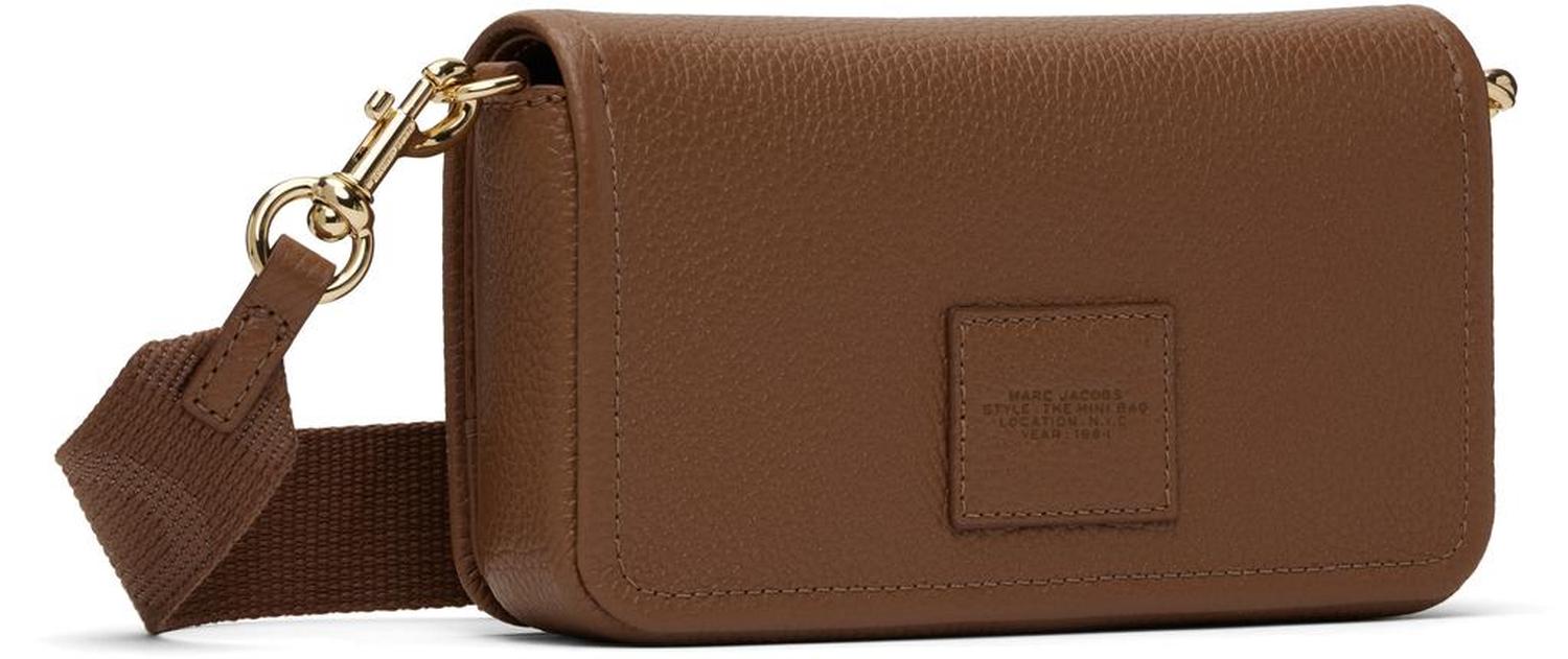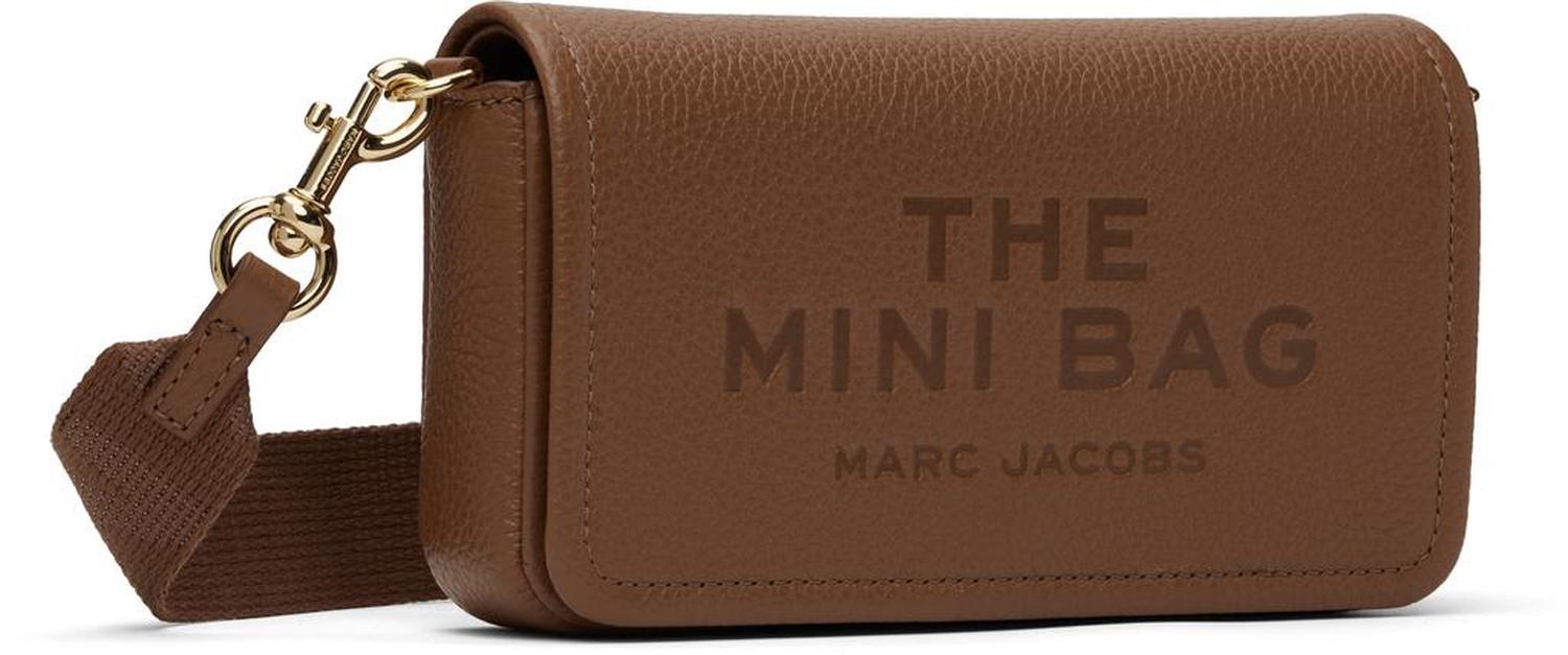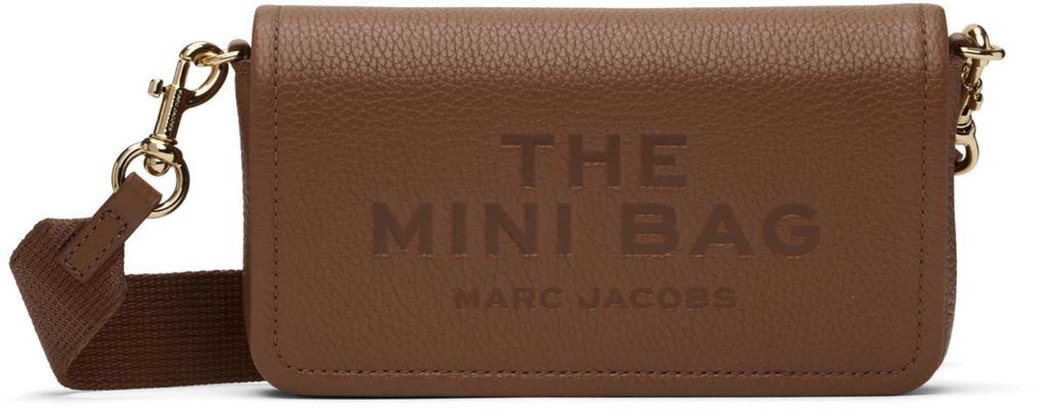 Marc Jacobs Tan 'The Leather Mini' Bag Structured grained leather shoulder bag in tan. · Adjustable and detachable logo-woven crossbody strap · Text and logo embossed at face · Logo patch at back face · Magnetic closure · Patch pocket at interior · Eight card slots · Twill lining · Logo-engraved silver-tone hardware · H4.25" x W8" x D2" Part of THE™ collection. Supplier color: Argan oil Leather. Made in Viet Nam. 251190F048122