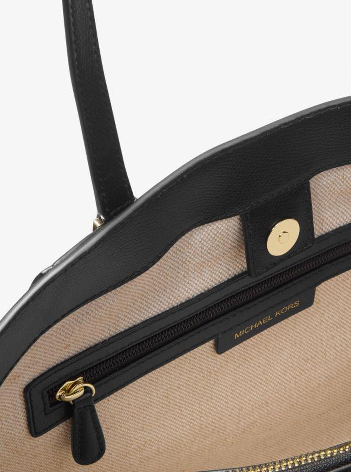 • The Taryn tote is a polished staple for workdays, weekends, and every moment in between. Crafted from our leopard-print calf hair with leather trim, this structured bag features trapeze stitching and a detachable lock charm. It unzips to reveal a spacious interior, complete with side pockets and a center compartment for your tablet or valuables.