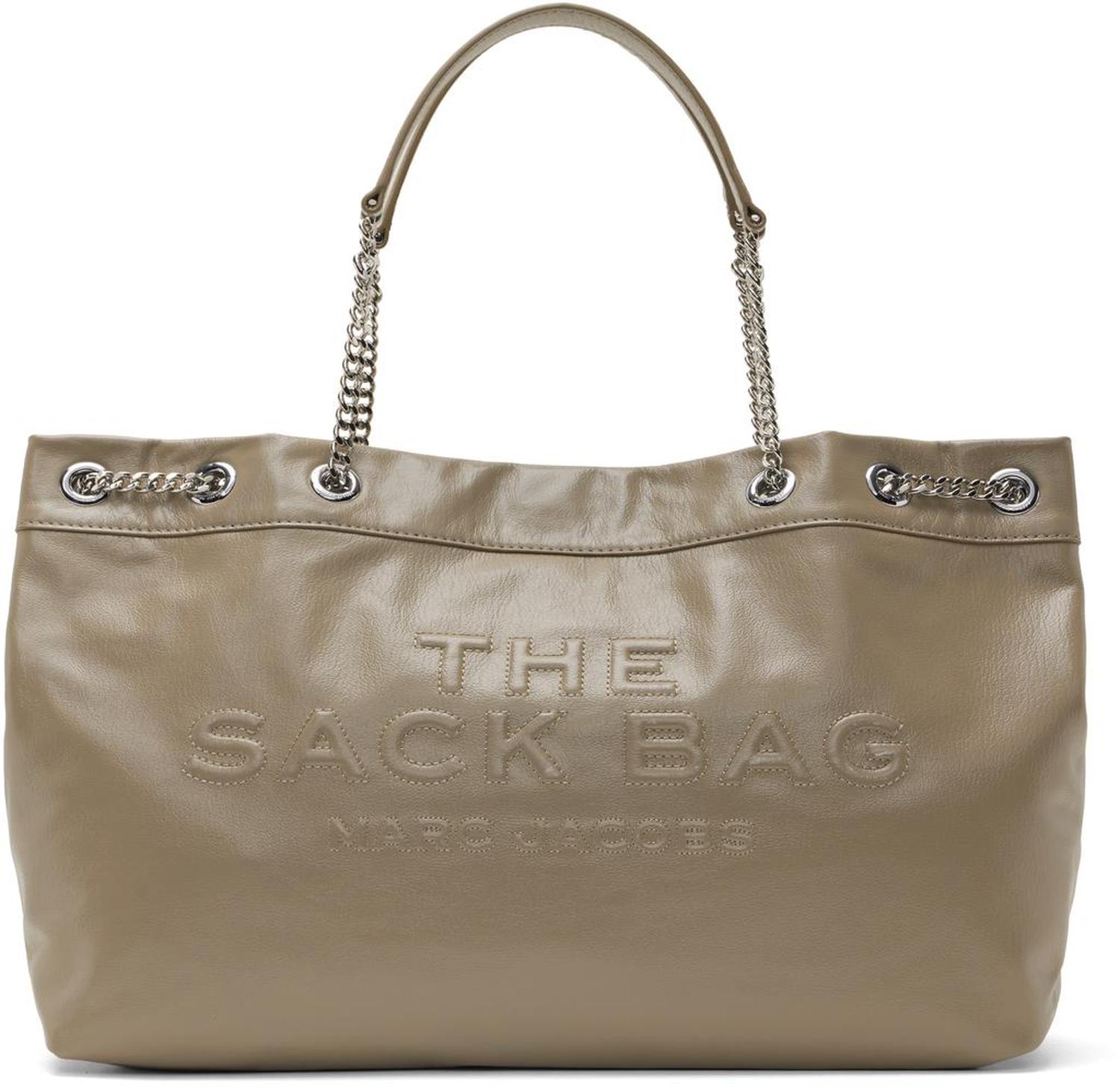 Marc Jacobs Taupe 'The Large Chain Sack' Bag Grained leather shoulder bag in taupe. · Sliding curb chain shoulder straps · Text and logo embossed at face · Logo patch at back face · Magnetic closure · Zip and patch pockets at interior · Faille lining · H11" x W18" x D5.5" Supplier color: Cement Leather. Made in Viet Nam. 251190F048110