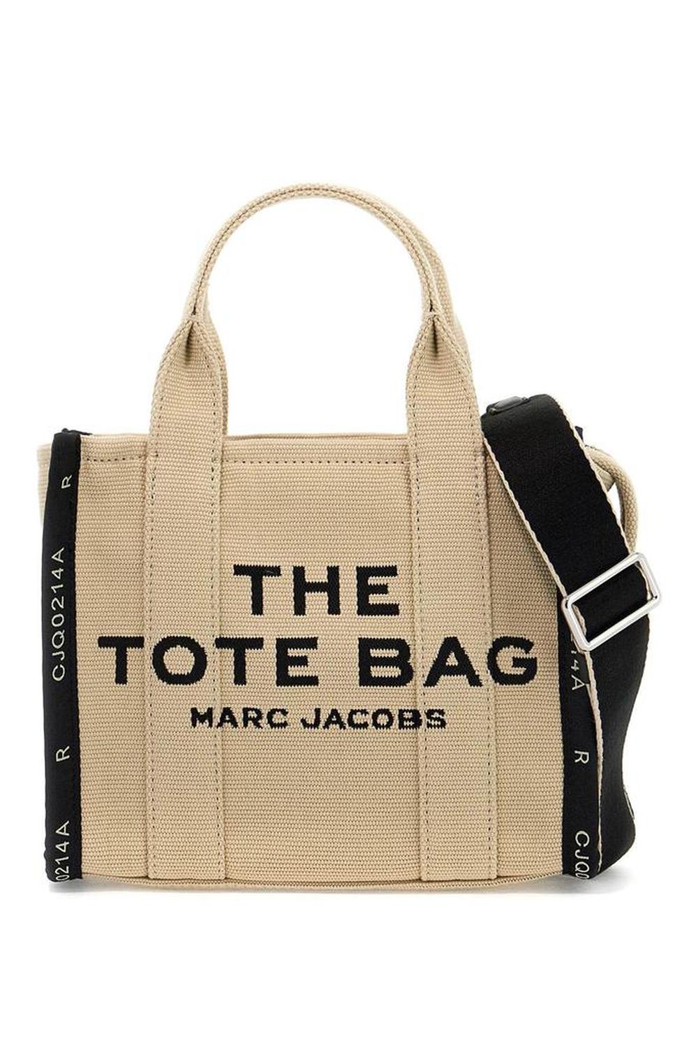 The Jacquard Small Tote Bag by Marc Jacobs in cotton-blend canvas, featuring double top handle, adjustable and removable shoulder strap, front contrasting jacquard logo, rear fabric logo patch, zip closure and side handle. Unlined interior with a fabric open flat pocket. Silver-finished metalware.