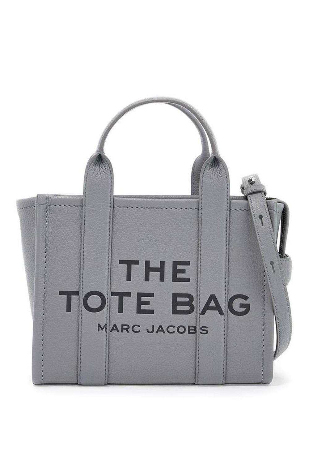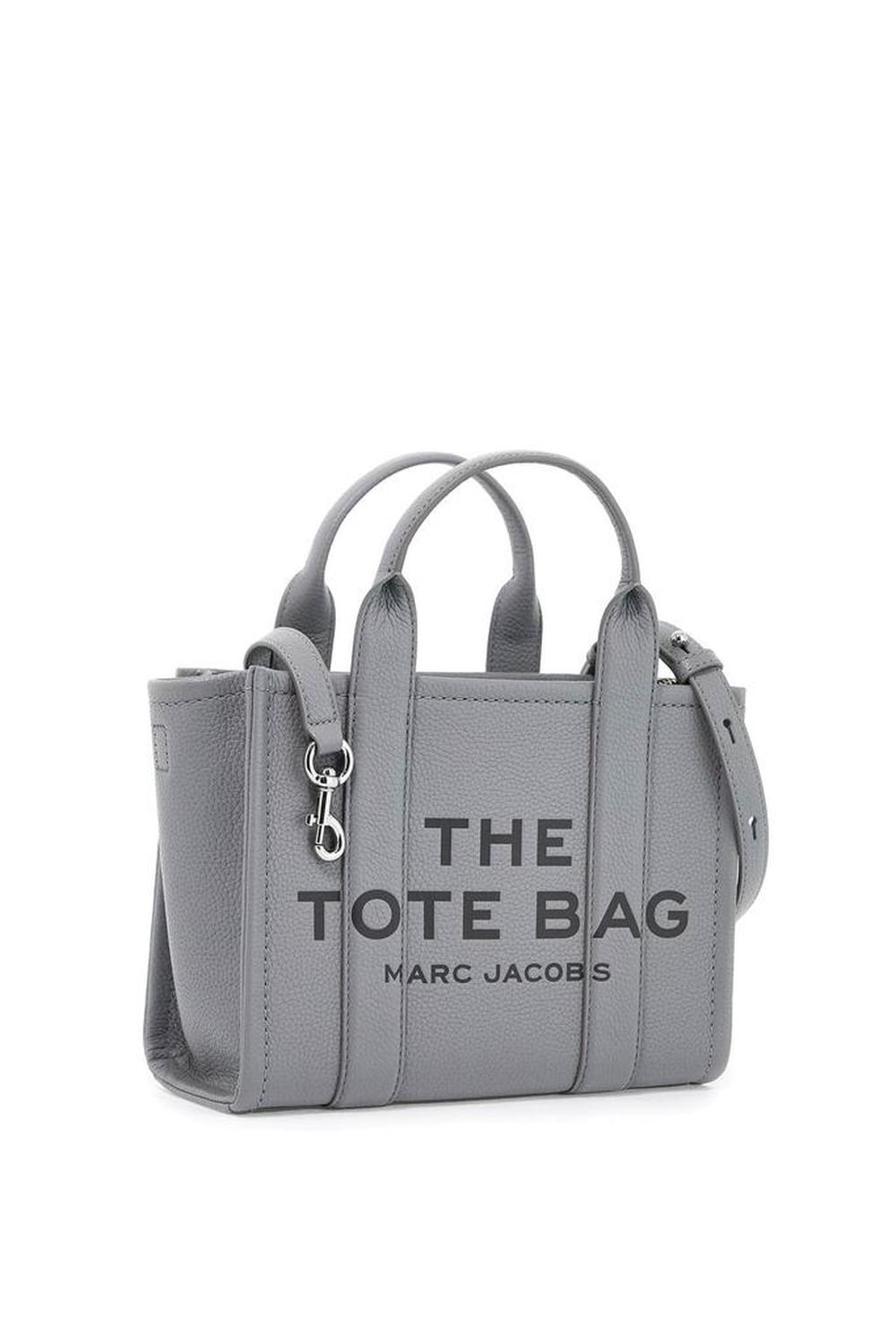 The Leather Small Tote Bag by Marc Jacobs in grained leather featuring double top handle, adjustable and removable shoulder strap, front debossed logo and back leather logo patch. It features zip closure, side handle, unlined interior with a fabric open flat pocket and a leather credit card slot. Silver-finished metalware.