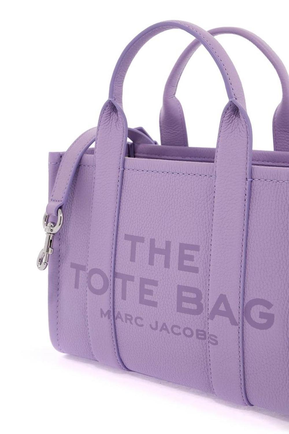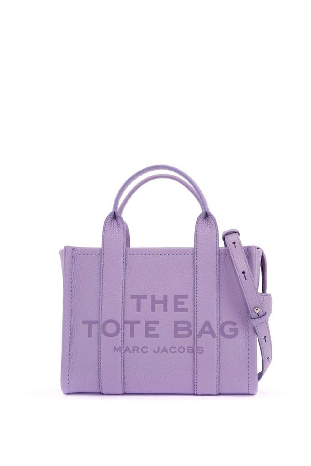The Leather Small Tote Bag by Marc Jacobs in grained leather, featuring double top handle, adjustable and removable shoulder strap, front debossed logo, back leather logo patch, zip closure and side handle. Leather interior with a fabric open flat pocket. Silver-finished metalware.