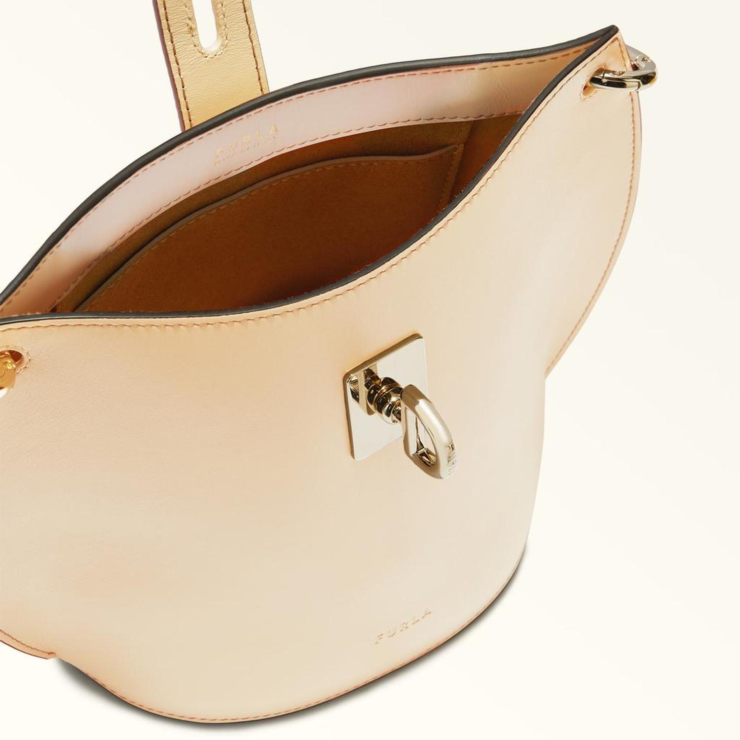 • This Unica Furla mini crossbody is a unique design inspired by the bucket bag, with its rounded shape and soft, curved sides. Styled in soft and smooth calf leather, it is bound to become your faithful everyday companion, and attract attention with its understated look. Ideal for carrying your personal belongings with its rigid bottom, it can be worn crossbody or on the shoulder.